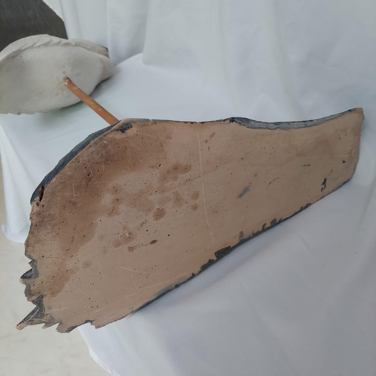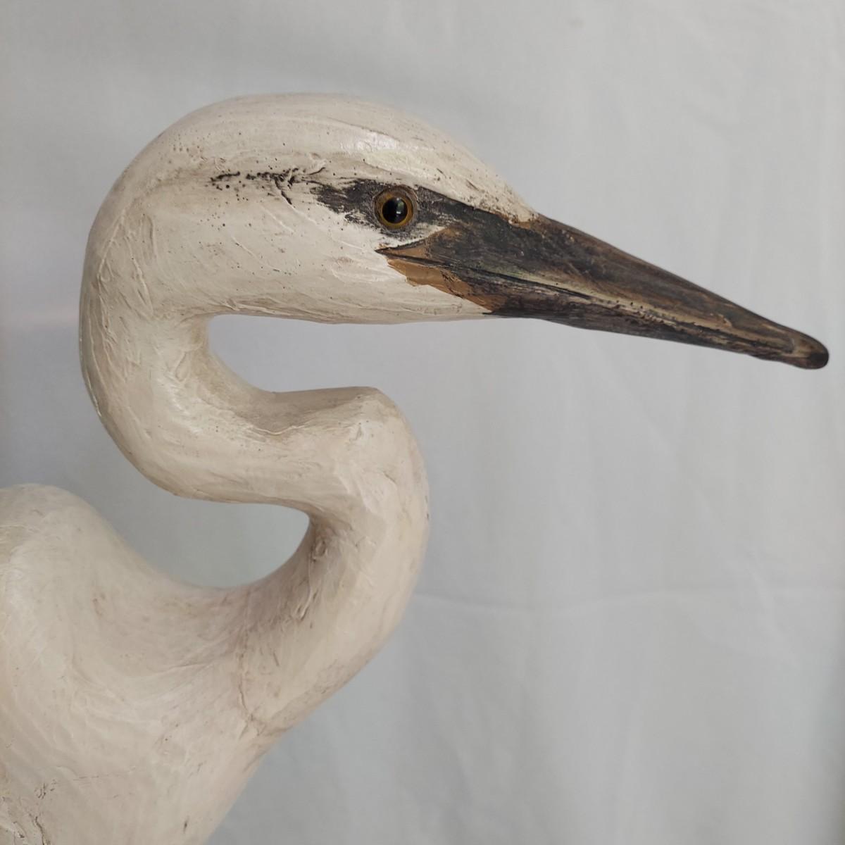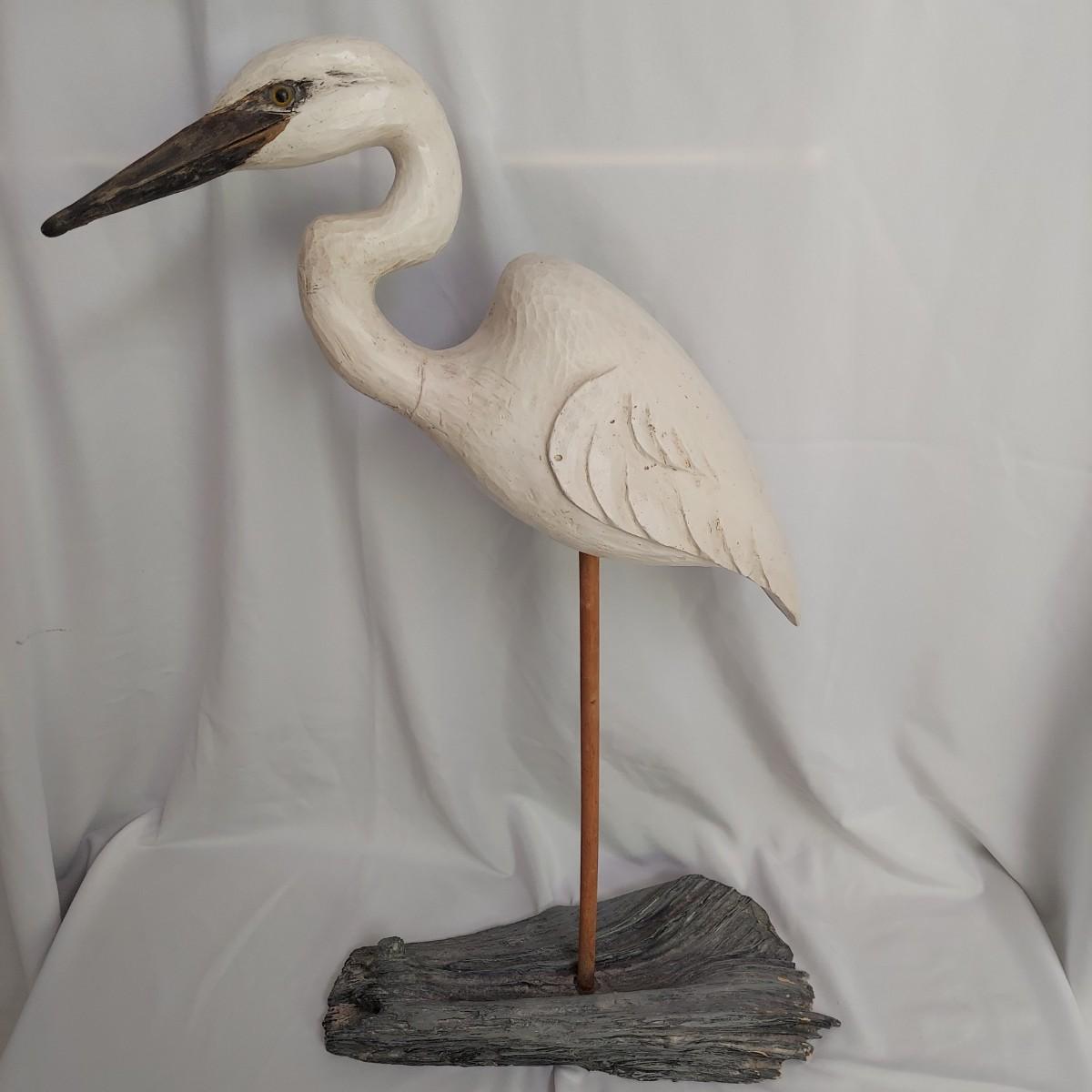 Large carved wooden water bird. Appears to be an egret. Could be a crane or heron. Measures approximately 23" x 9" x 34"H. Carved from an unknown soft wood with hardwood dowel rod support. Local Pickup Only.