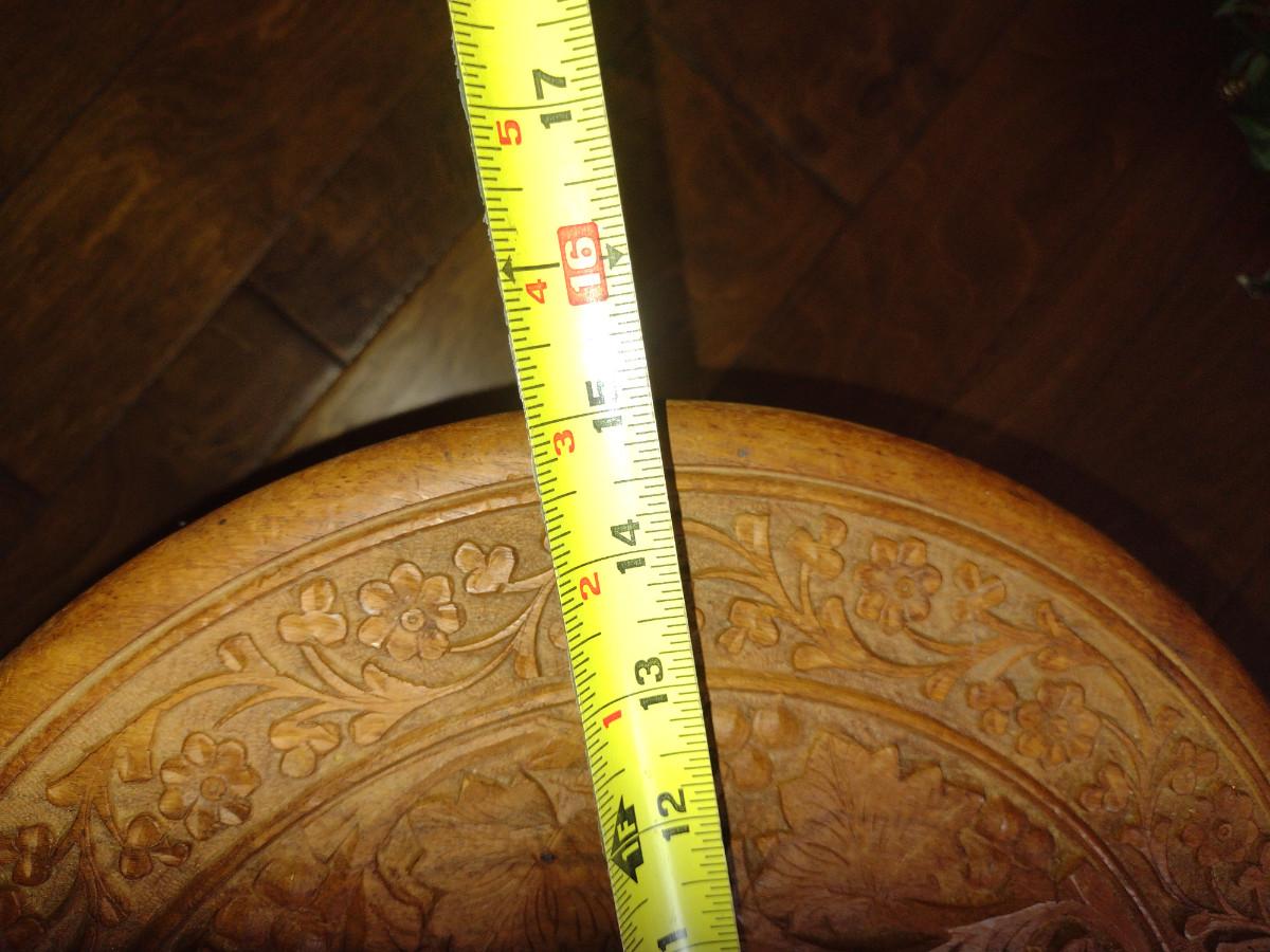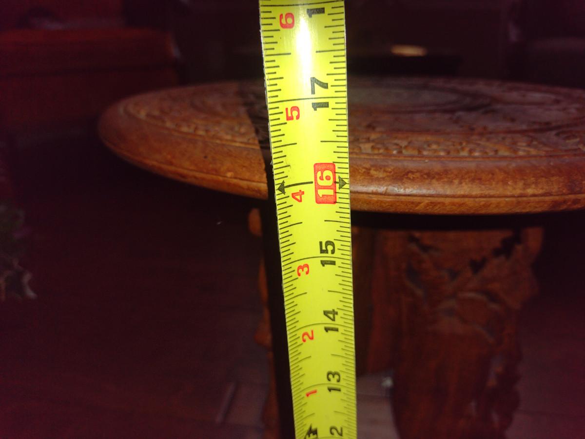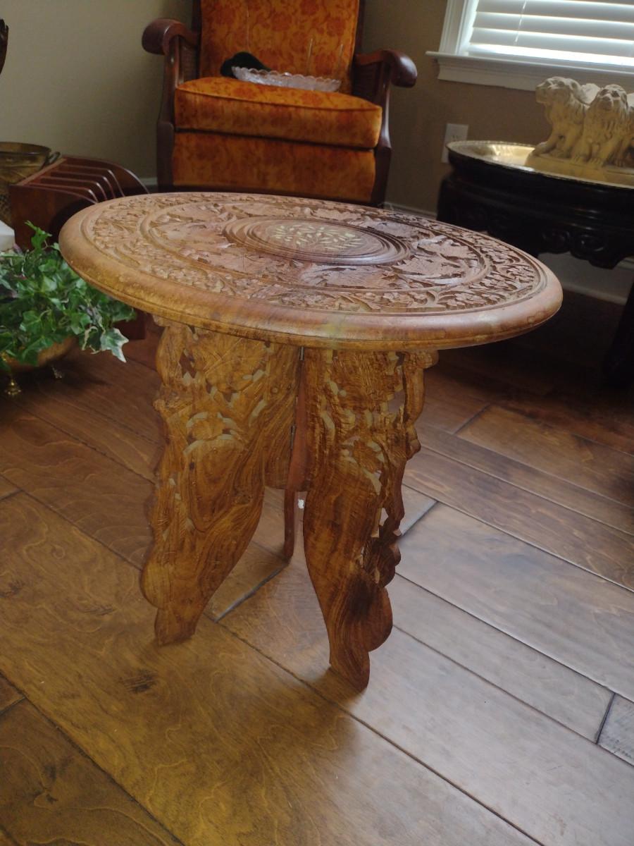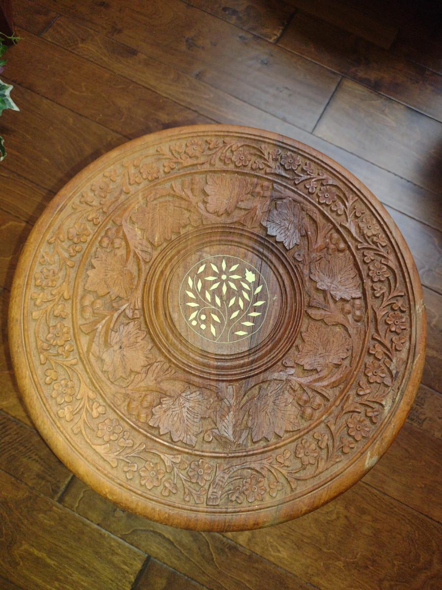 Carved Wooden Side Table with Inlay Design- Approx 15" in Diameter, 16 1/4" Tall
