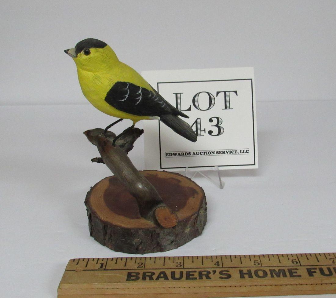 Carved Yellow Finch Figurine, Signed on Bottom, I Think Resin on Wood Base