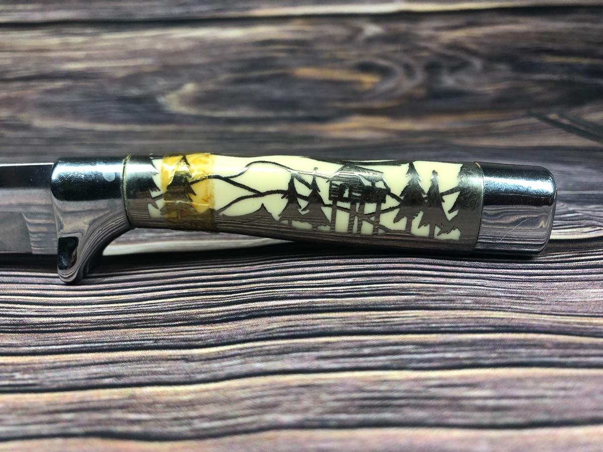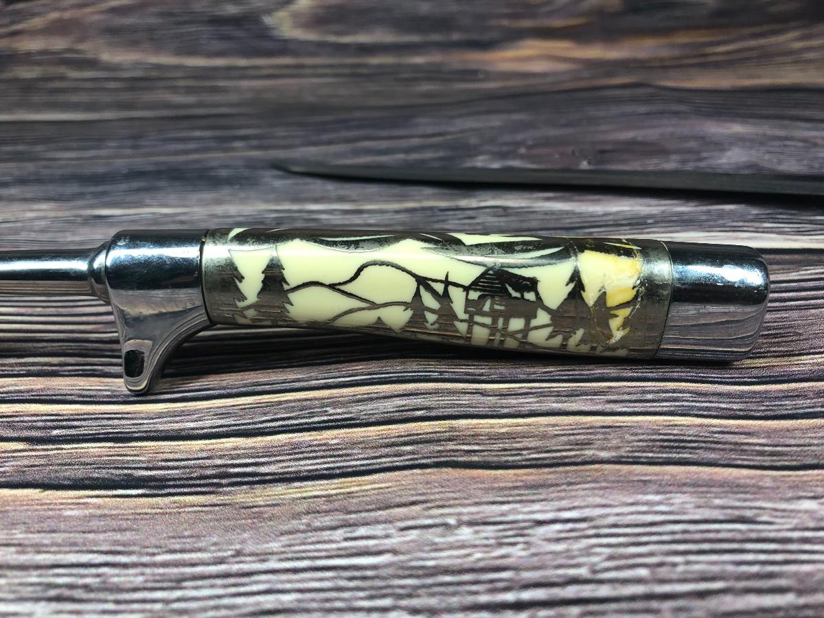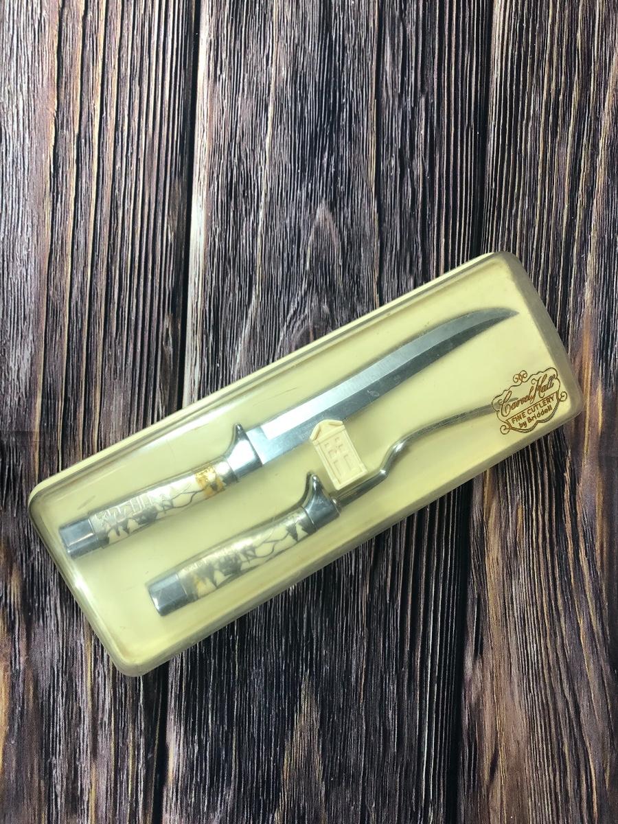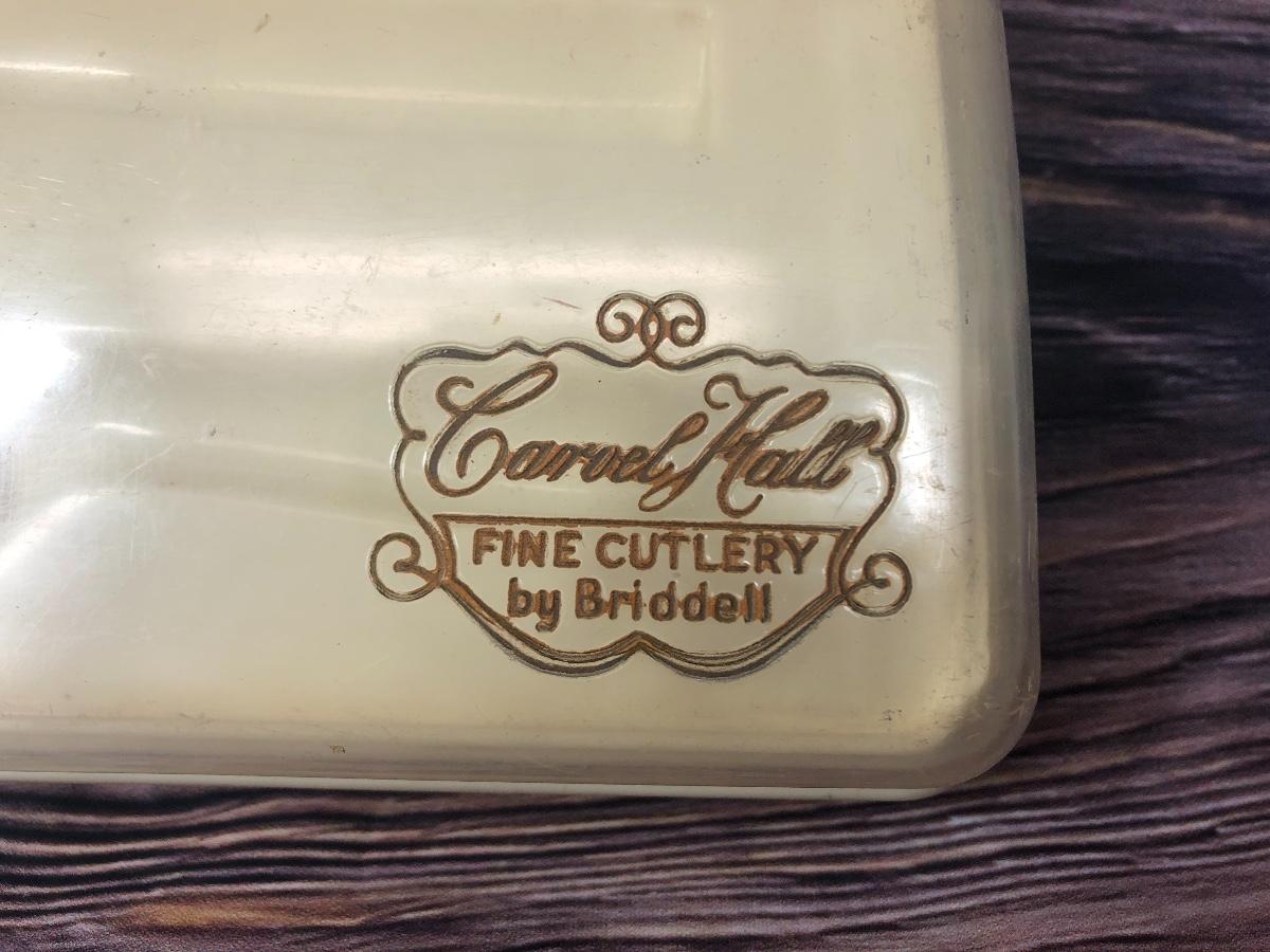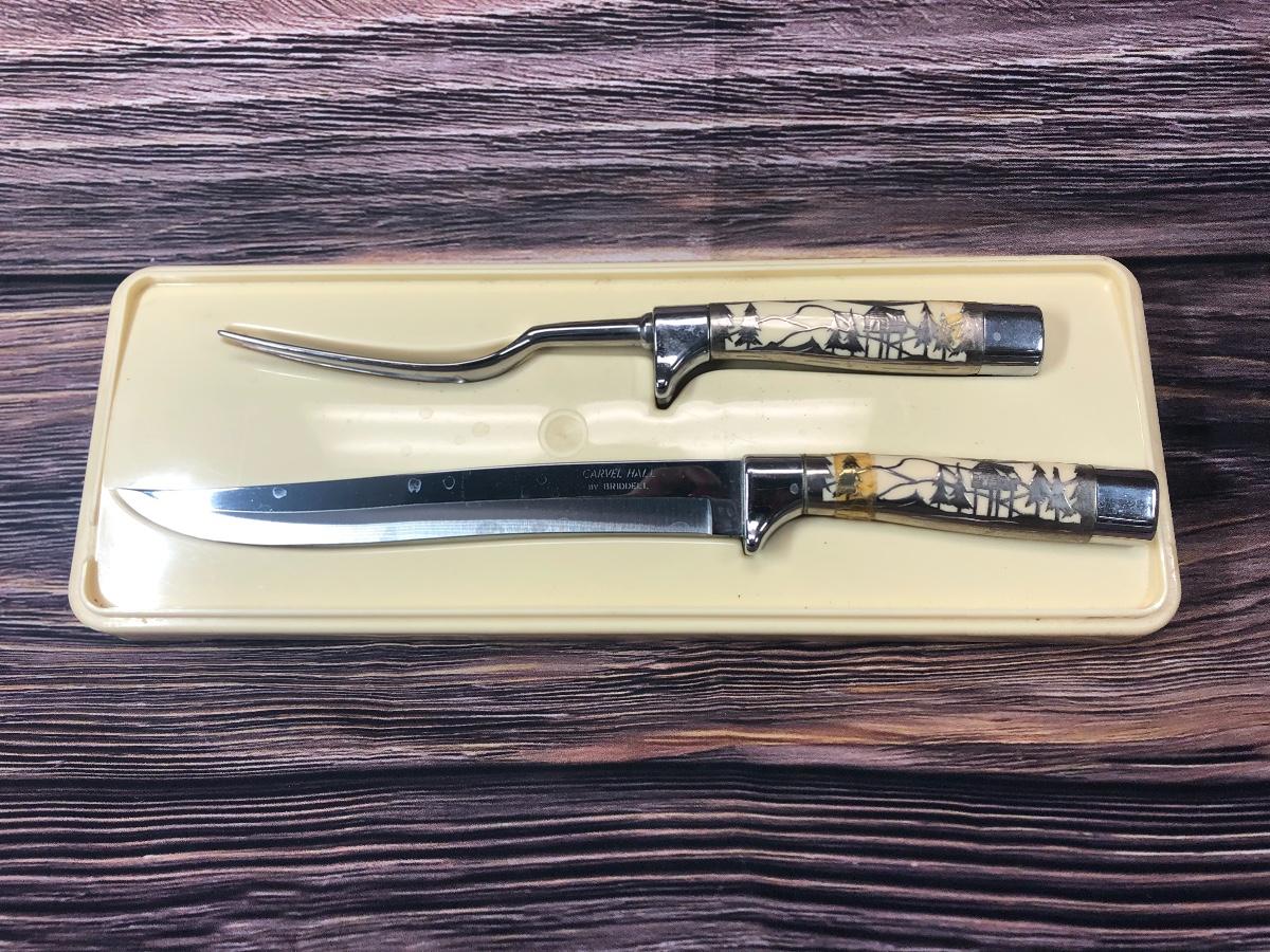 Stainless steel carving set with plastic case. There is some wear on the case. The bottom of the case reads: “Chas. D. Briddell, Inc Fine Quality Cutlery Crisfield, Maryland Case No. 62”