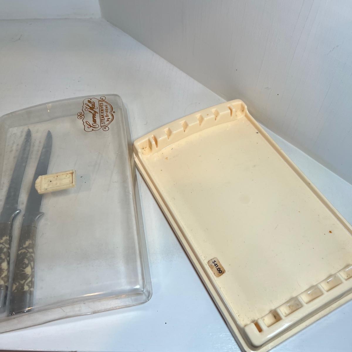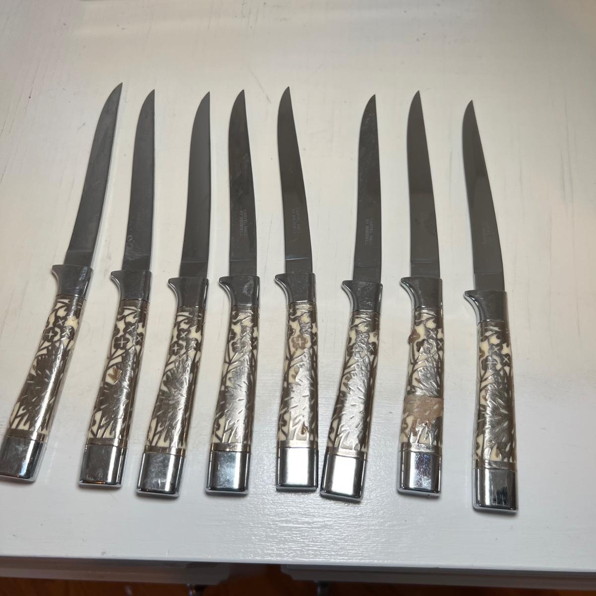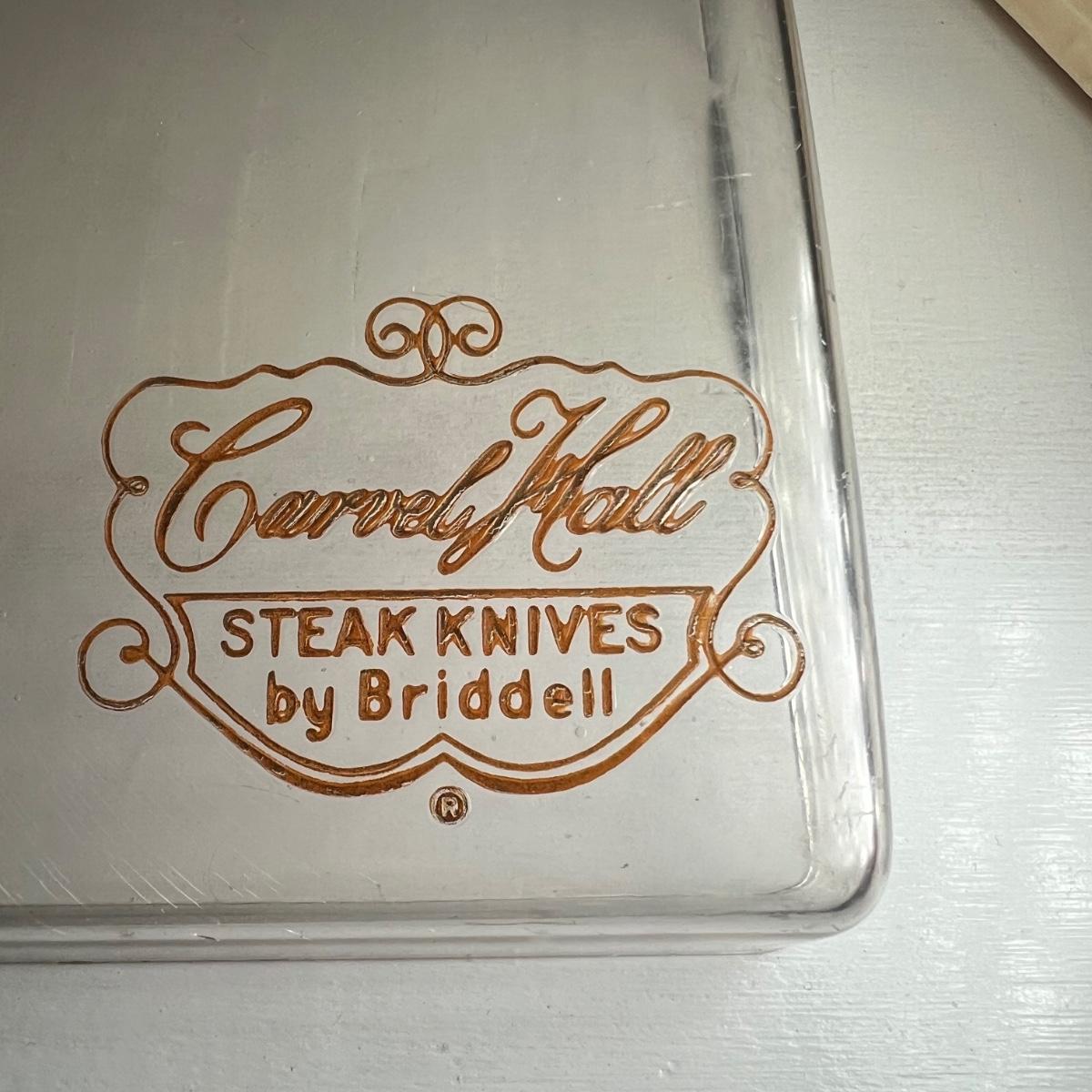 A set of vintage steak knives in this lot that has what appears to be a thin metal embossed covering over the knife handles. Note that one knife is missing some of this metal, see image. Stainless steel blades are stamped Carvel Hall by Briddell as is the plastic original storage box.