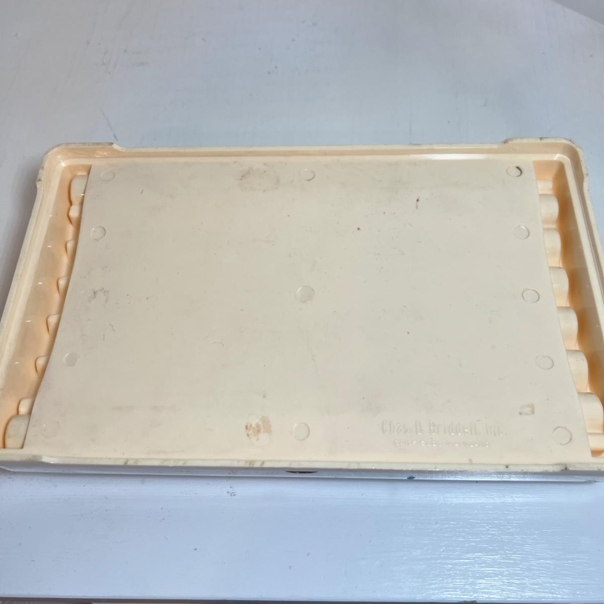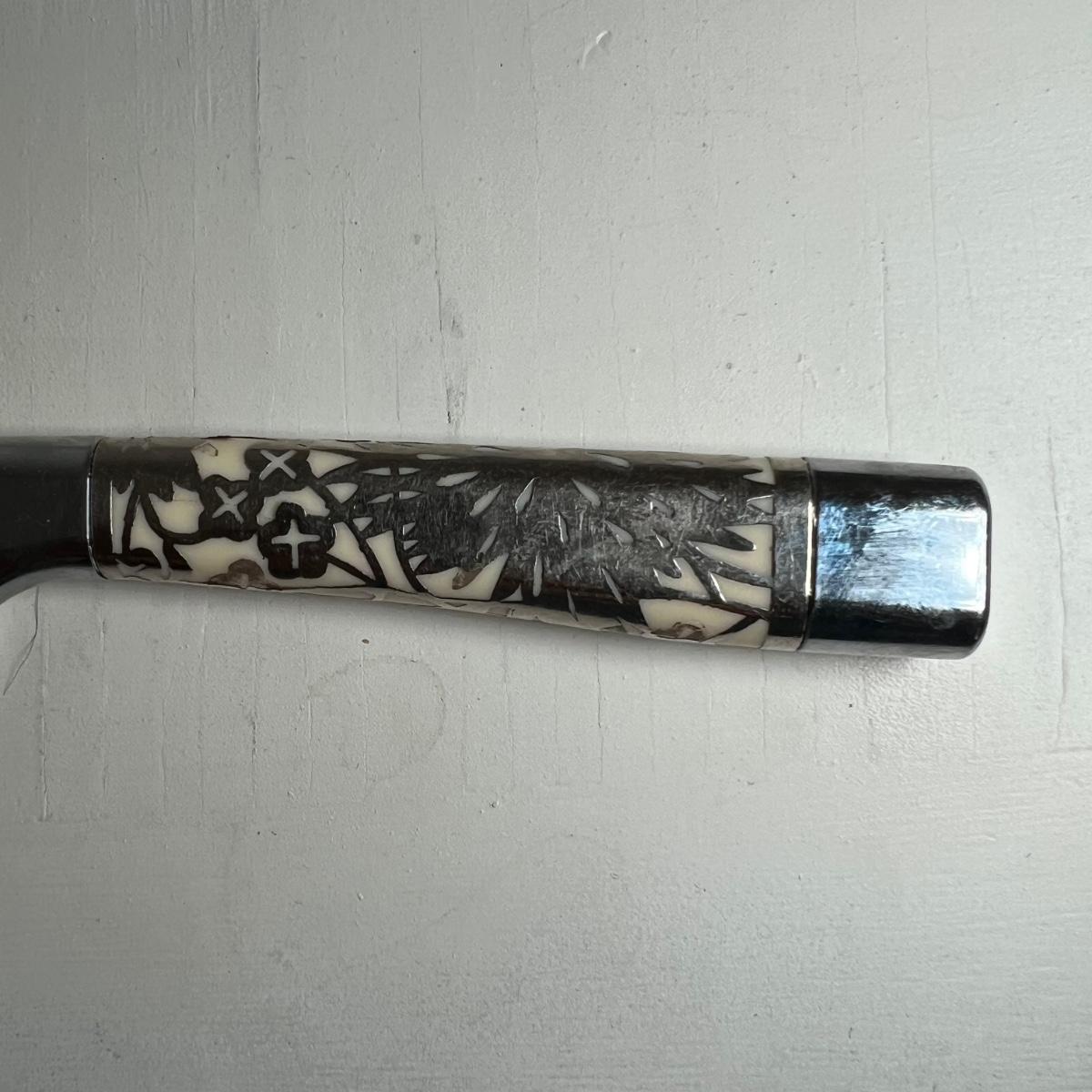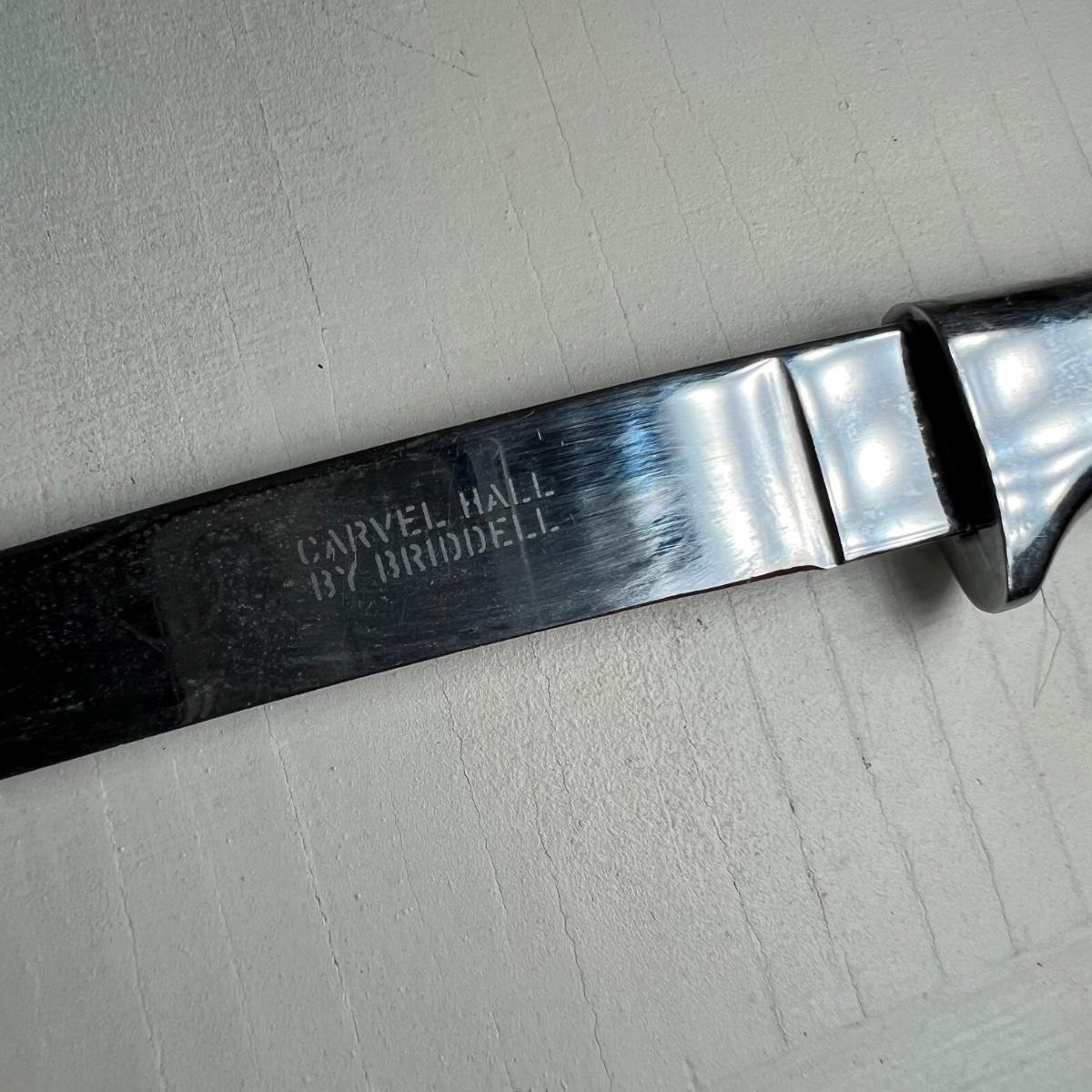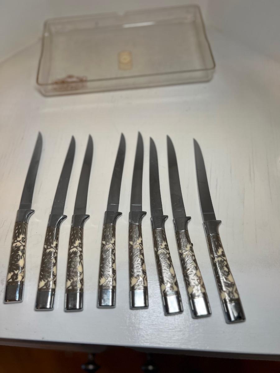 A set of vintage steak knives in this lot that has what appears to be a thin metal embossed covering over the knife handles. Note that one knife is missing some of this metal, see image. Stainless steel blades are stamped Carvel Hall by Briddell as is the plastic original storage box.