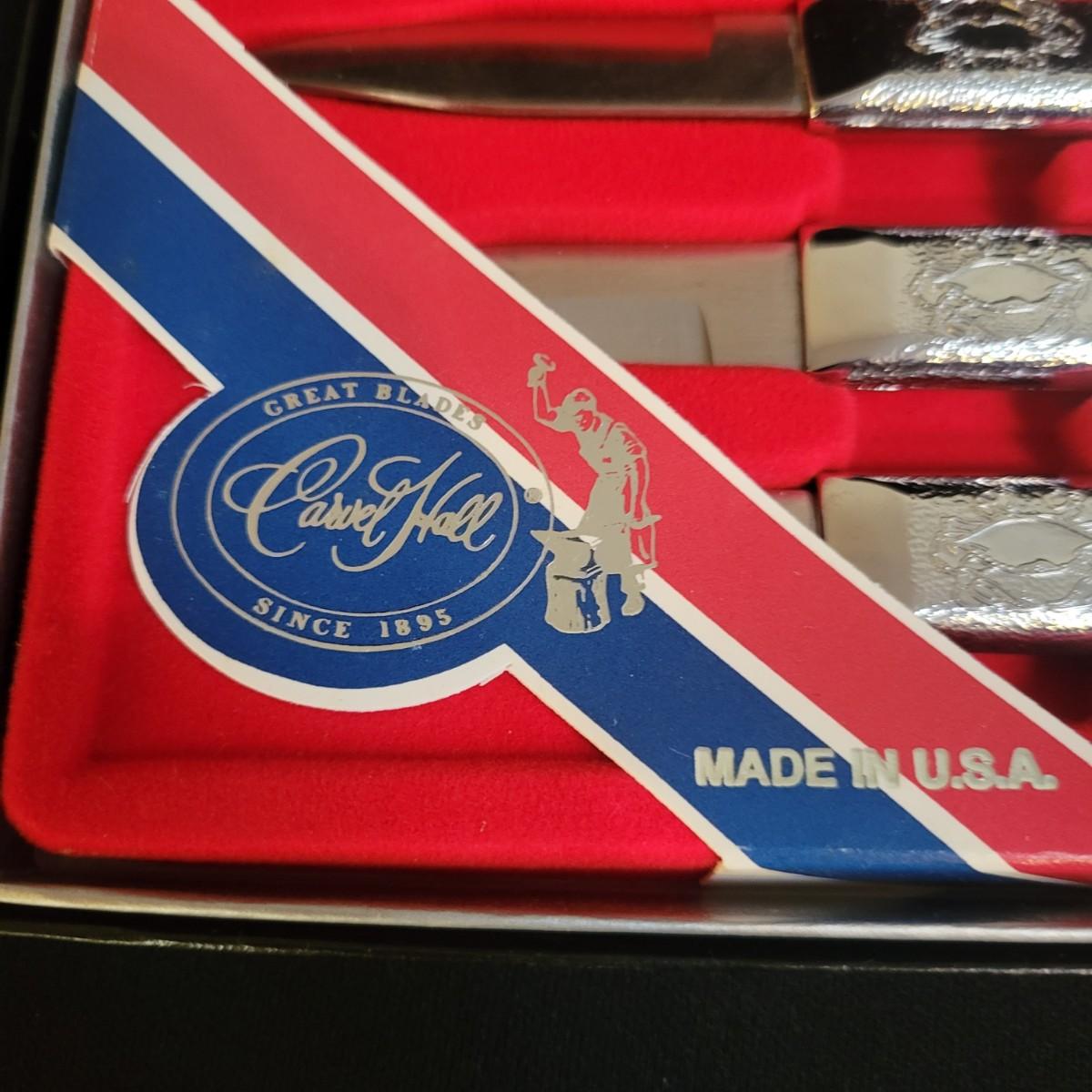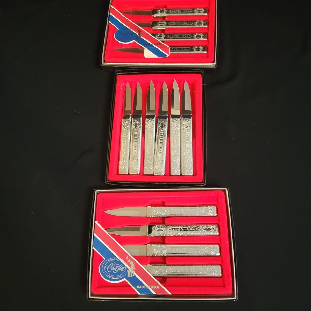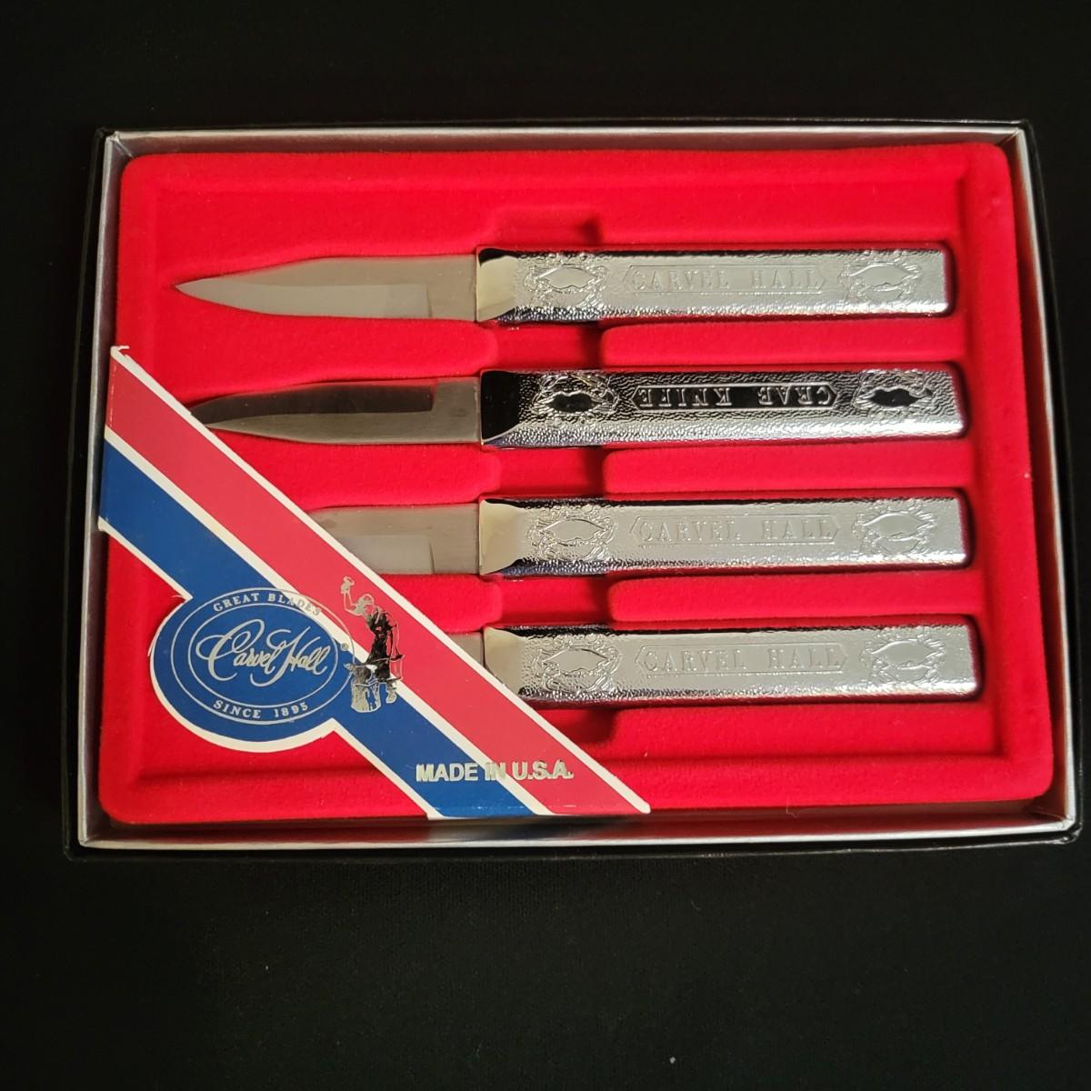 A collection of 14 Carvell Hall crab knives. Each knife measures approximately 6" in length and are made of stainless steel. Shipping available