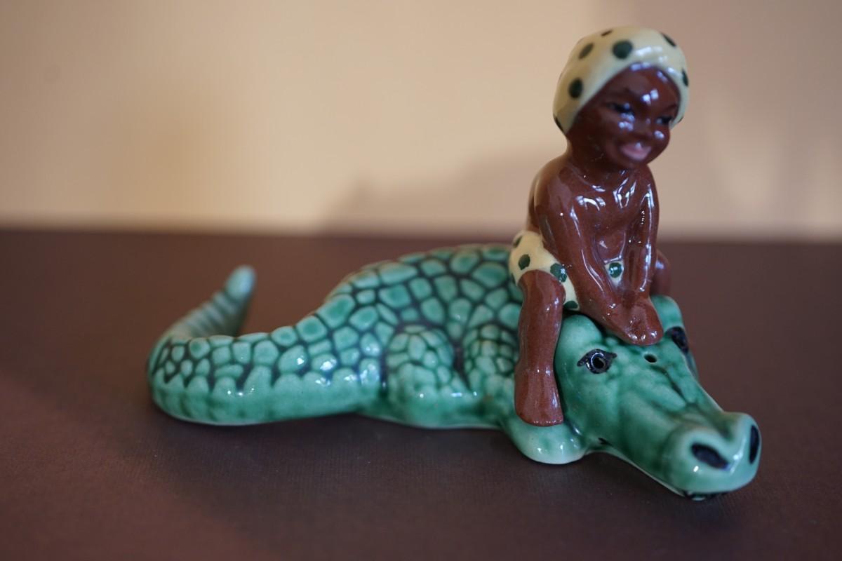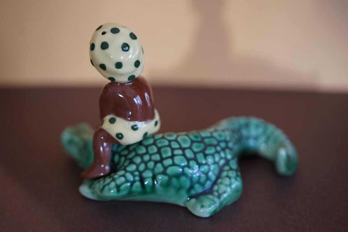 CERAMIC ARTS STUDIO MADISON, WI. BOY ON ALIGATOR. SALT AND PEPPER