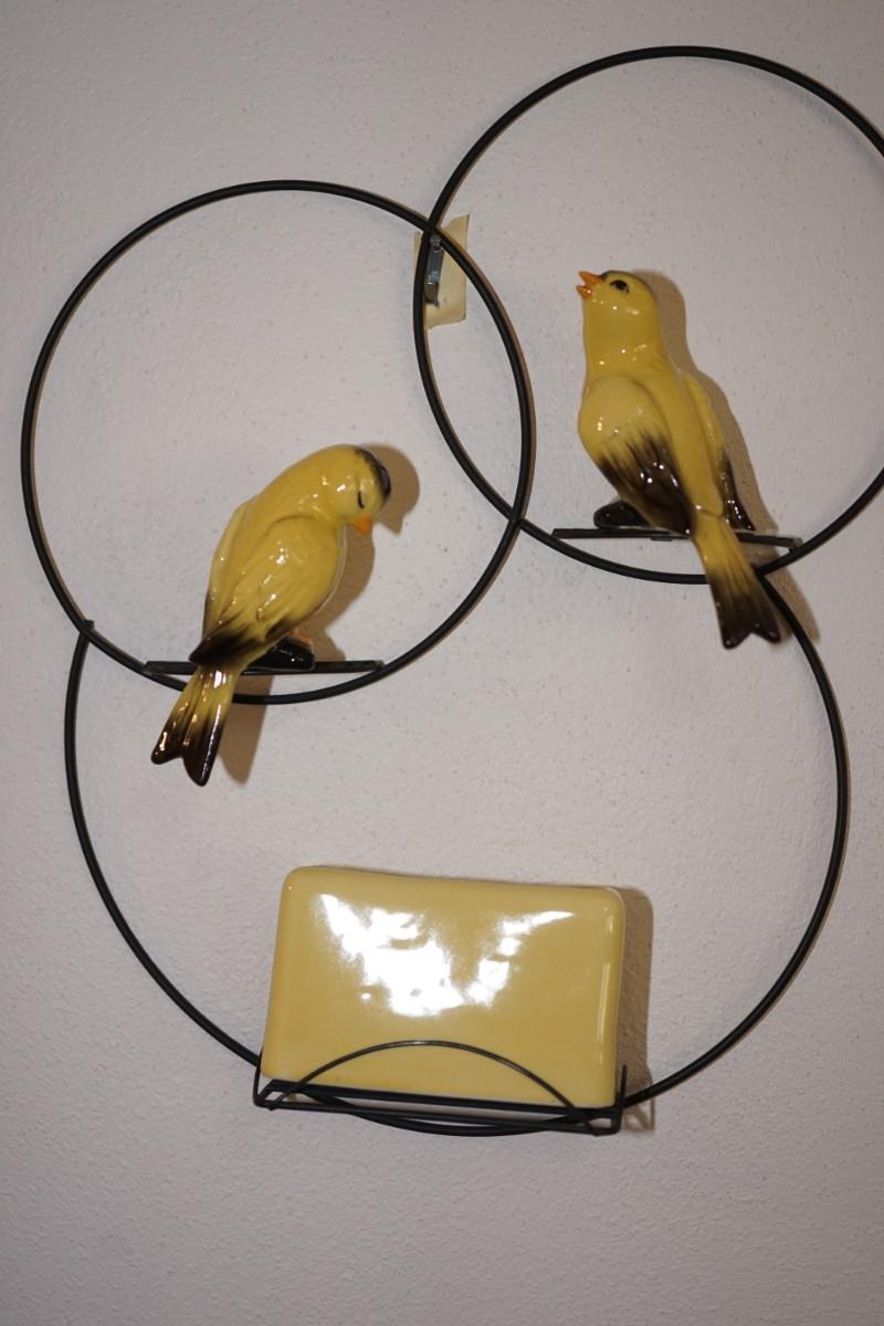 CERAMIC ARTS STUDIO MADISON, WI. TWO CANARIES /RECTANGLE SHAPED PLANTER. ON WIRE HANGER