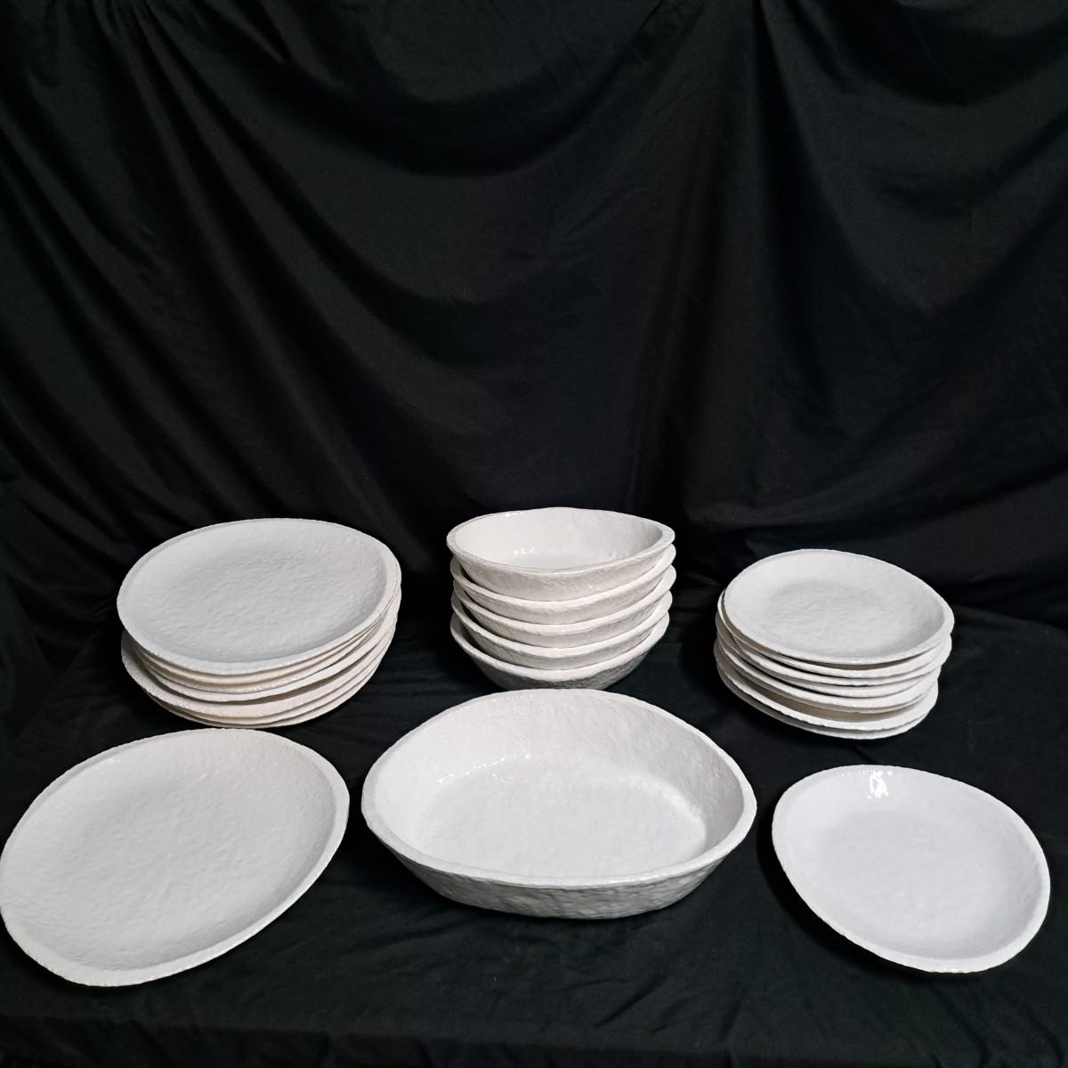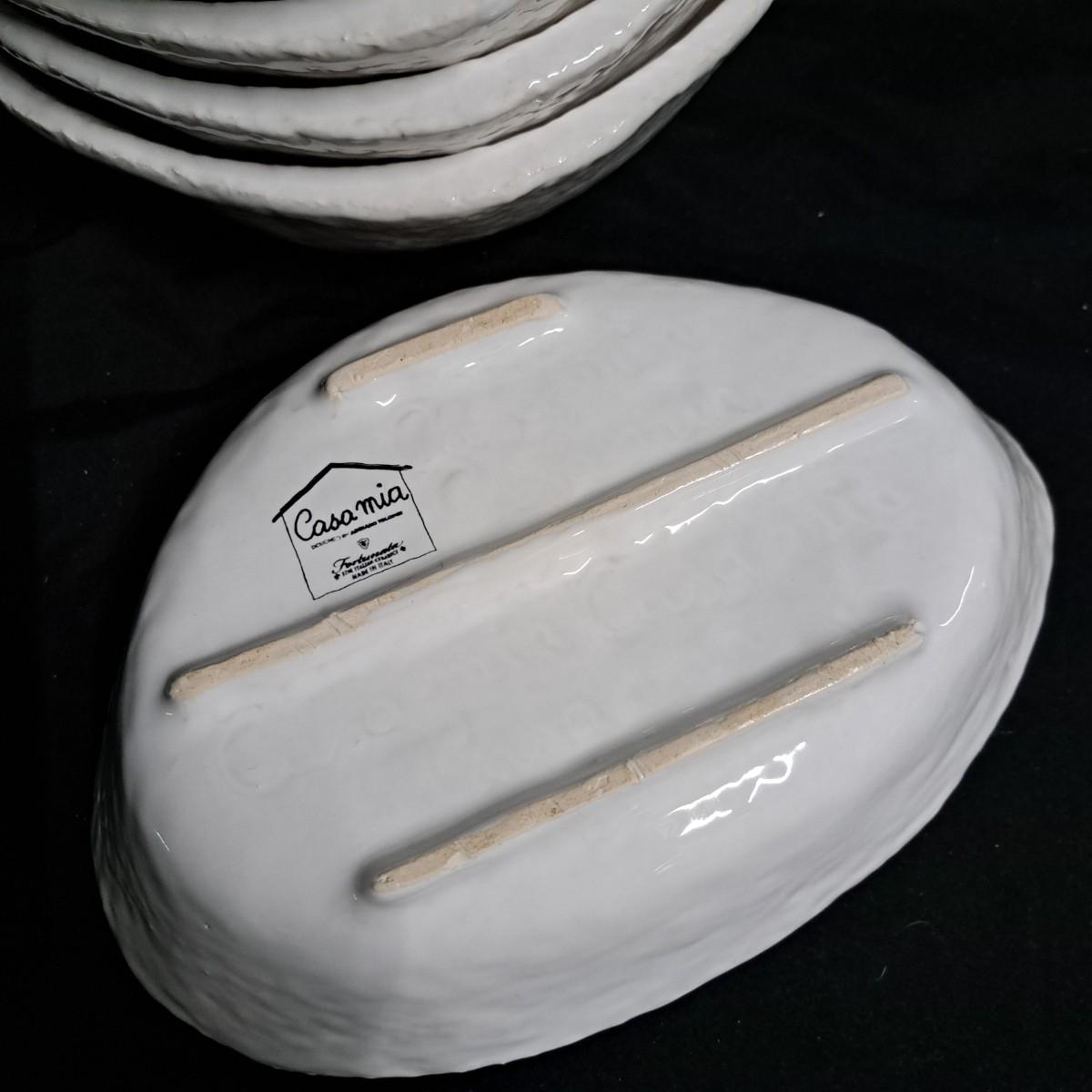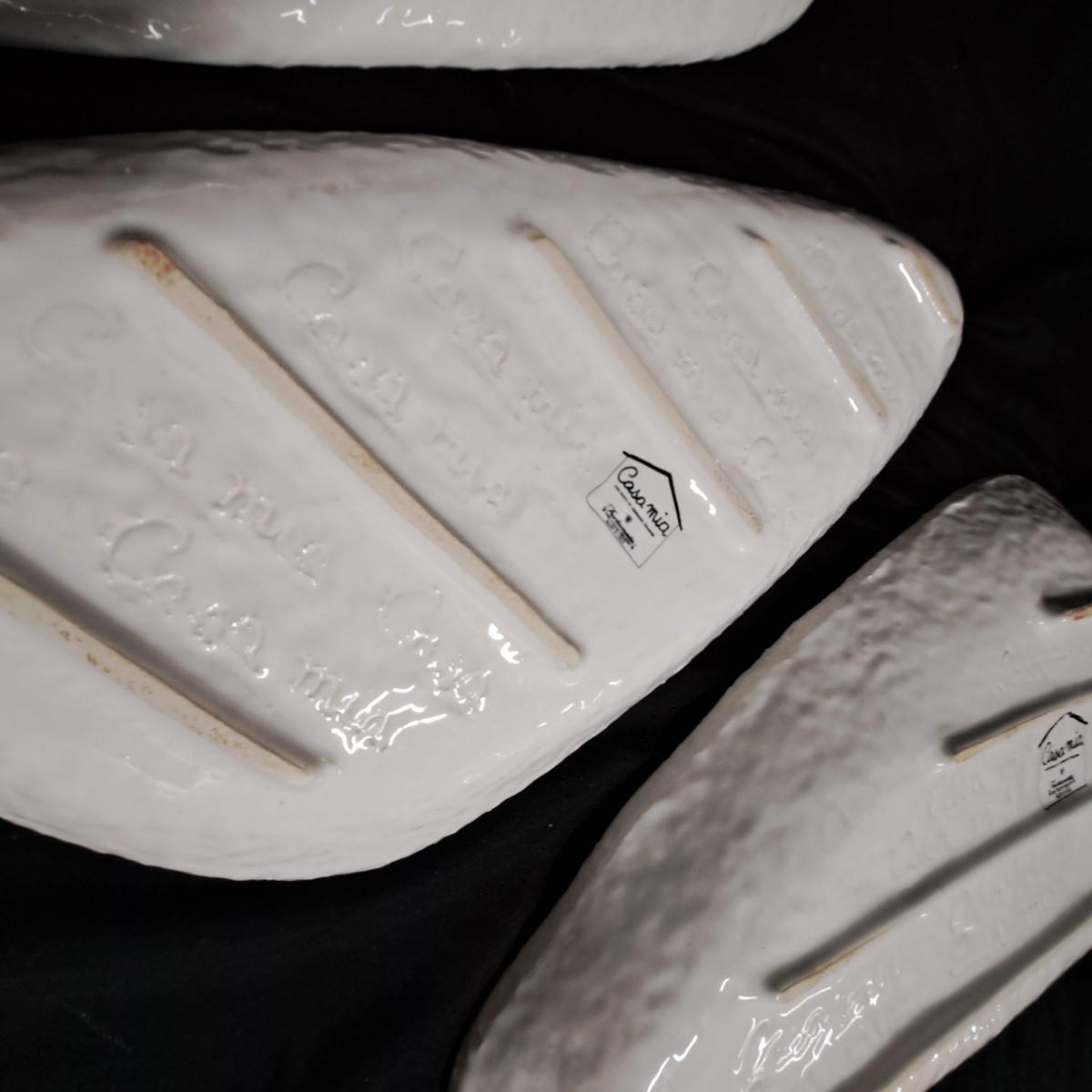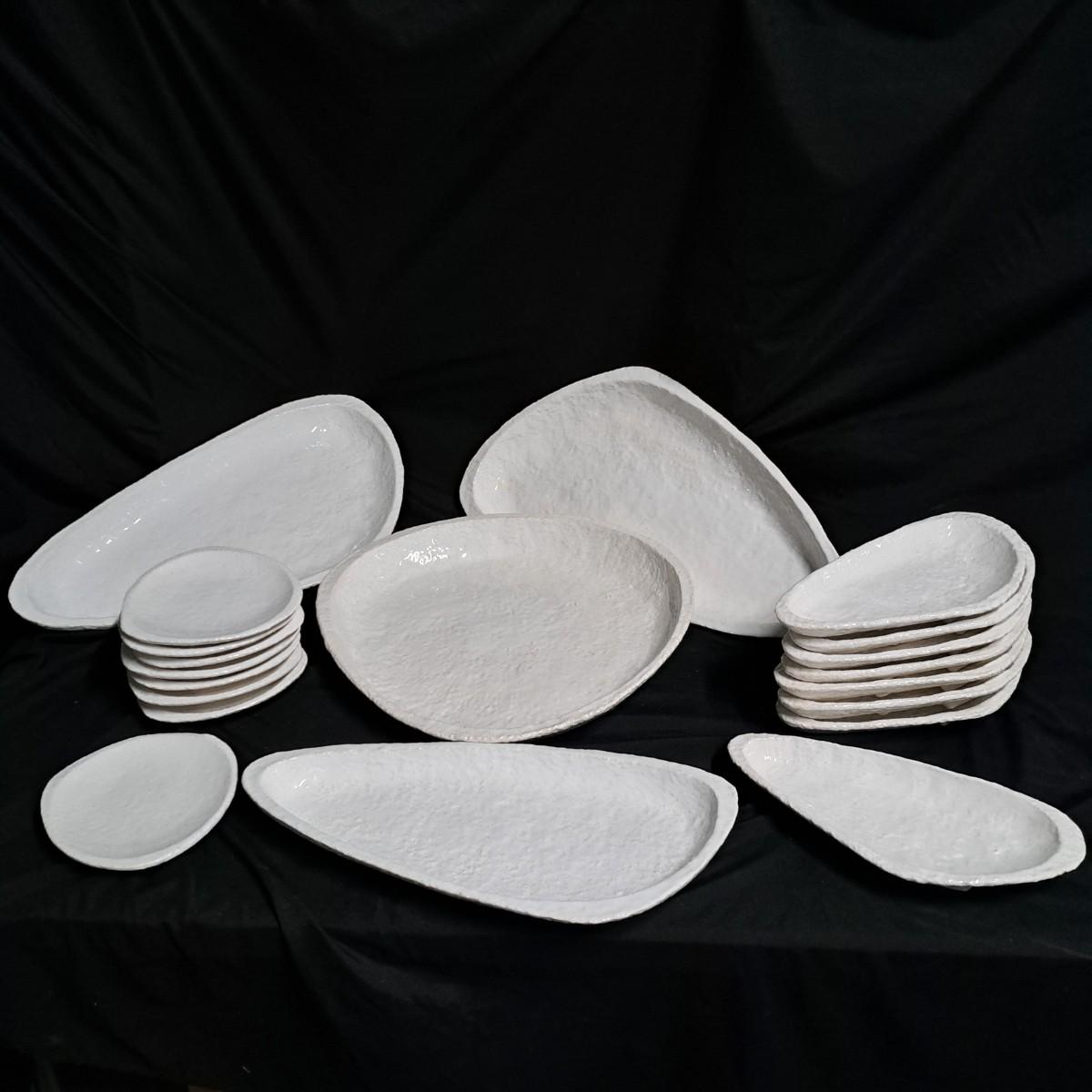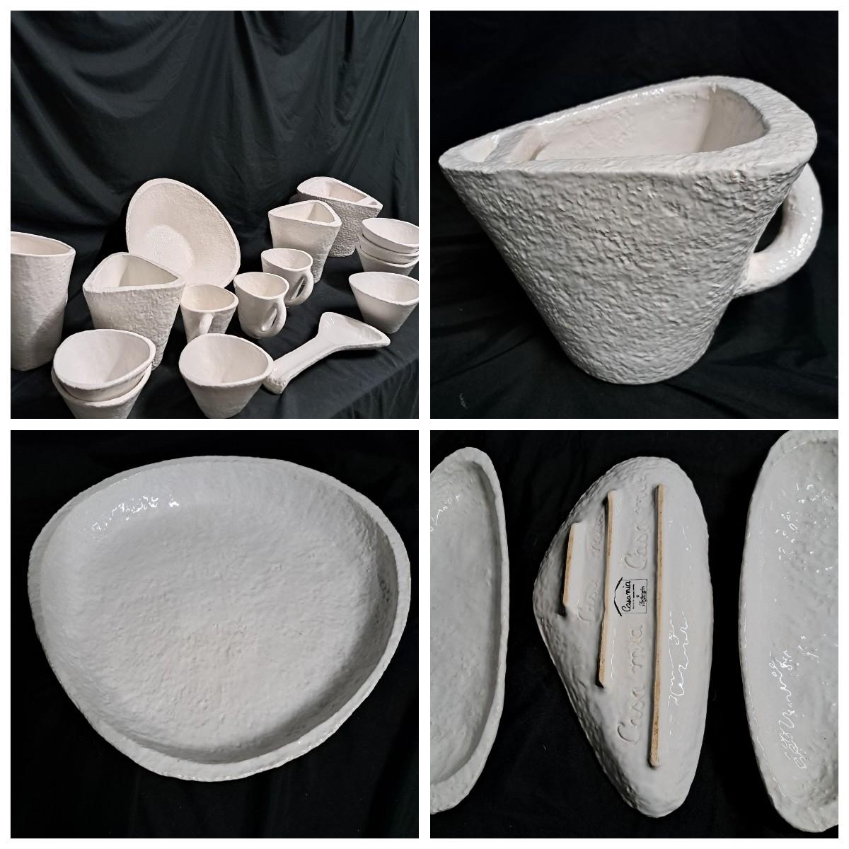A fabulous set of 58 pieces of Casa Mia, Italian earthenware by Fortunata and designed by Adriano Tolomei, fine Italian ceramics made in Italy. This sculptural set consists of heavy, white glazed ceramics in unique shapes ranging in size from 4"H dessert plates to a pitcher 16"H. Set includes eight dinner plate settings with additional cups, plates, soup bowls, au gratins, pitchers, platters and vases - as well as a large spoon rest. It appears there are no blemishes on any of these pieces. Many are interchangeable as dinnerware pieces or decorative art objects. In addition to their raised ribbed bottoms designed for secure placing they're also dishwasher, oven and microwave safe! Local pickup only.