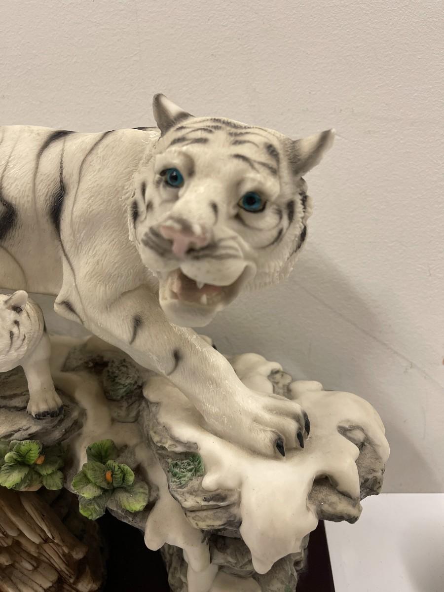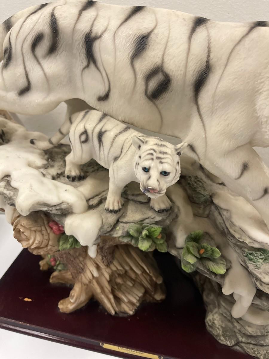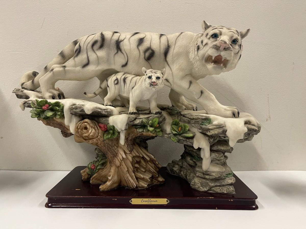 Cassablanca Collection white tiger mother and baby. Very good condition. Some minor wear to the wood base. Approx 18" long. Made of some resin type material.