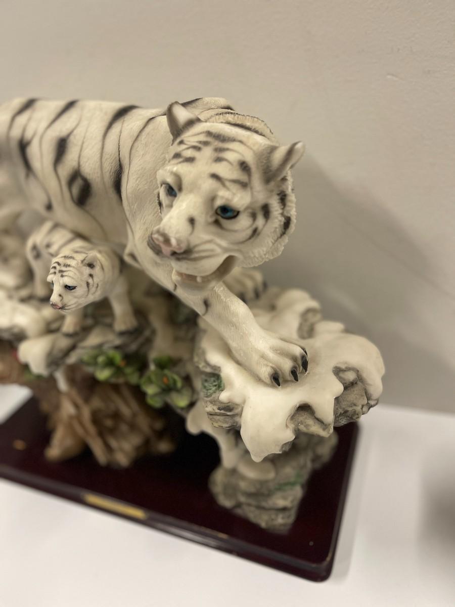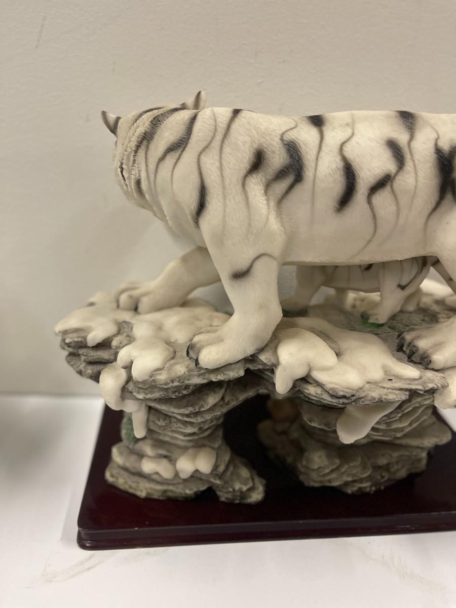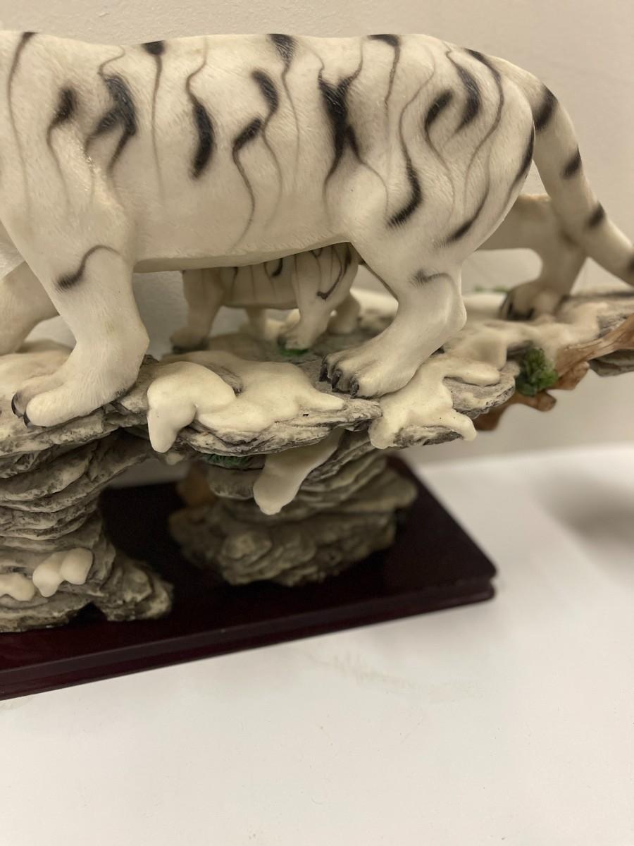 Cassablanca Collection white tiger mother and baby. Very good condition. Some minor wear to the wood base. Approx 18" long. Made of some resin type material.