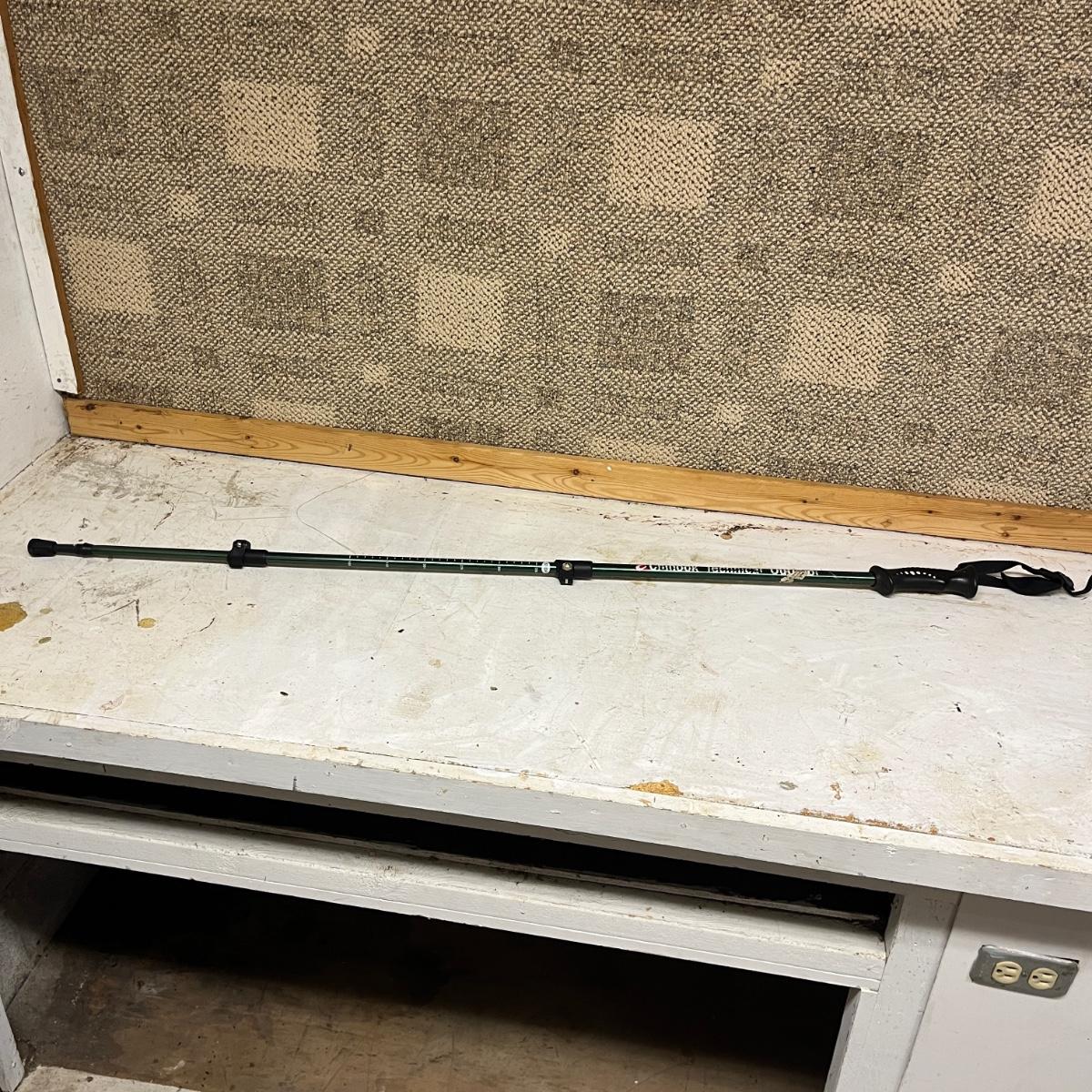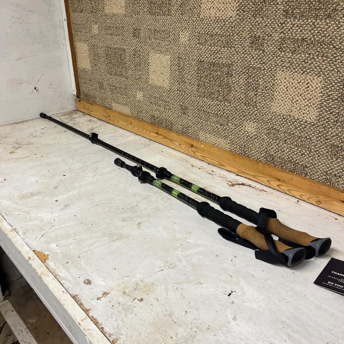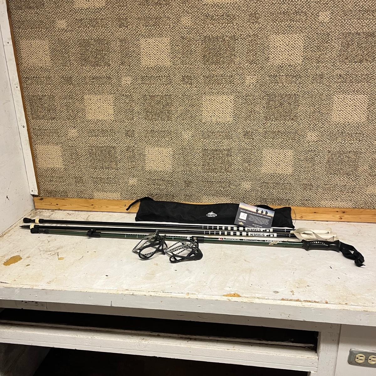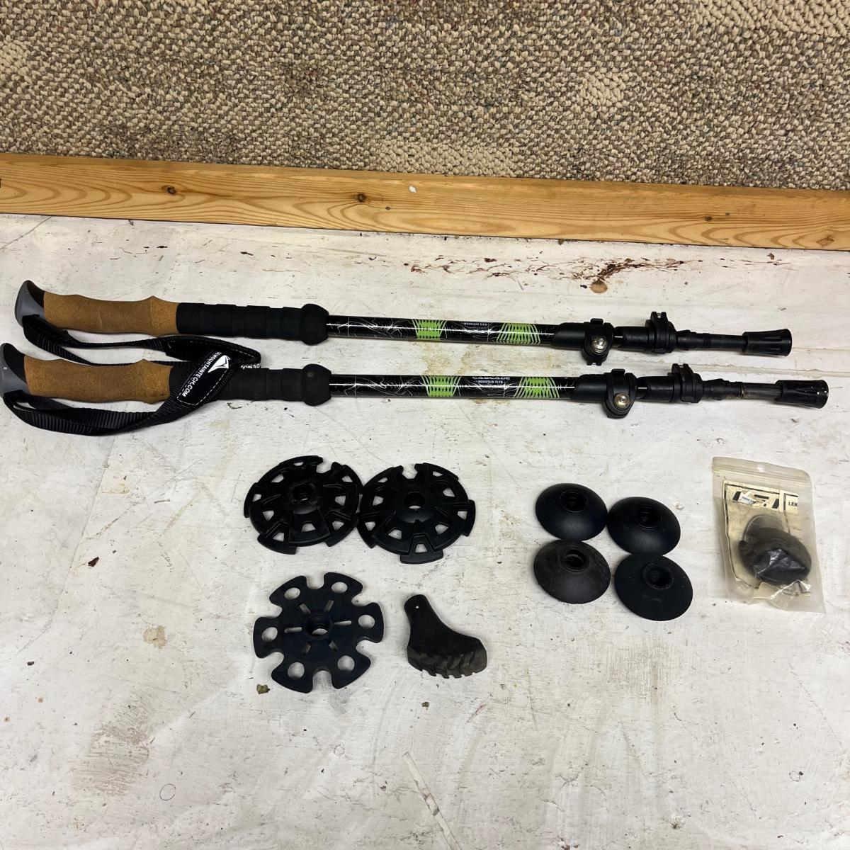 Lot includes a pair of LP Staven (one rubber end is missing) walking sticks, a pair of Cascade collapsible walking sticks, Chinook Technical Outdoor walking stick and a pair of clamp ons. Longest stick measures 55” Long.
