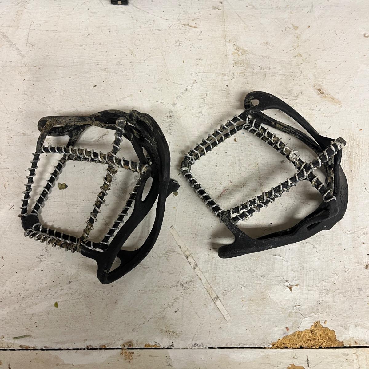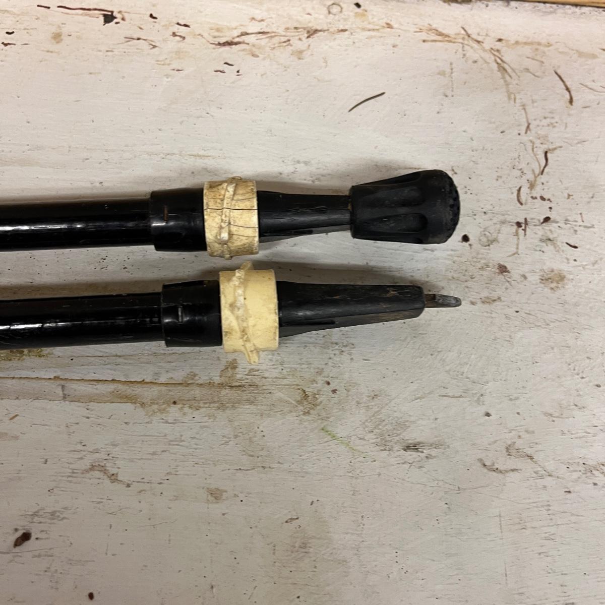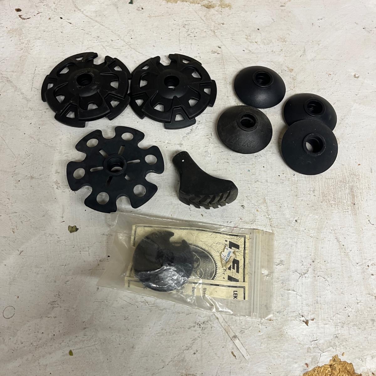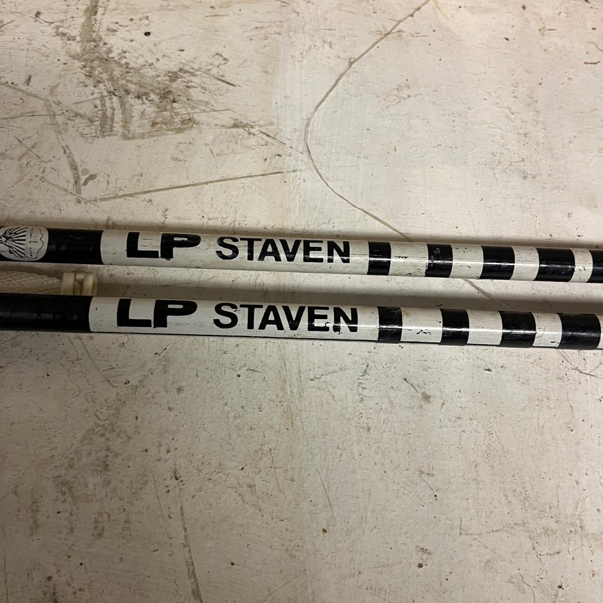 Lot includes a pair of LP Staven (one rubber end is missing) walking sticks, a pair of Cascade collapsible walking sticks, Chinook Technical Outdoor walking stick and a pair of clamp ons. Longest stick measures 55” Long.