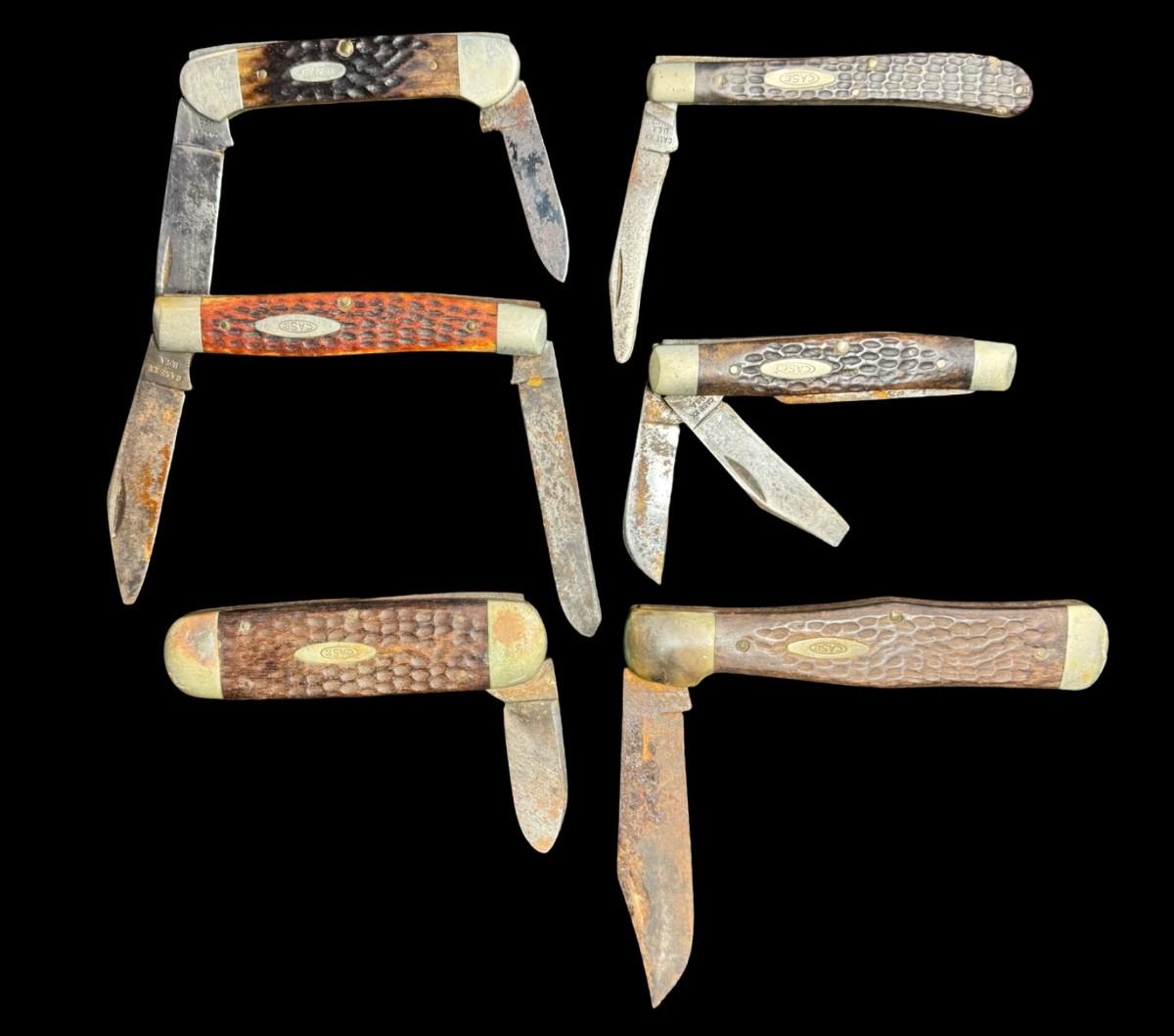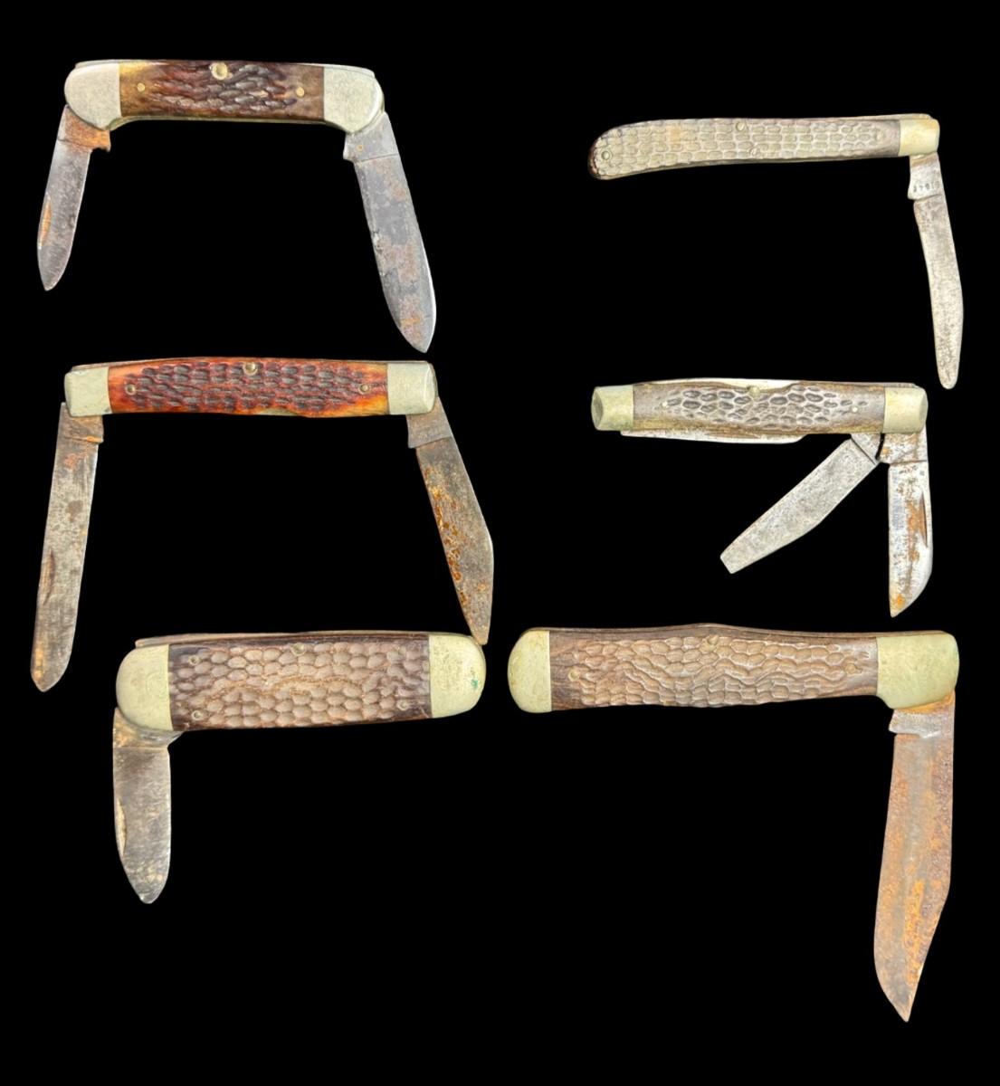 Total of six pieces. All have either horn or faux horn handles. There is some rust or staining on the blades. Some blades may be broken or ground down, Measurement of longest: 9.5”L (open). [KD]