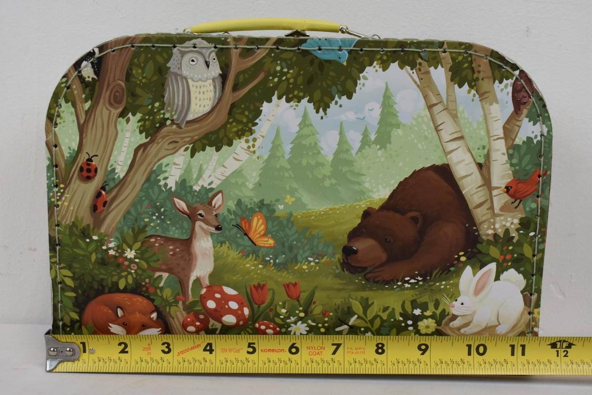 Case w Forest Art w/ 4 Stuffies: Unicorn, Frog, Bear, Rabbit - Used, good condition