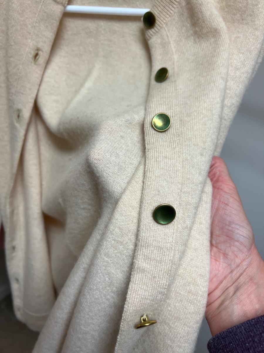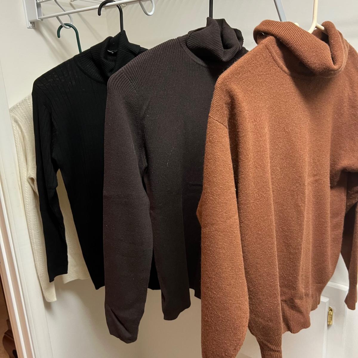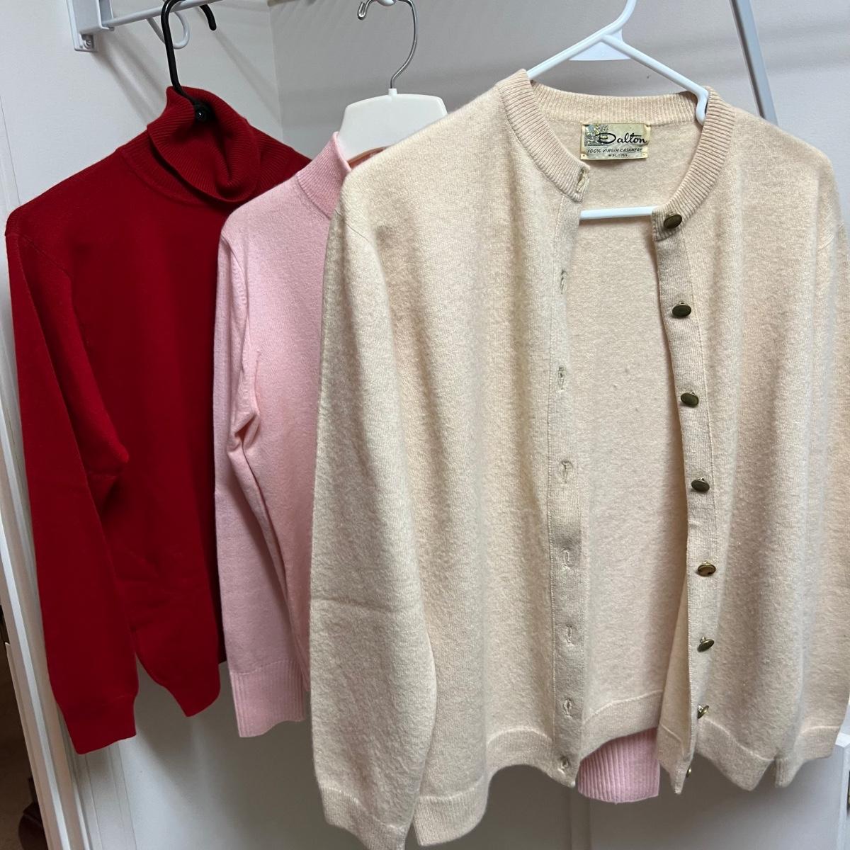 Four cashmere sweaters and a virgin wool cashmere cardigan in this lot that also includes a black silk sweater. Just one brown sweater in this lot that is not cashmere or silk. See images for brands and sizes.