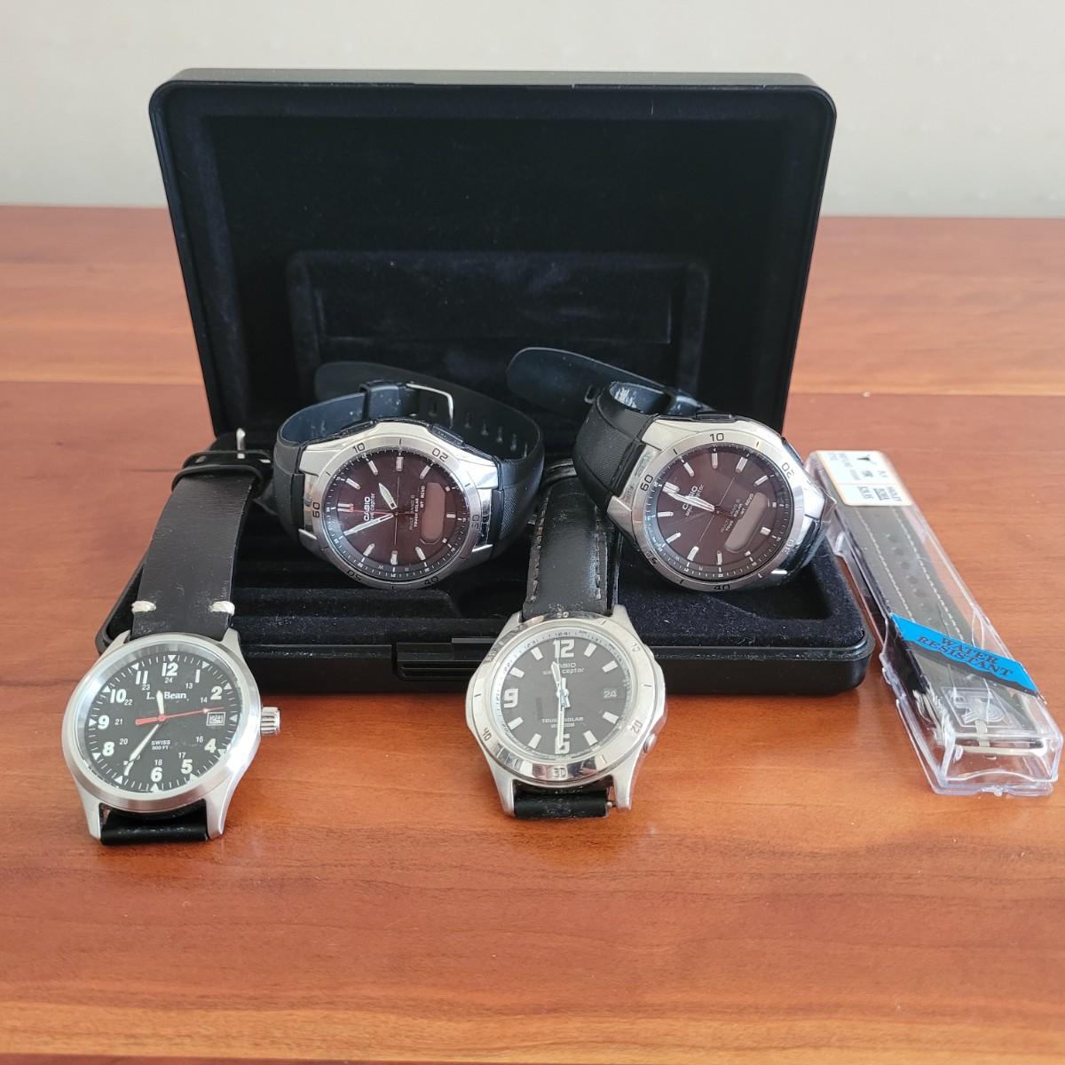 This lot includes four watches and a repair kit with extra straps. The three Casio brand watches are the "Wave Cepter" style. The L.L. Bean watches have no style or type displayed. There is also a repair kit with tools and two extra leather straps for replacement. Only one of the Casio watches is ticking. The other three are not able to be tested.