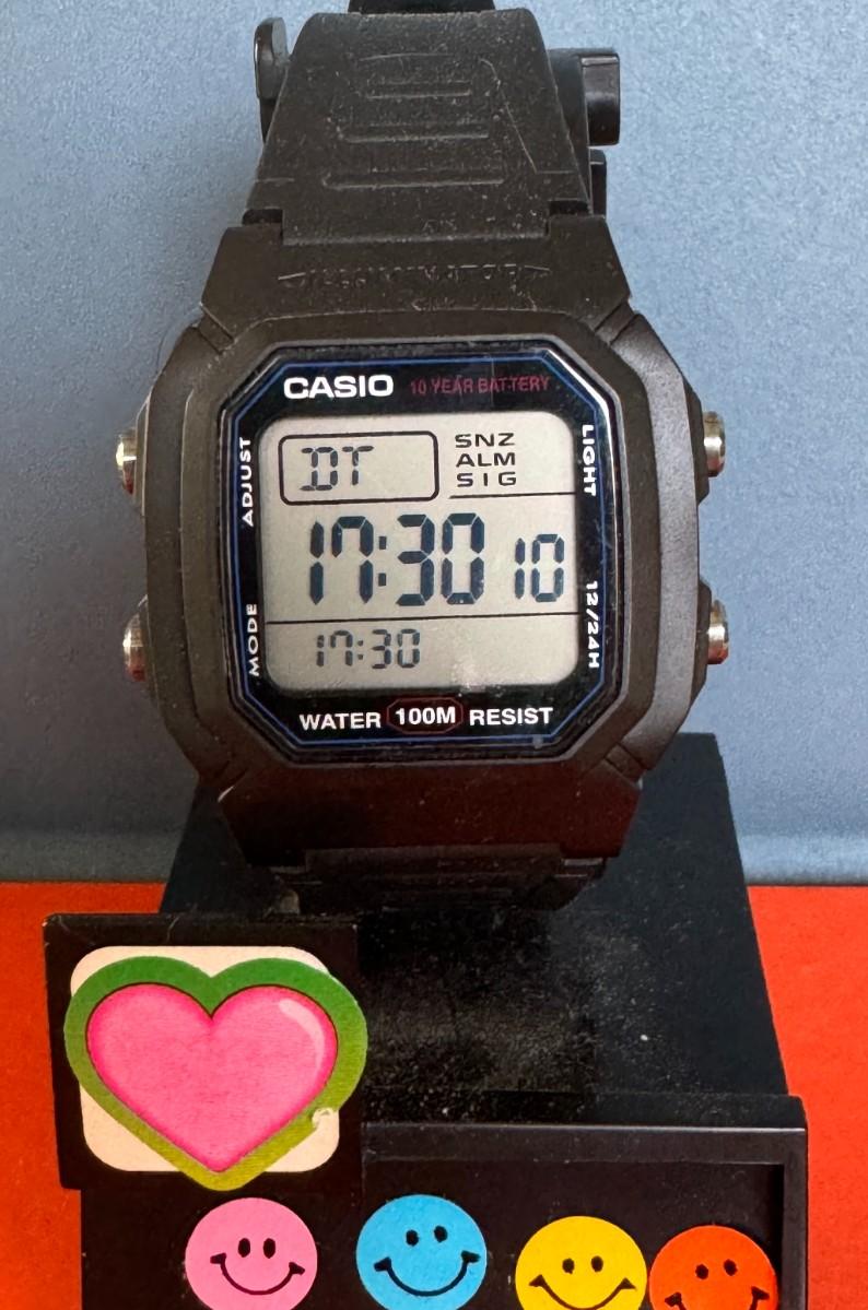 The image shows a Casio W-800H watch with its display indicating "DT" and two time settings: 17:30 This indicates that the watch is in Dual Time (DT) mode, which allows you to keep track of the time in two different time zones.