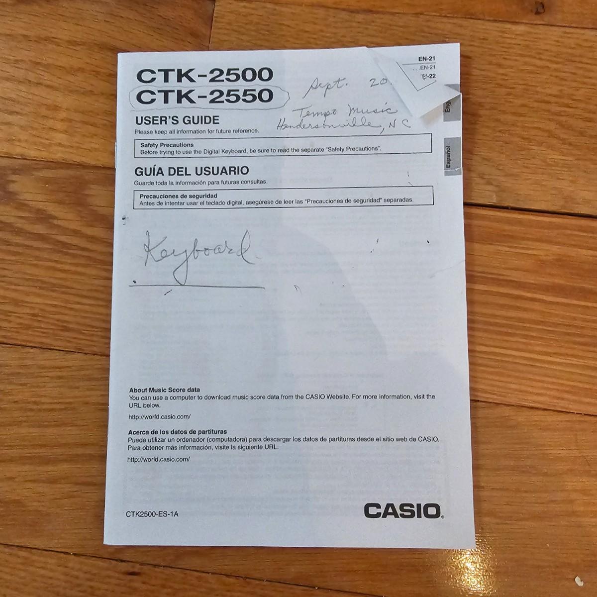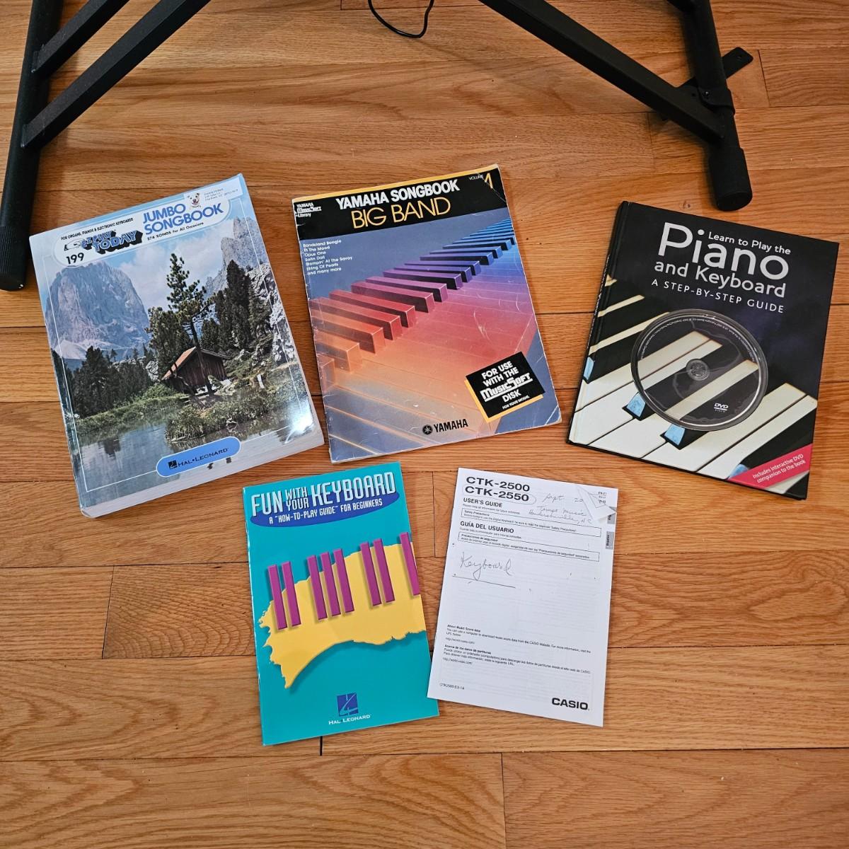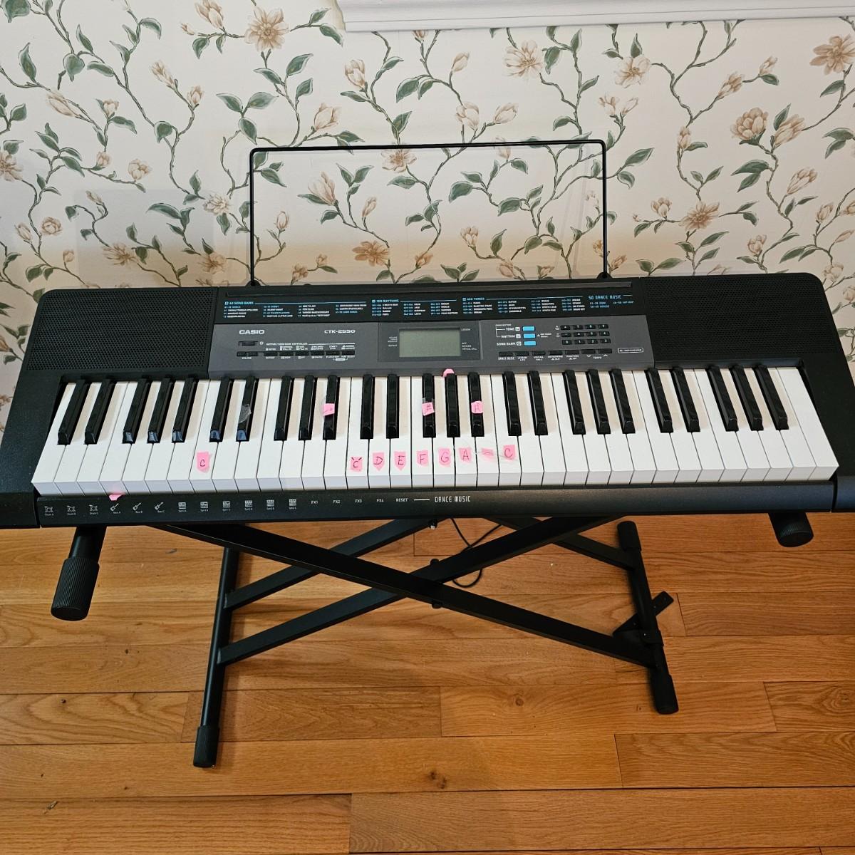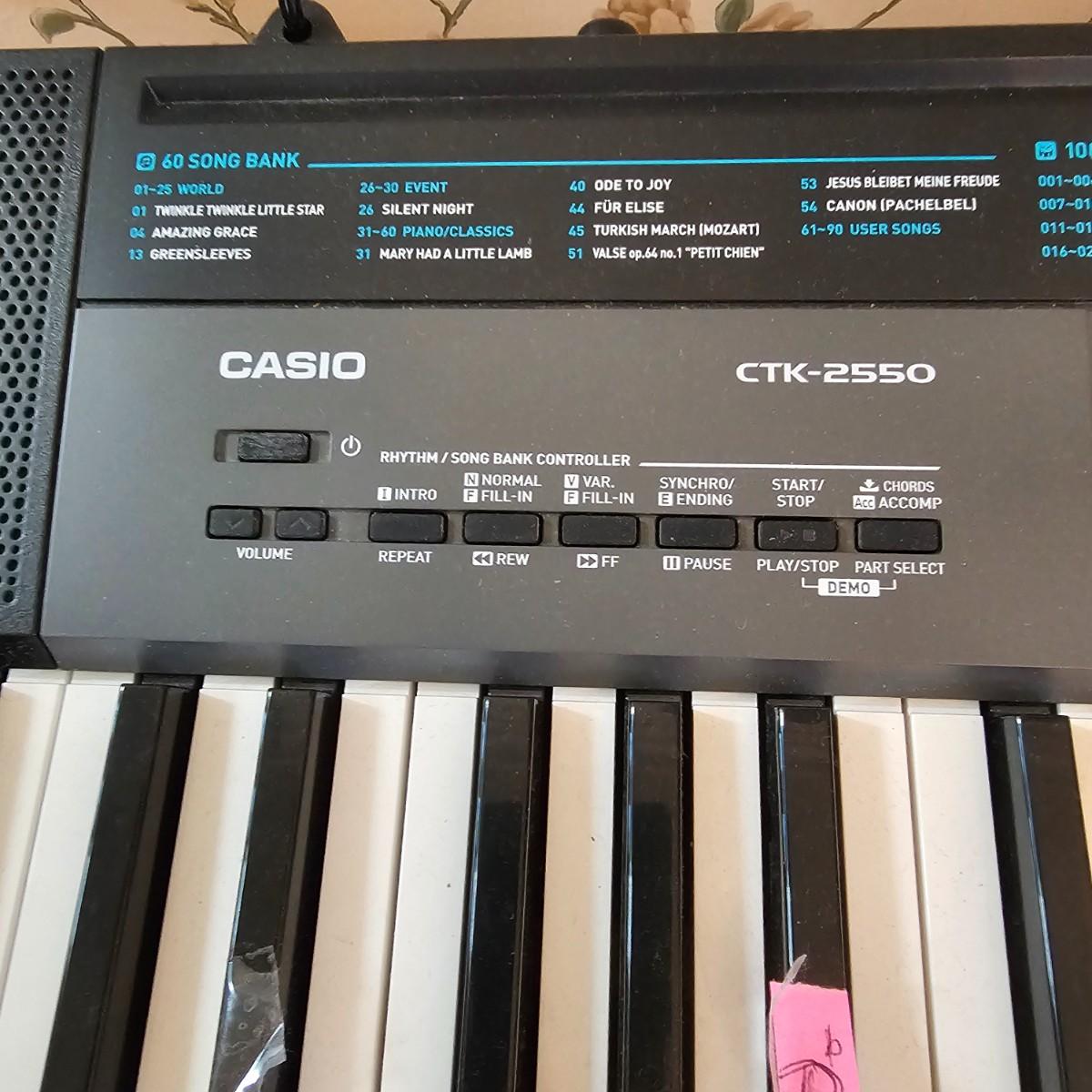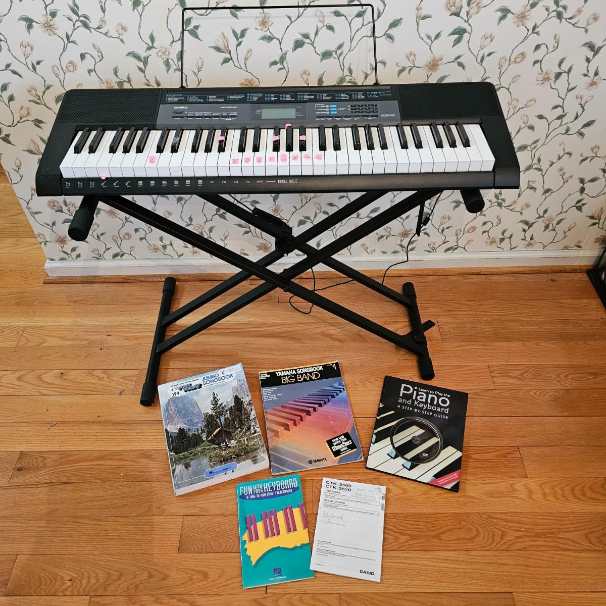 Casio electronic keyboard model CTK-2550. Has preset songs, rhythm, tone and more with digital readout. Comes with AC adapter and adjustable keyboard stand. Keyboard measures 11" x 37" x 3"H, powered on when plugged in. Stand is 18" x 31" with adjustable height. Also includes four music books and original manual. See photos for details. Local pickup only.