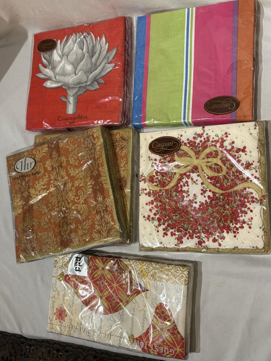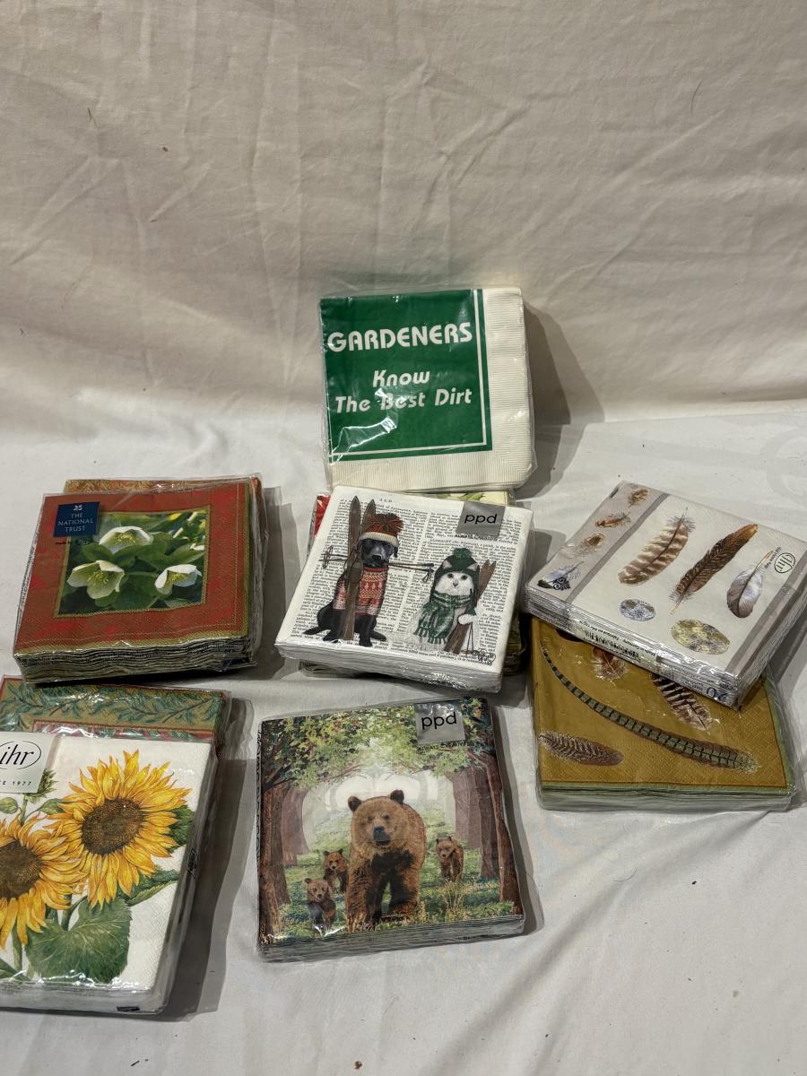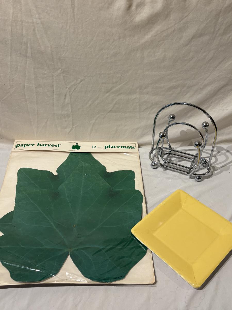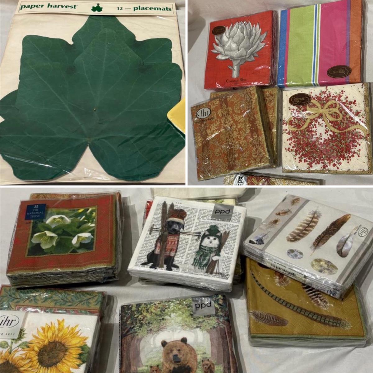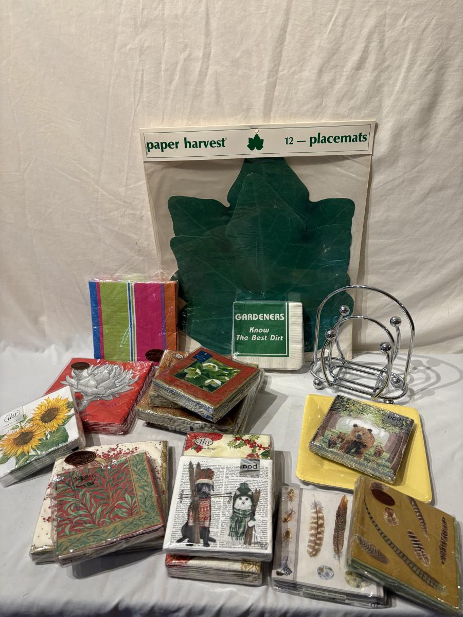 Mixed lot of Christmas and nature themed unopened packages of paper napkins, cocktail and dinner size. Placemats and paper plates. Metal napkins holder is 7”x 3” x 8.5”. Shipping available.