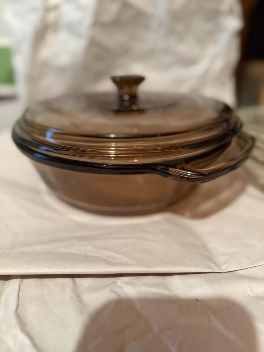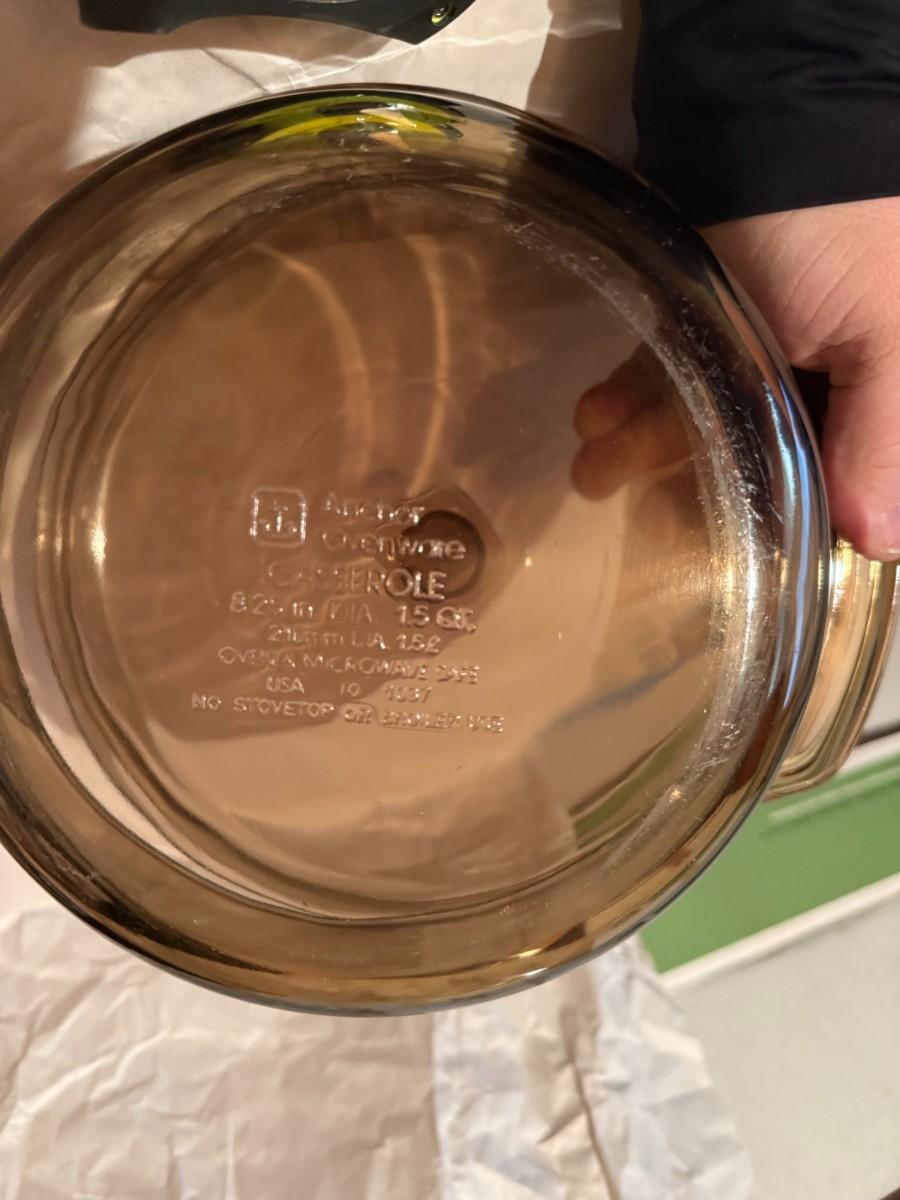 Casserole Dish with Lid by Anchor Oven Ware: This amber-colored casserole dish is both functional and decorative, perfect for serving your favorite dishes.