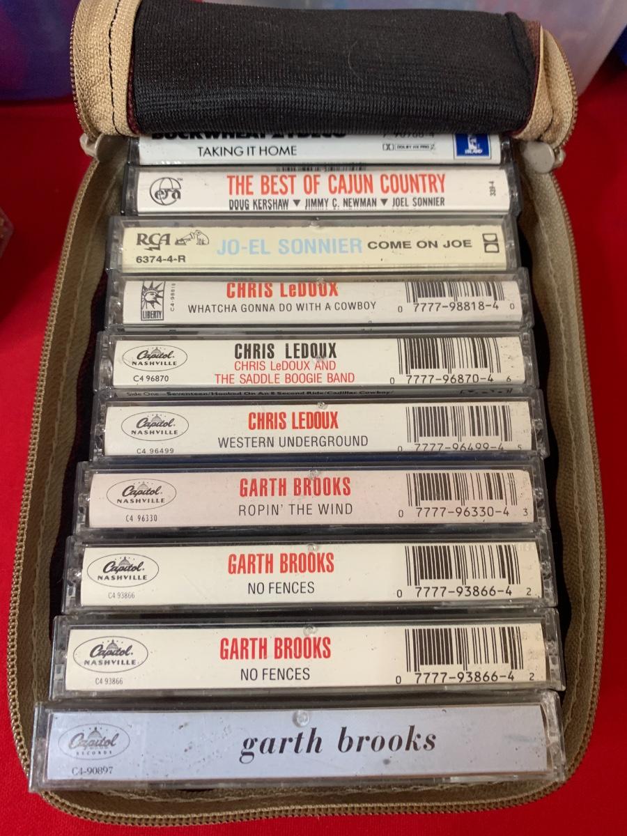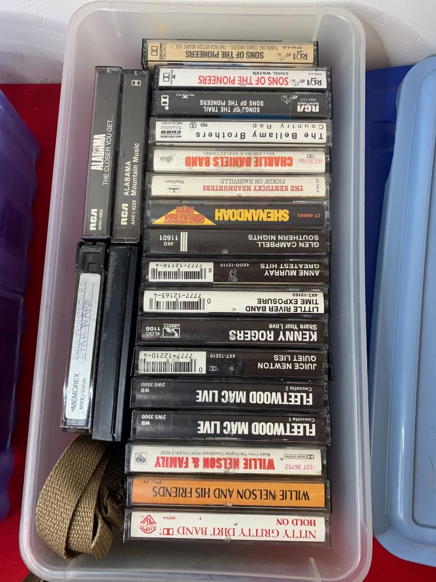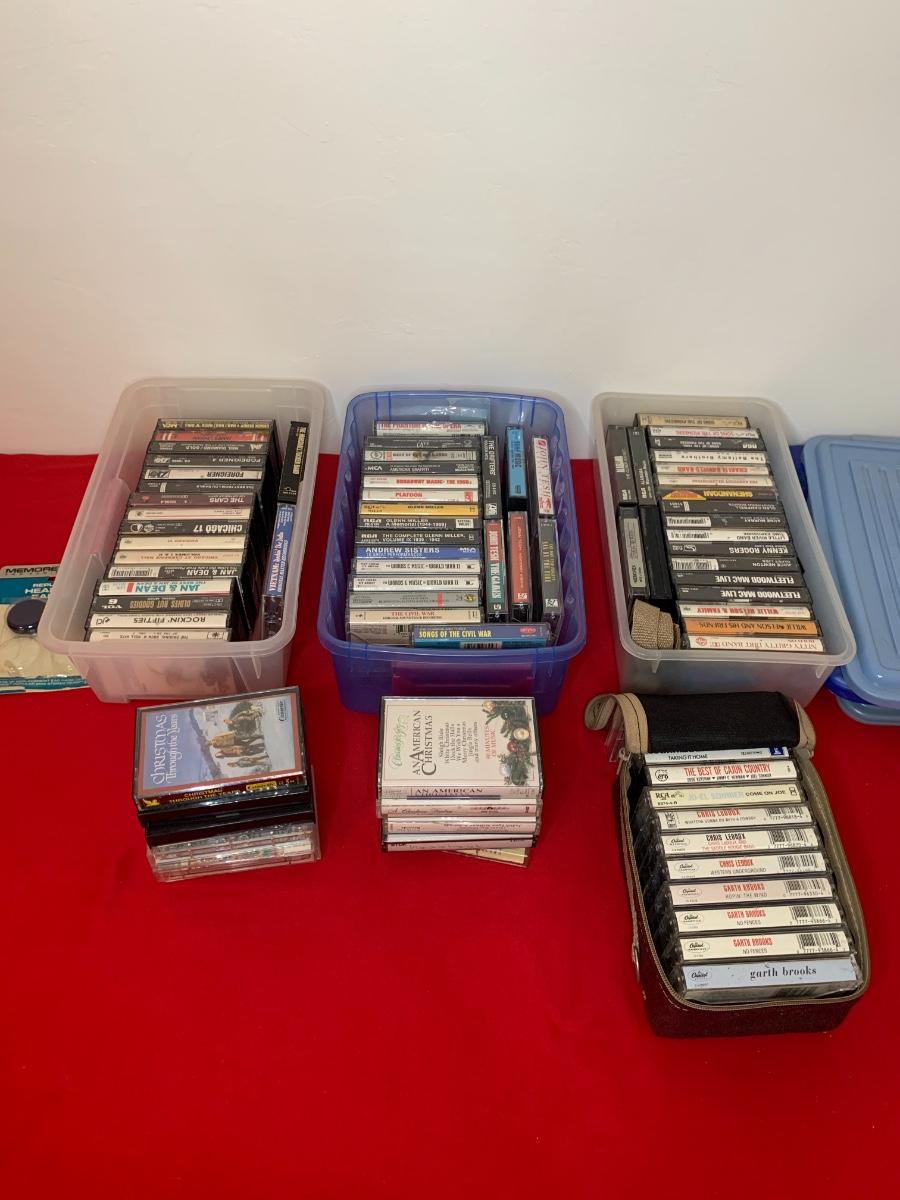 Lot includes 3 boxes of cassettes, along with a soft side case and loose Christmas albums. Includes Garth Brooks, Willie, Fleetwood Mac, Glenn Miller, Charlie Daniels, and more!