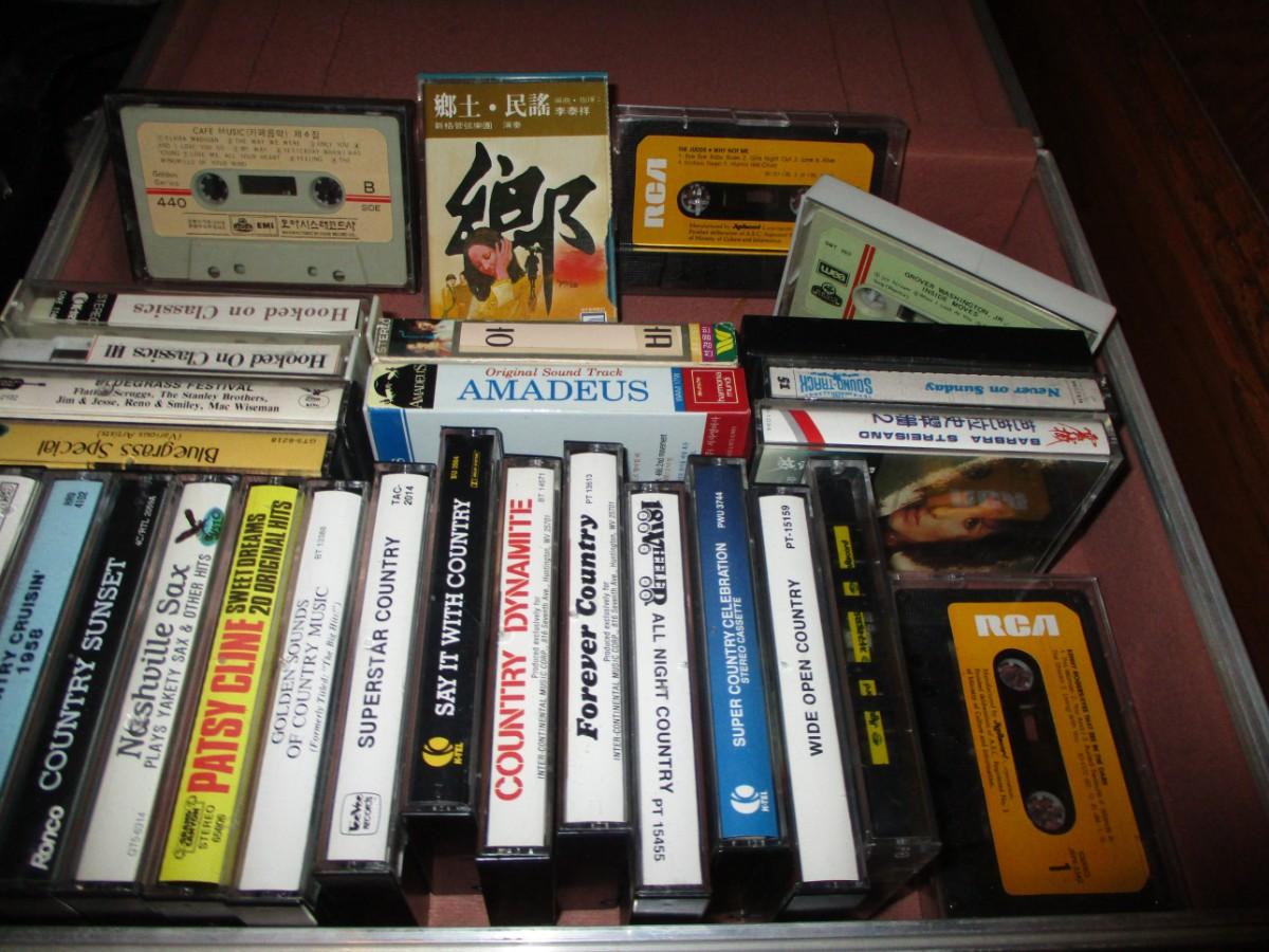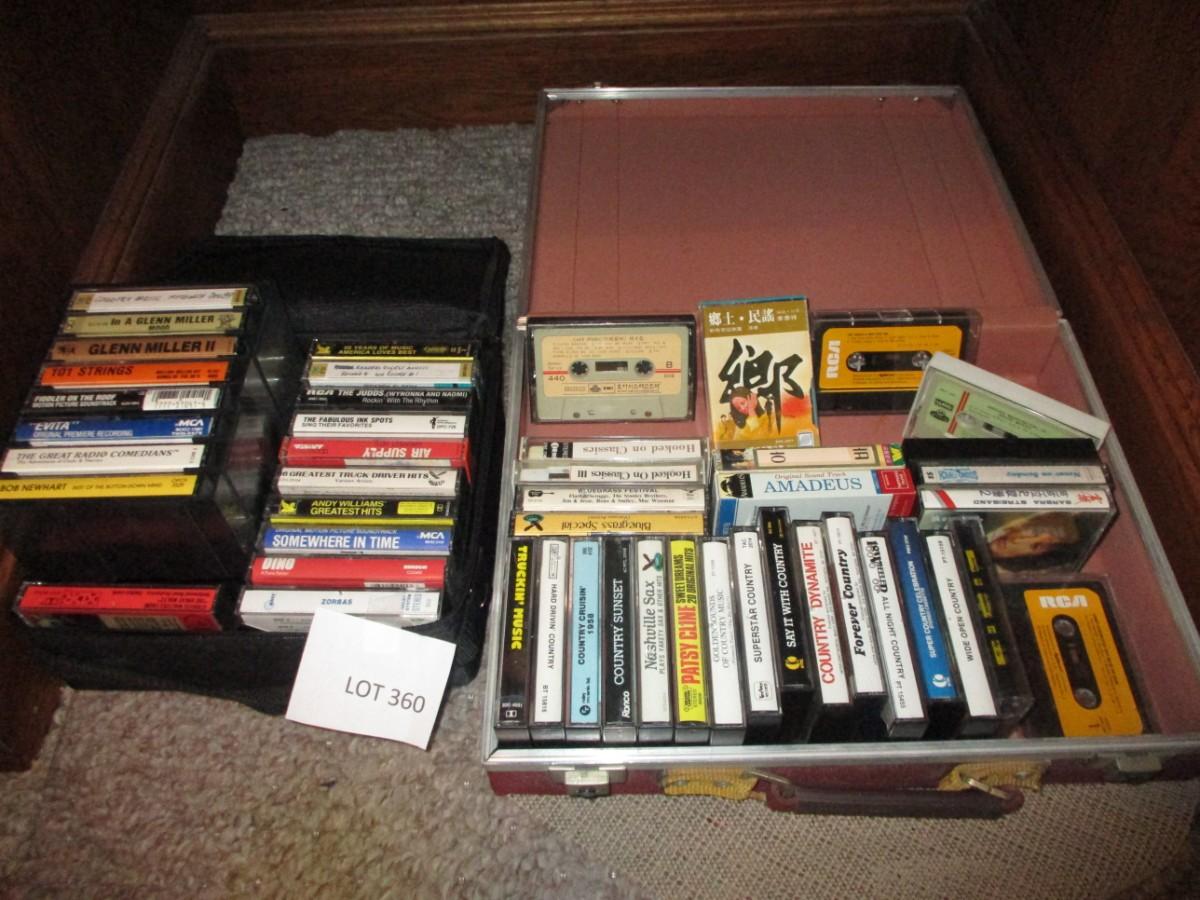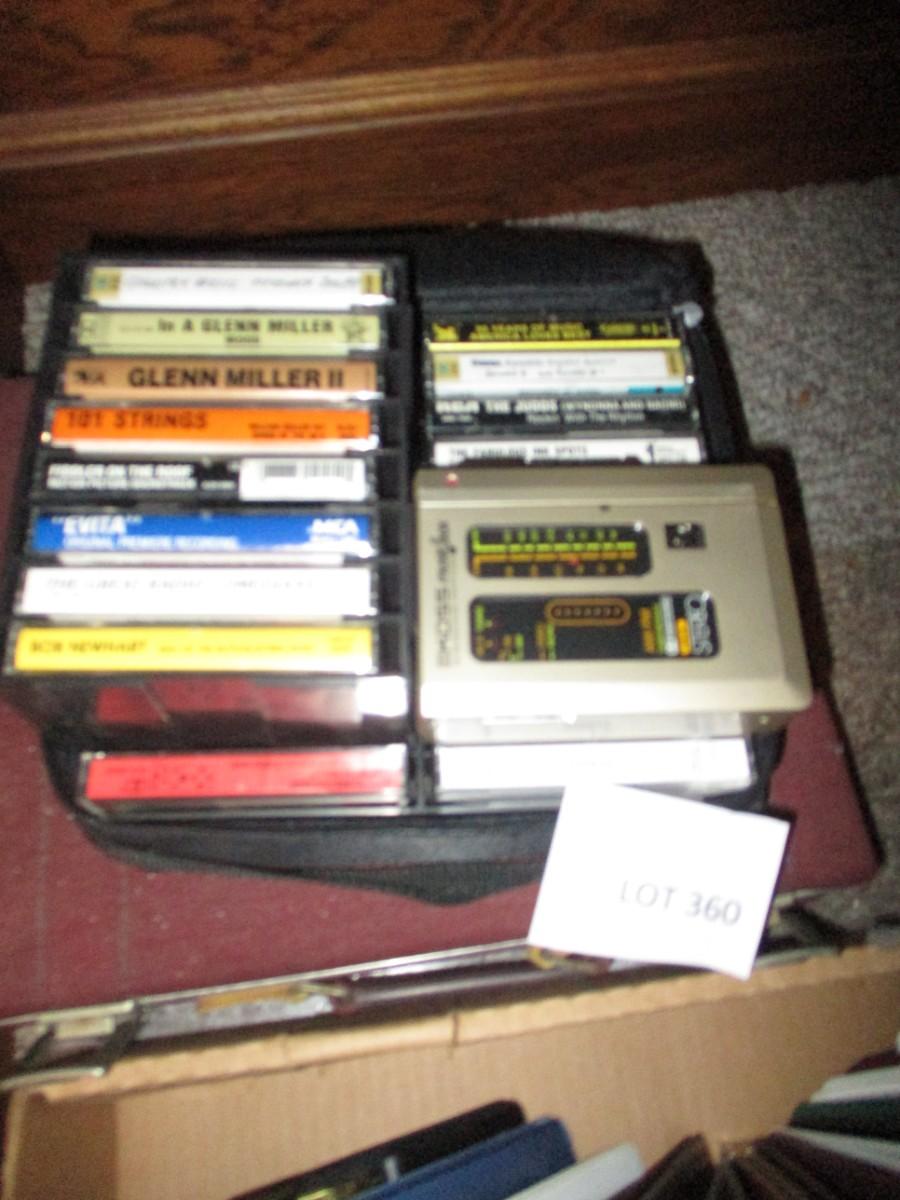 Various cassettes, handheld cassette player, cassette case holder. Can't guarantee player works.