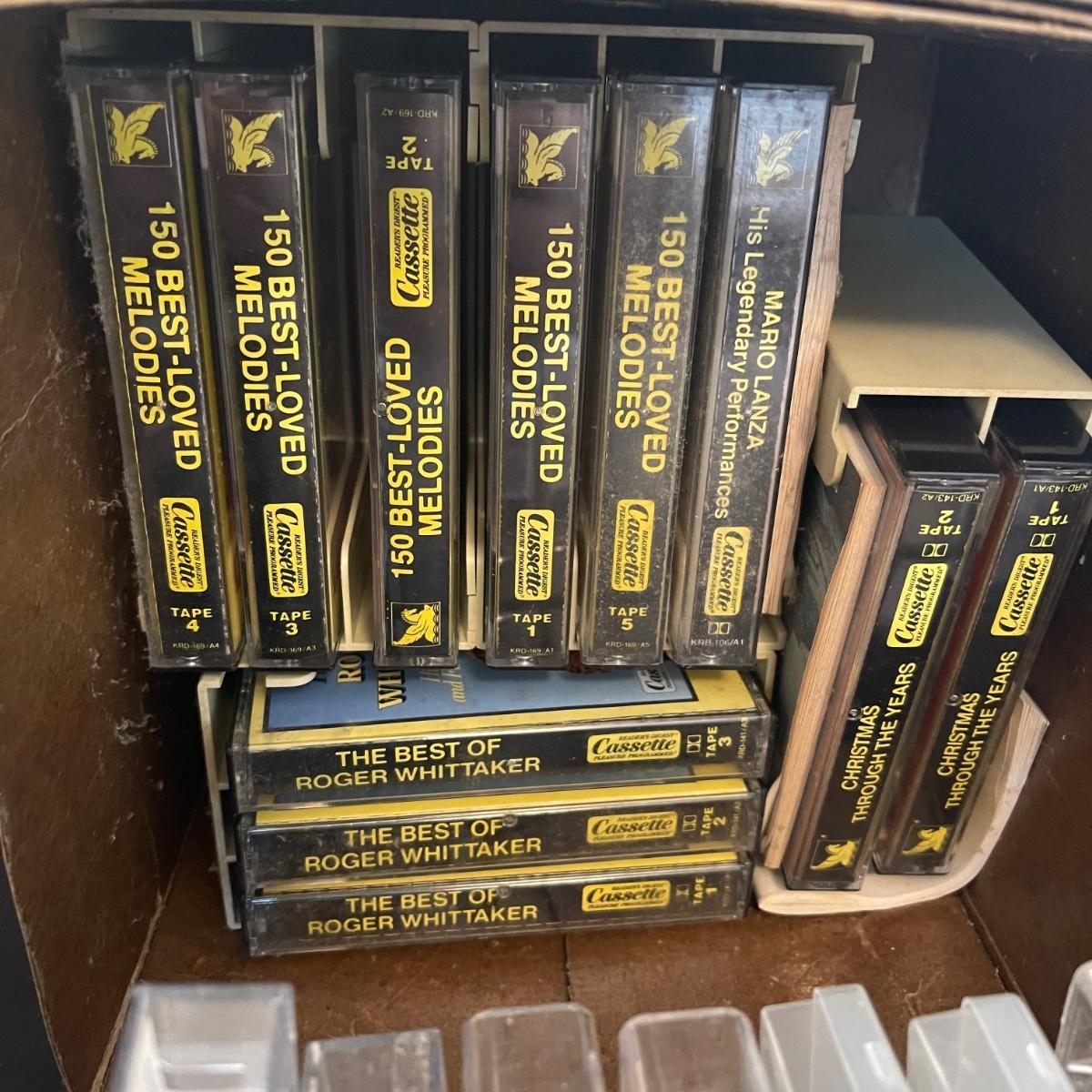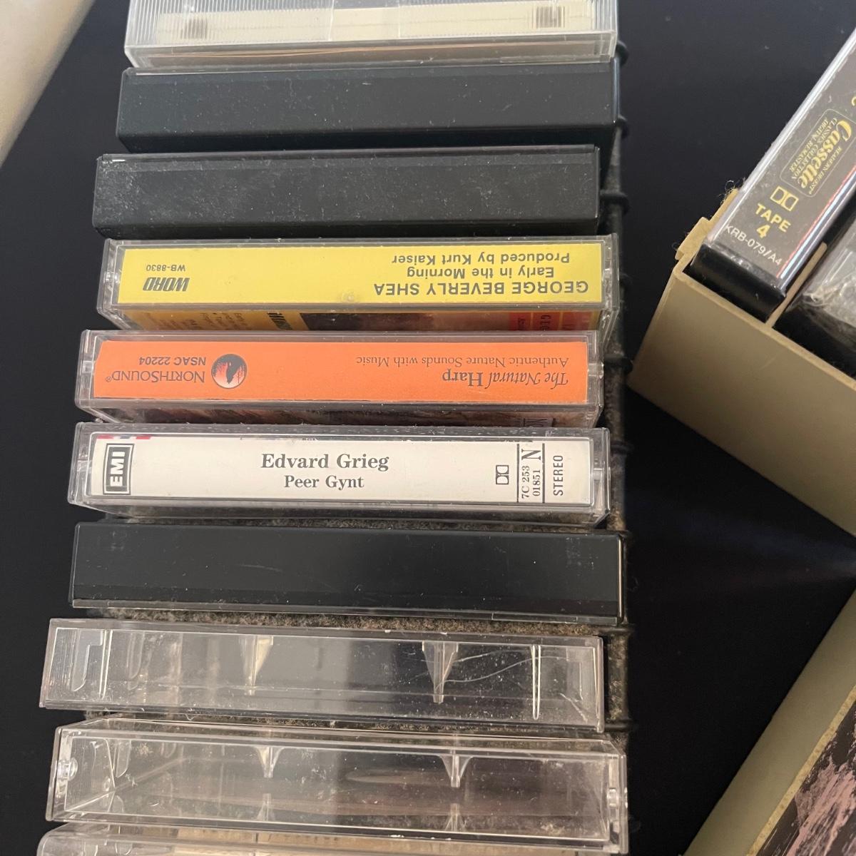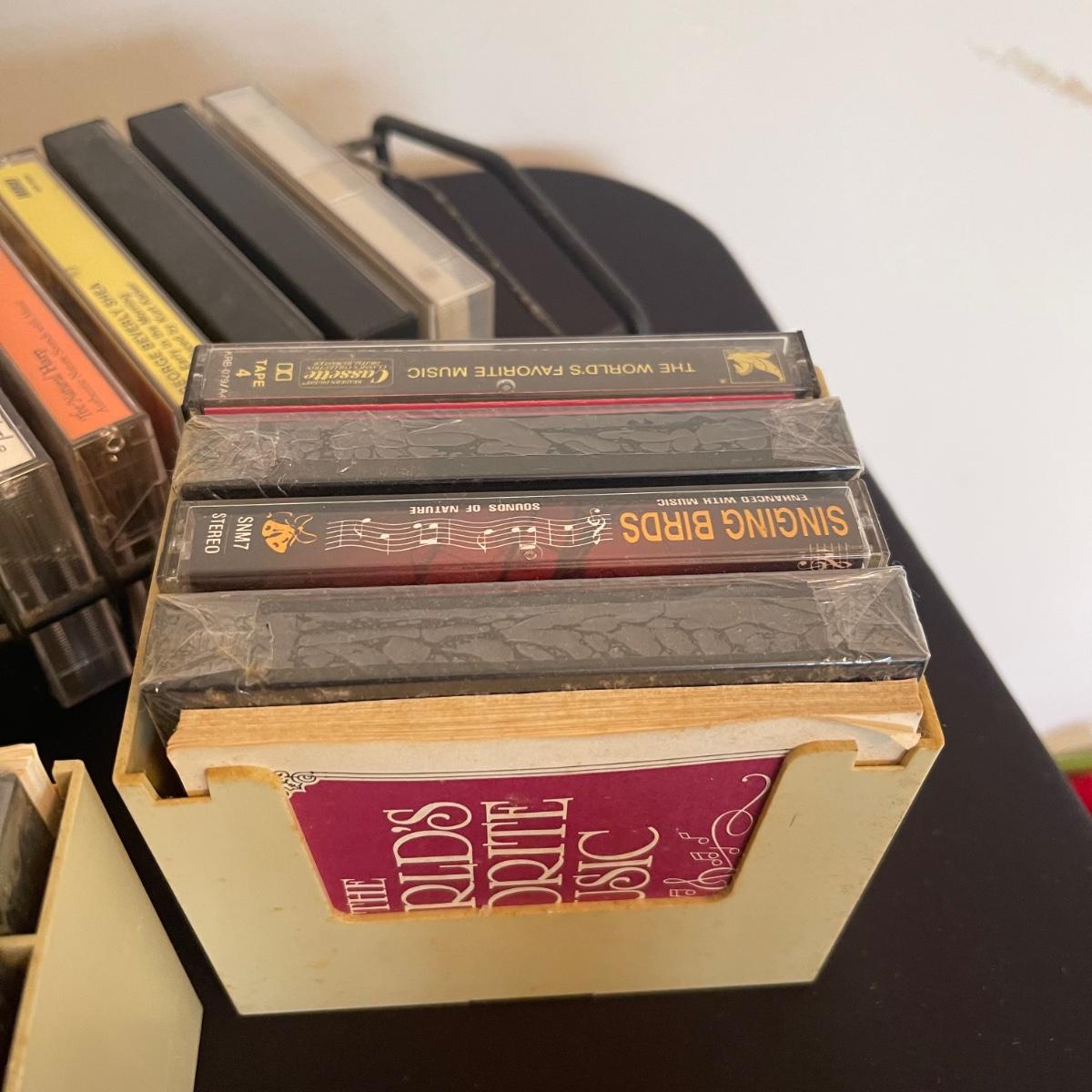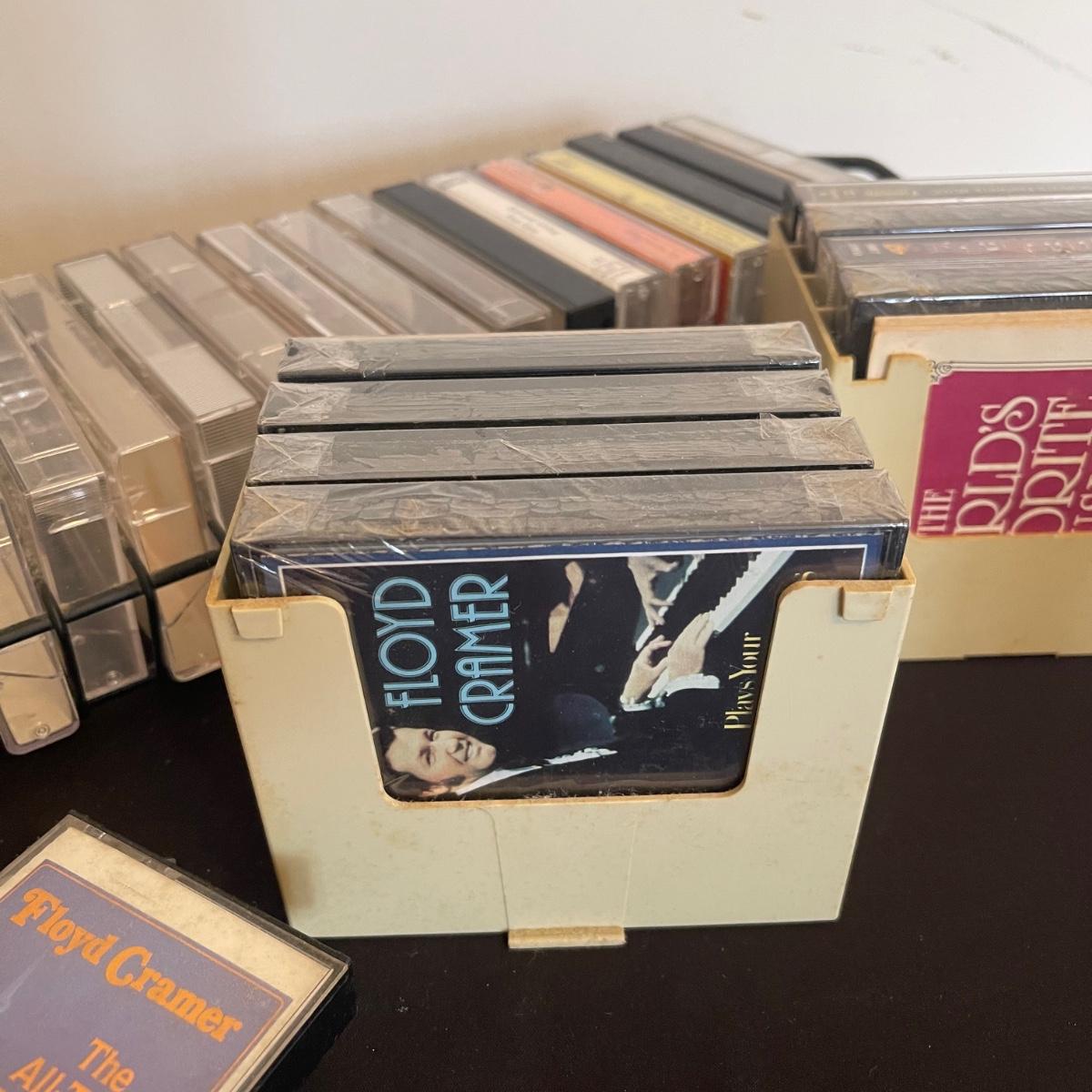 There are over 30 cassettes with a Variety of cassette tapes including Roger Whitaker, Floyd Cramer, and sounds of nature. There are also over 10 empty clear cassette containers for your cassettes. The long black cassette holder is included.