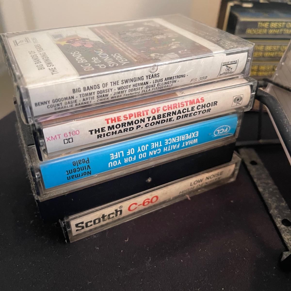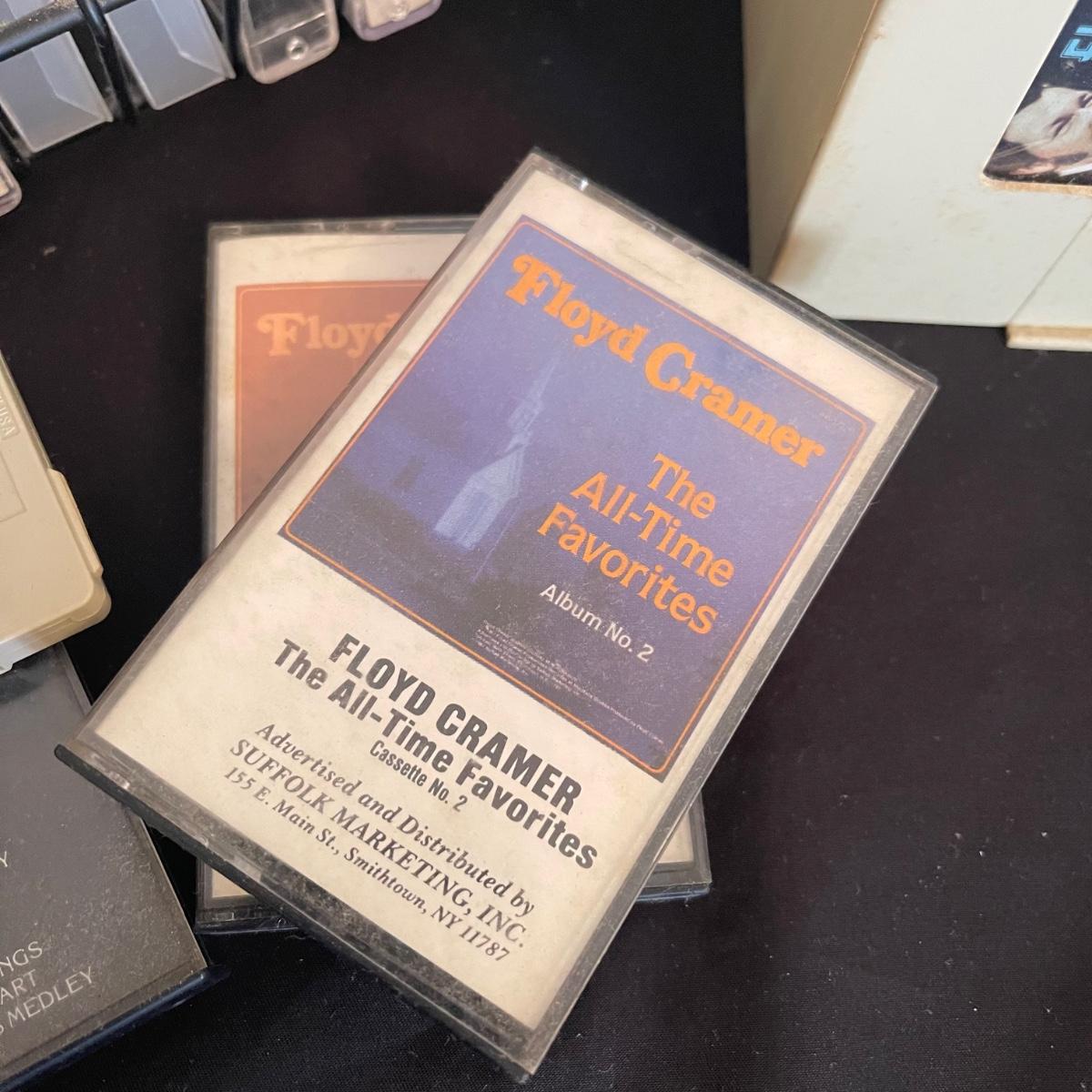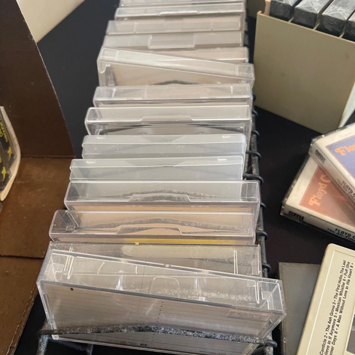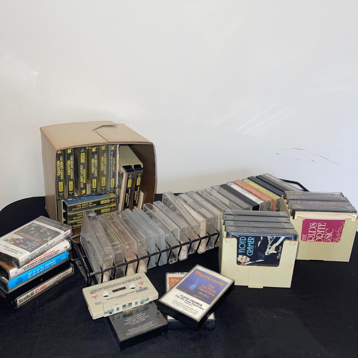 There are over 30 cassettes with a Variety of cassette tapes including Roger Whitaker, Floyd Cramer, and sounds of nature. There are also over 10 empty clear cassette containers for your cassettes. The long black cassette holder is included.