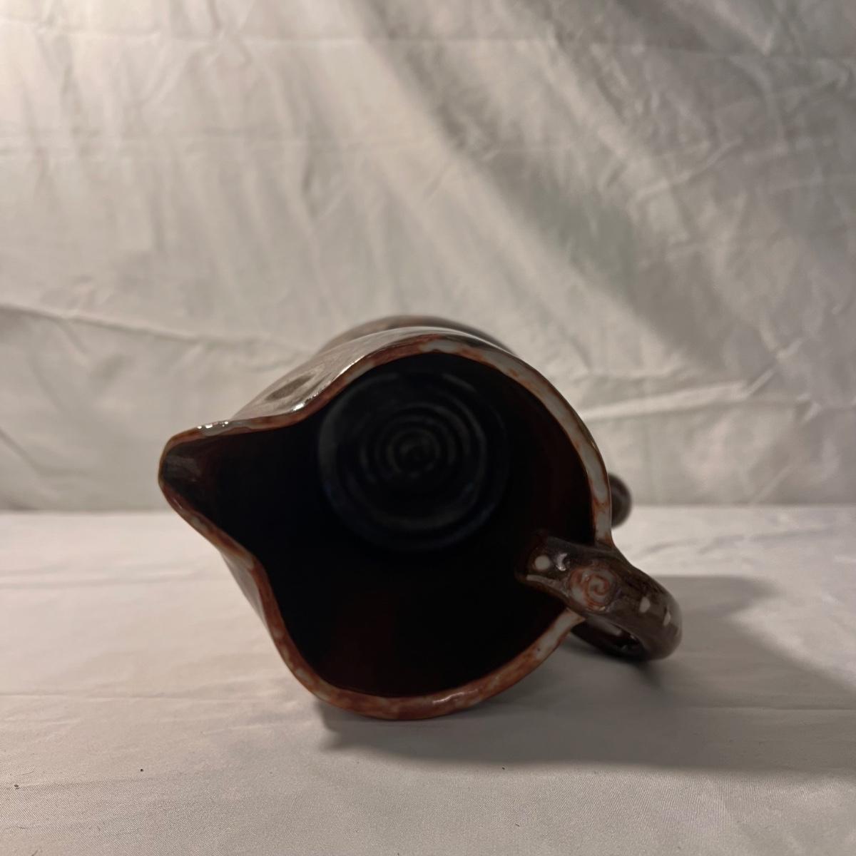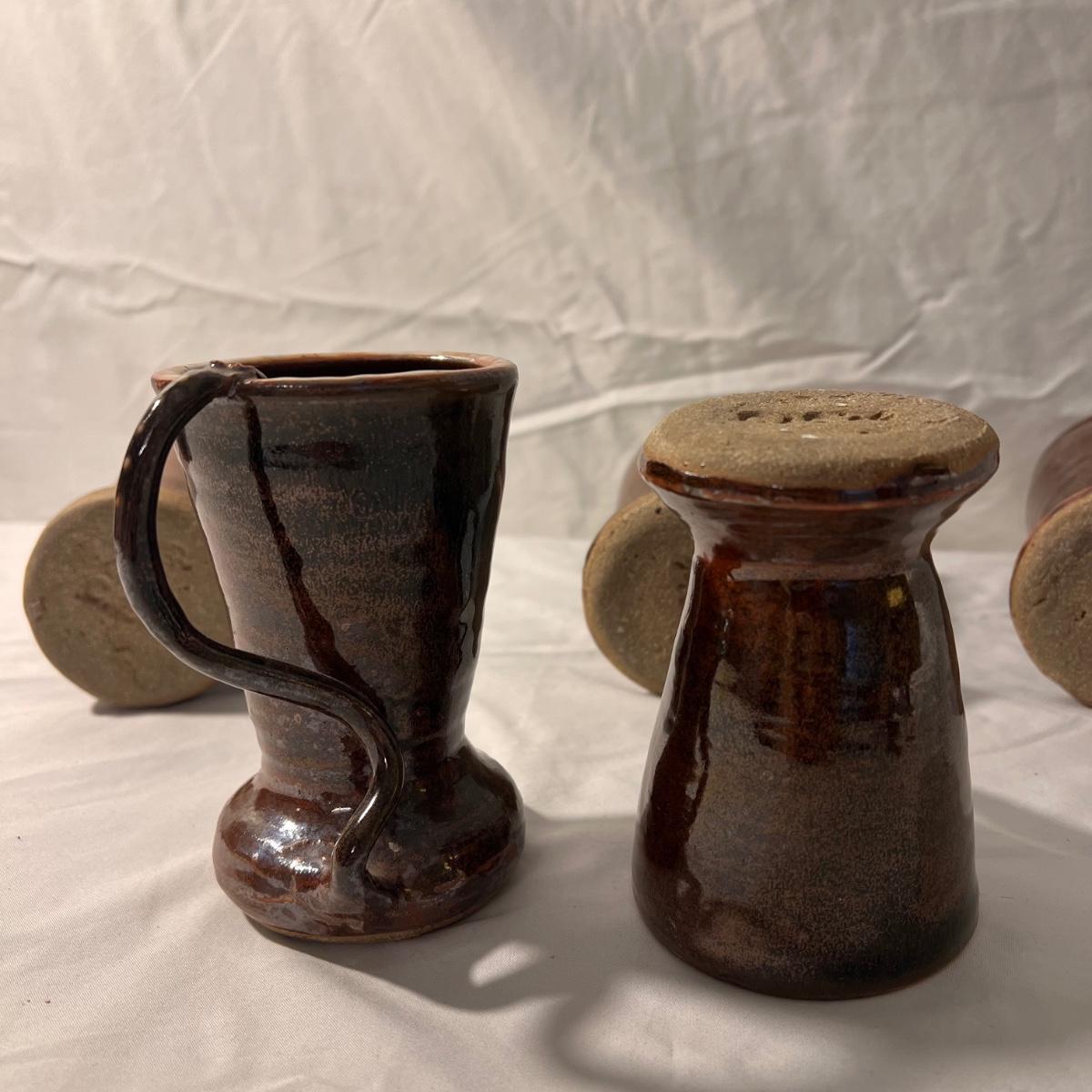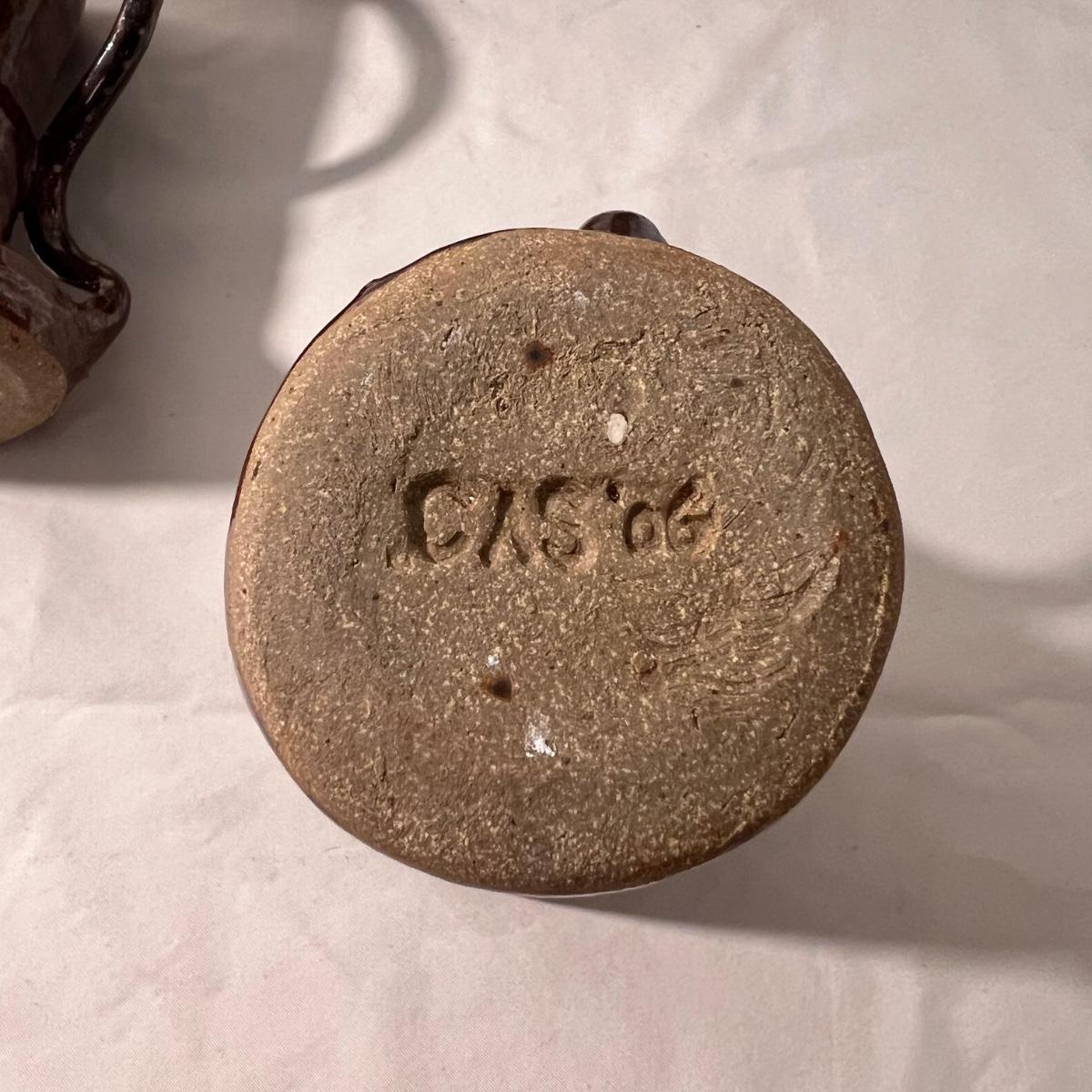 This lot includes five mugs and one pitcher. Seller states that they are crafted by Cassie Stenehjem, but we cannot verify this. Four of the mugs are stamped with "œCAS "˜06." The pitcher has one exterior crack - see picture included. The pitcher is the largest item that measures 7” x 5” x 7”H. Shipping available.