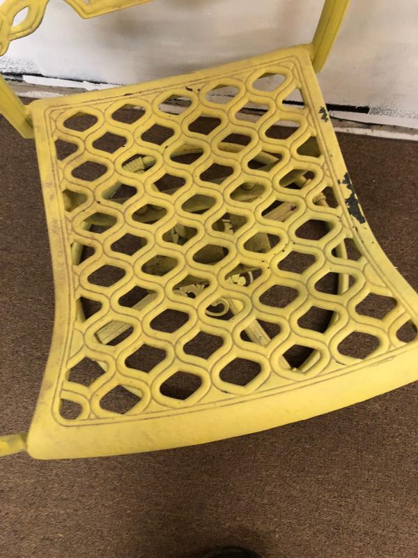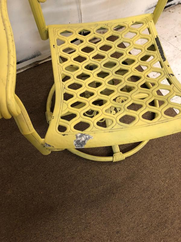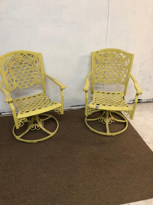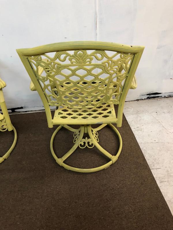 Some normal use wear and slight paint loss on this pair of cast aluminum patio dining chairs..swivel bases....