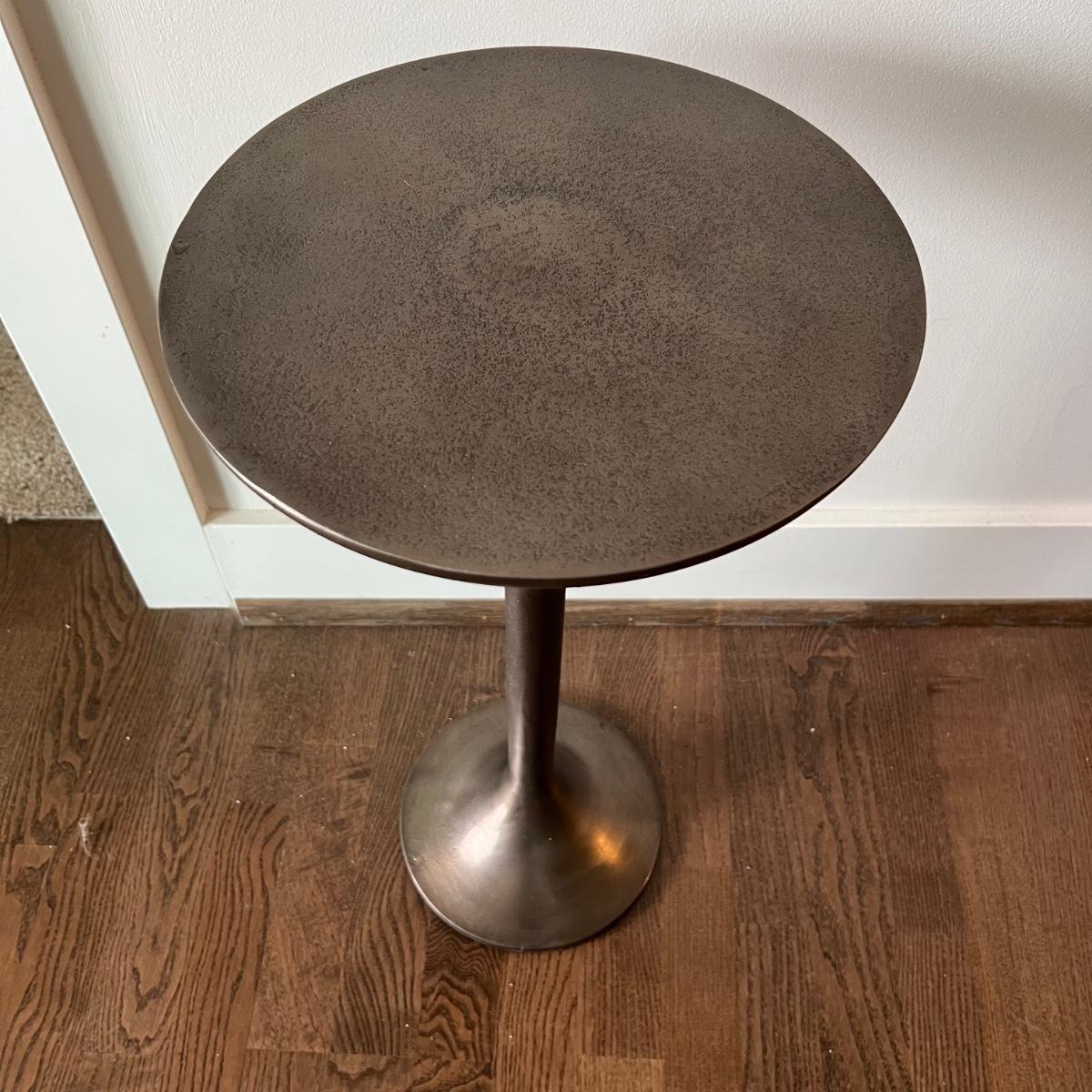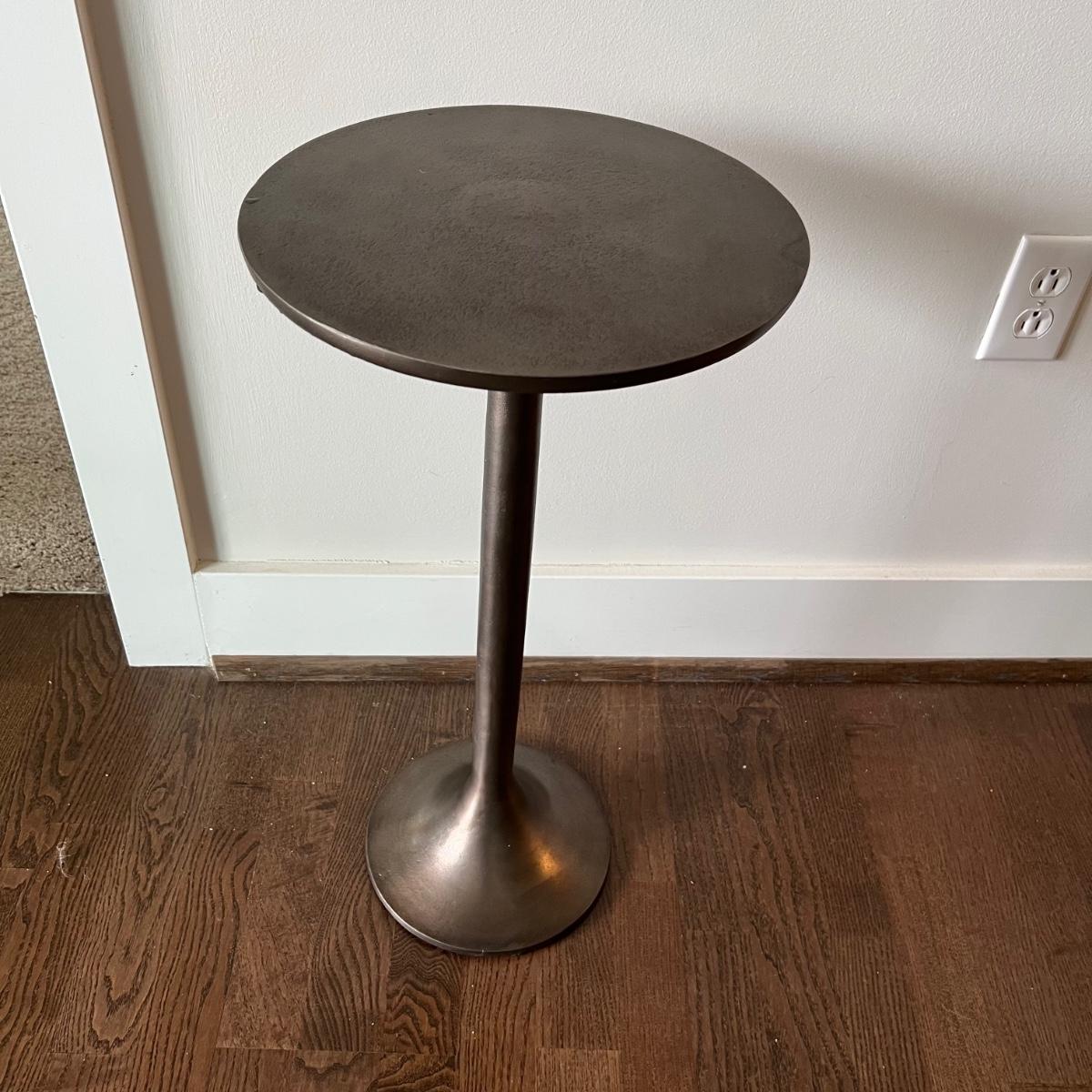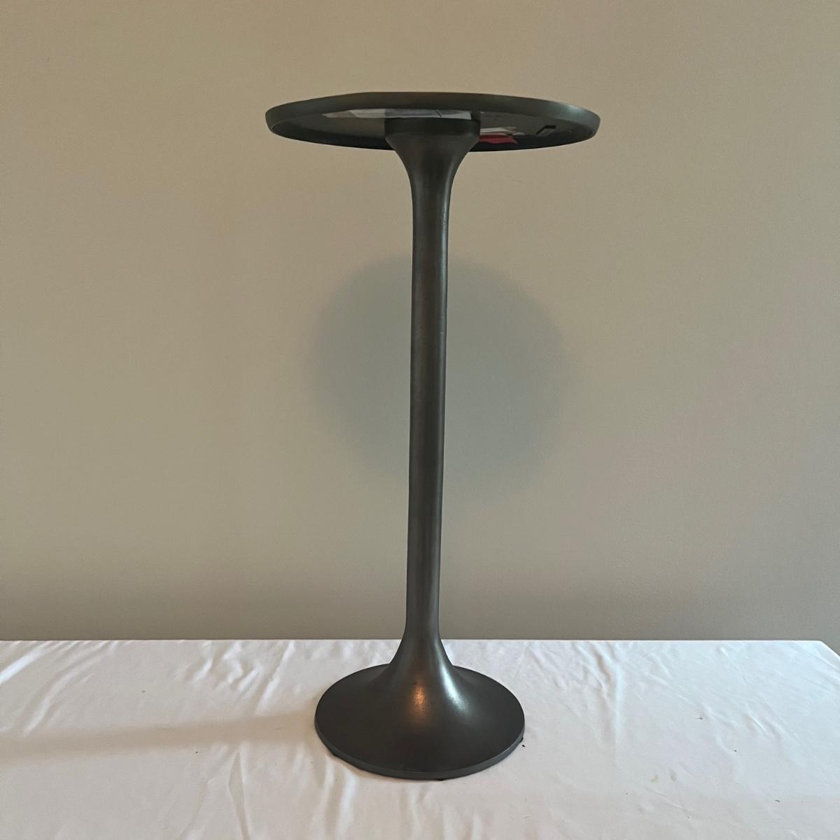 This cast aluminum table measures 12”D x 24” tall and has a textured finish. Great as a small side table, lamp or plant stand, it has an aged deep bronze color.