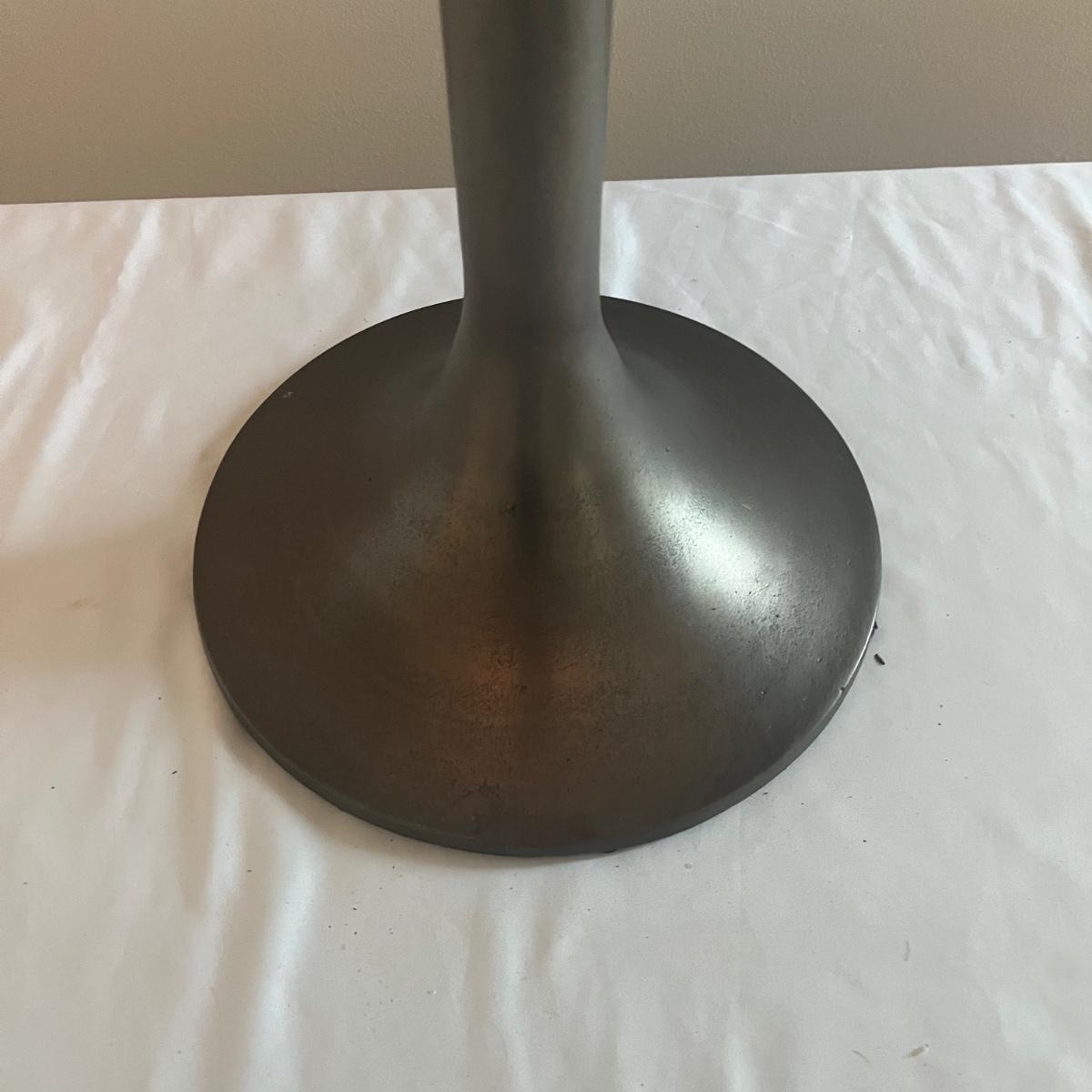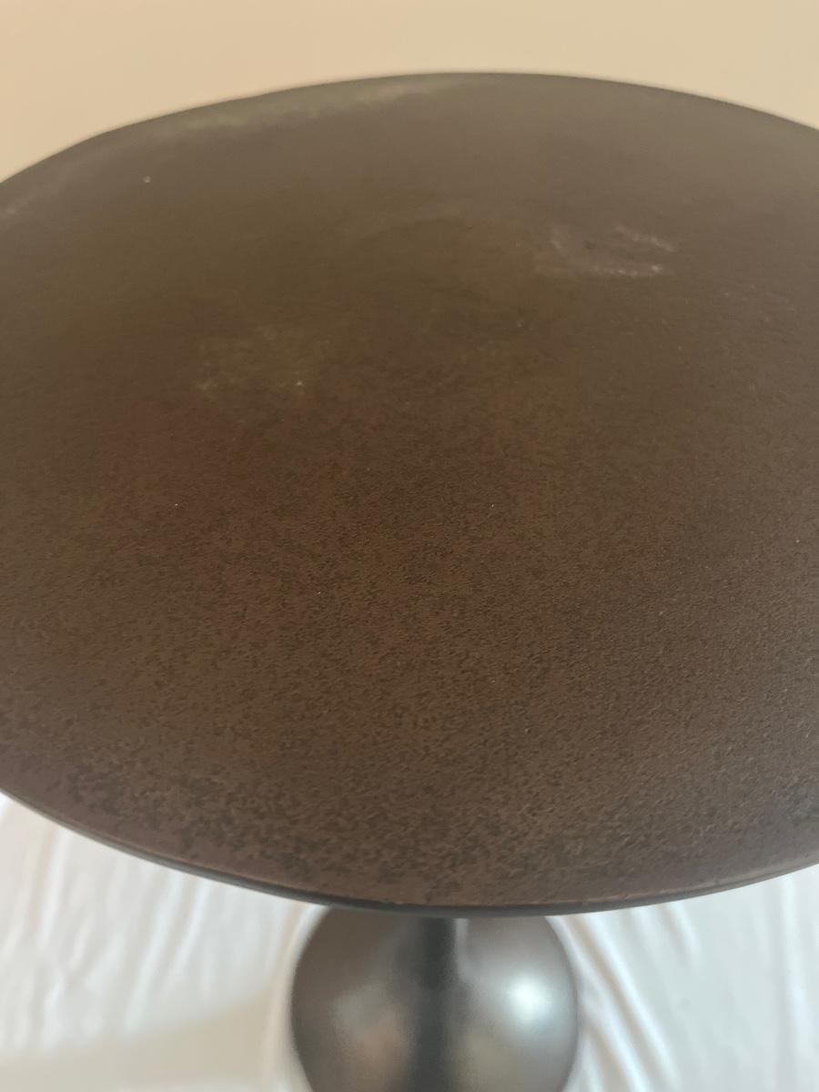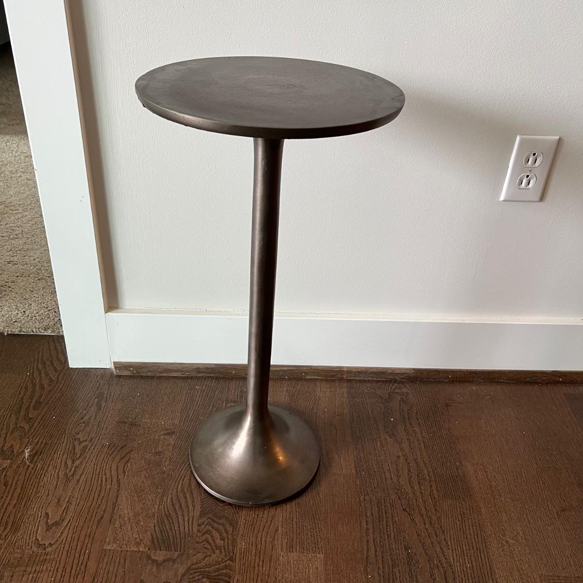 This cast aluminum table measures 12”D x 24” tall and has a textured finish. Great as a small side table, lamp or plant stand, it has an aged deep bronze color.