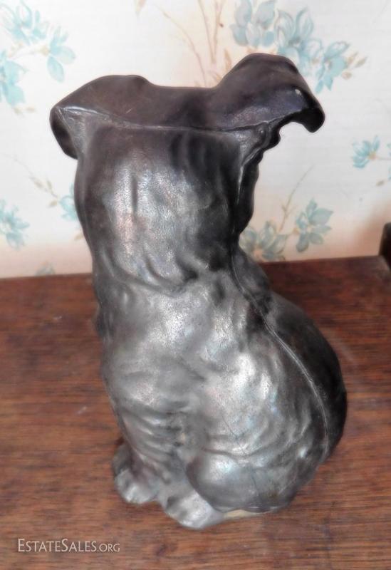 This is two of two identical cast iron terriers available at auction. Wonderful condition and nicely set together. No open or broken seams. We are not sure if this is cast brass or iron but they are extremely heavy. Bottom padding was not removed to check for markings.