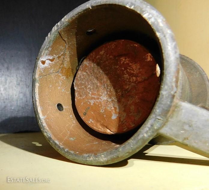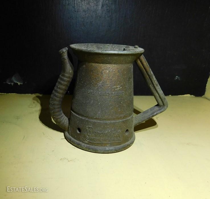 Possible salesman's sample of Brookins Oil Can. Appears to be a cast bronze or iron. Very heavy but small. Has crack at base. Please see pictures. Does not detract from piece overall..