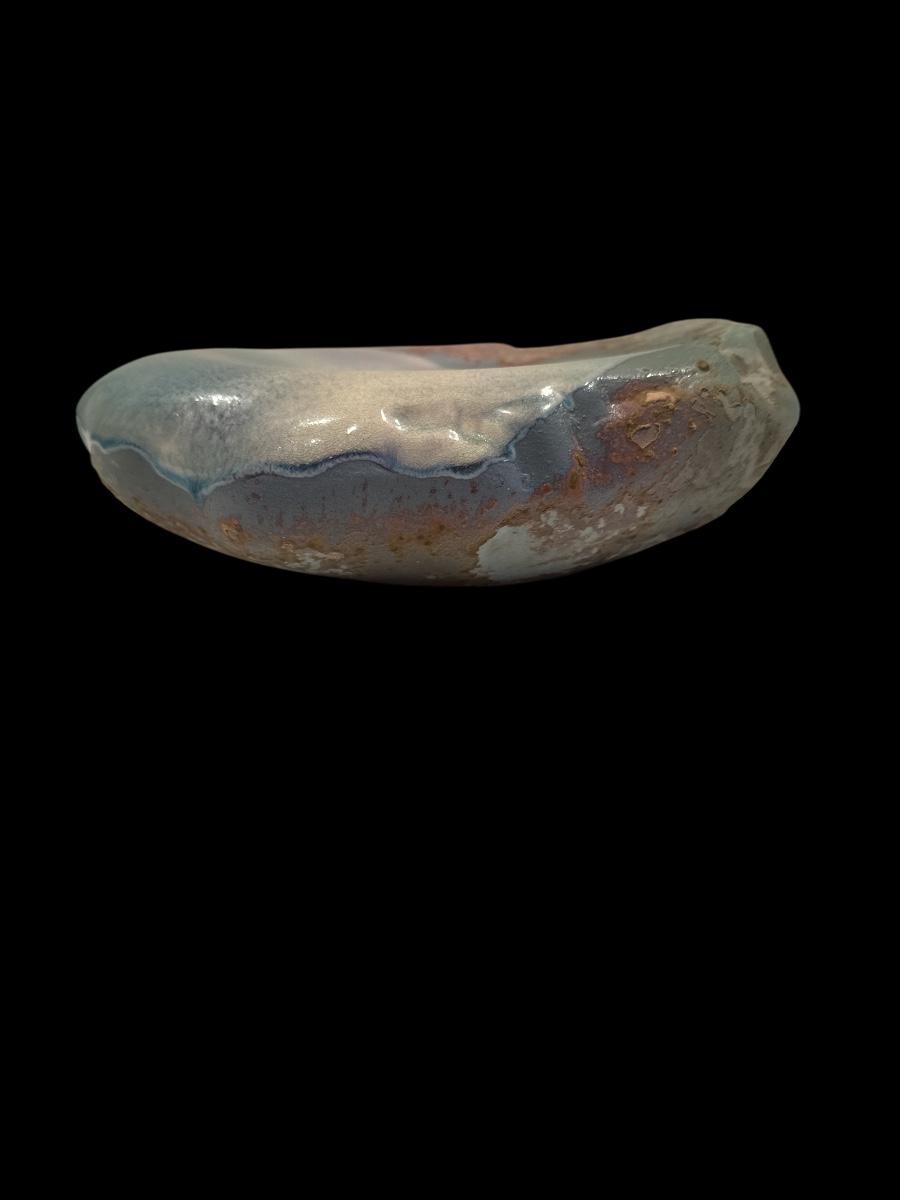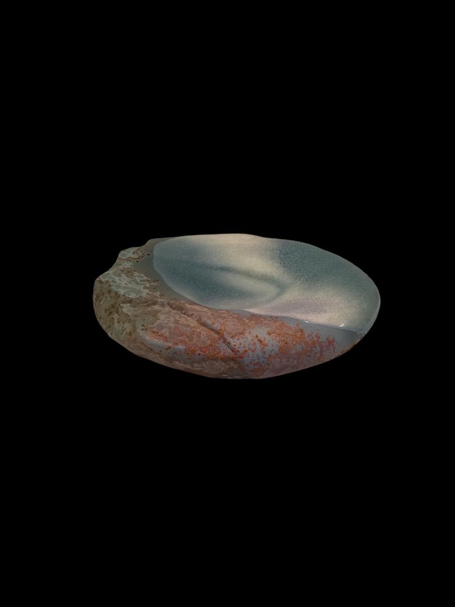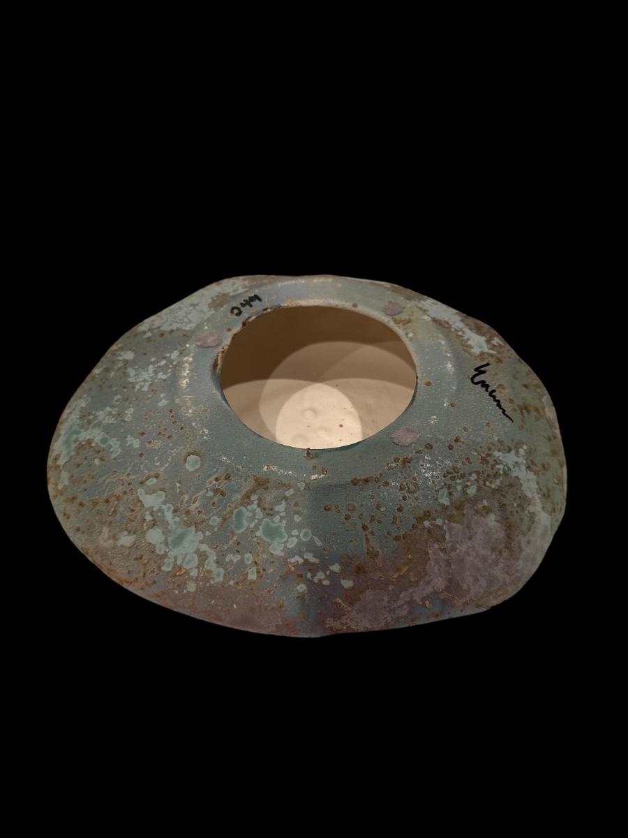 Unique handmade pottery bowl with an organic, sculptural shape. Features a soft blue-gray and rust glaze with both matte and glossy textures. The wide, shallow form has a natural, crater-like opening. Signed by the artist on the base. A beautiful decorative or collectible piece.