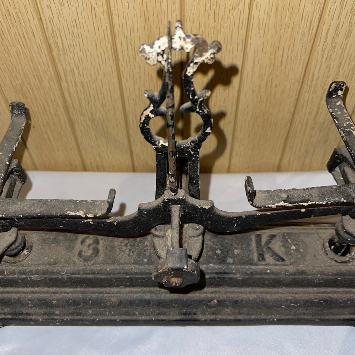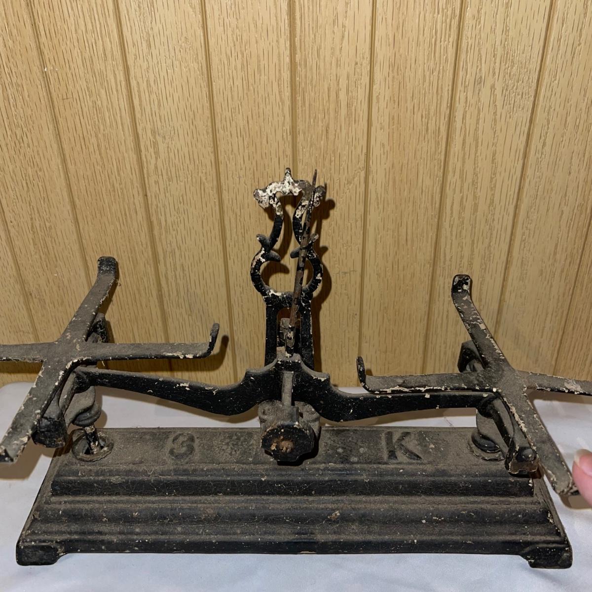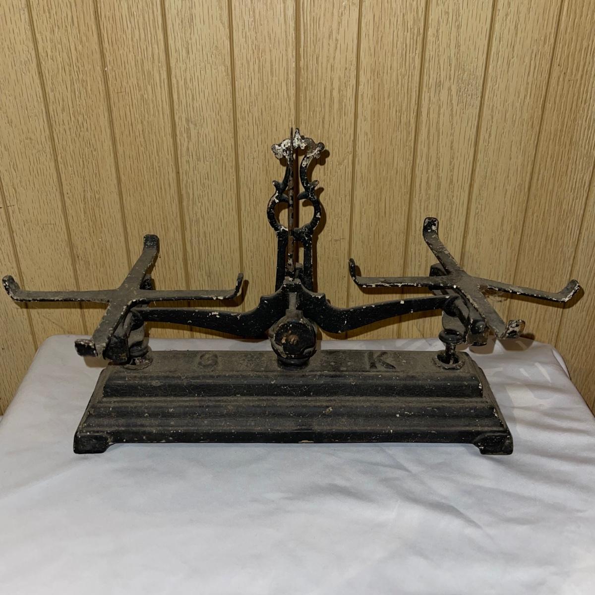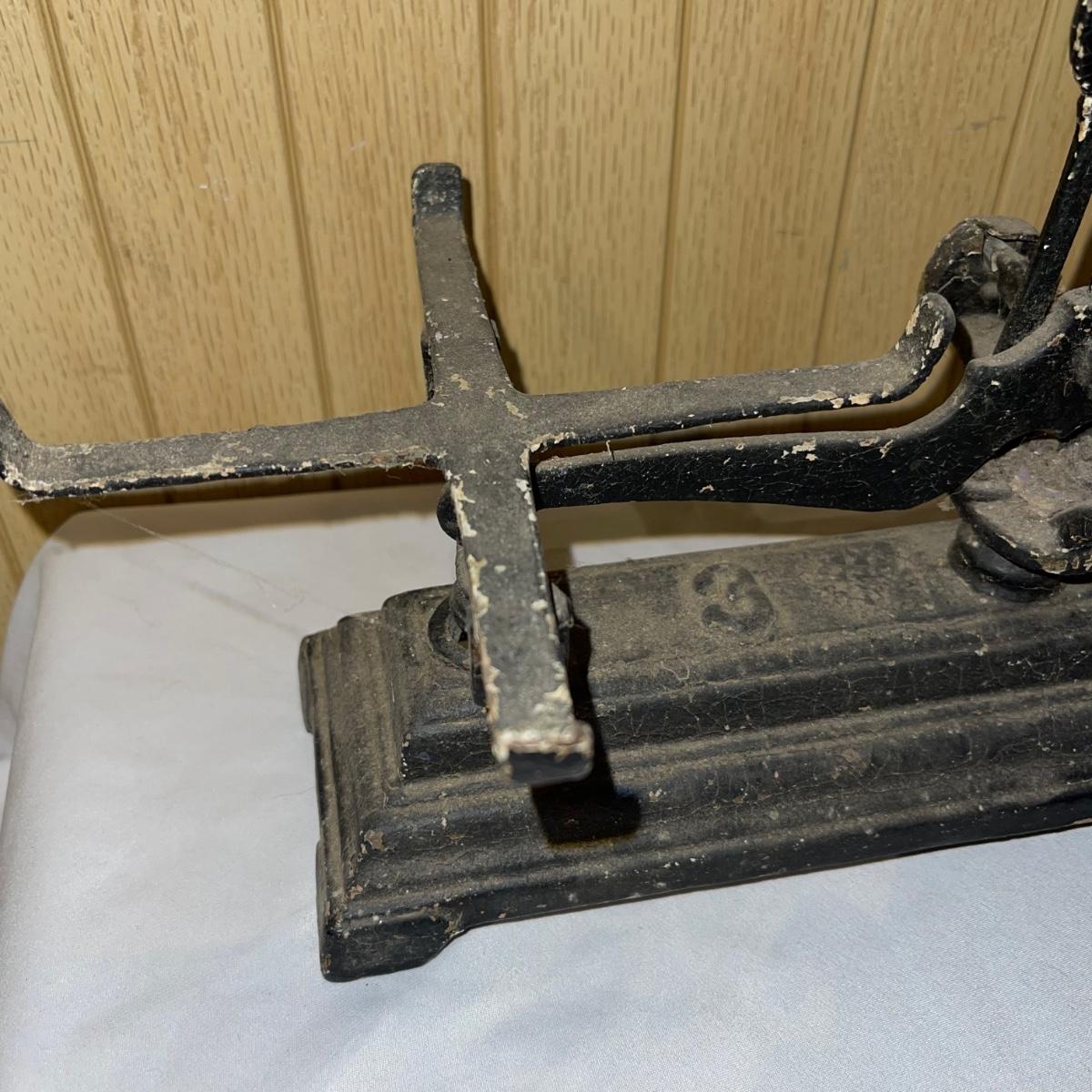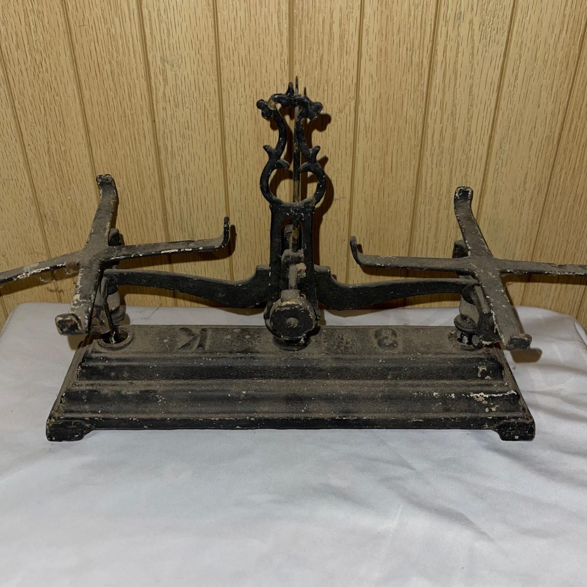 Cast iron 3Kg scale. The base measures 12.5” long. It is missing it’s bowls/trays if it originally had them. The only words/markings on the item is the number 3 and the letter K to indicate the maximum scale weight.