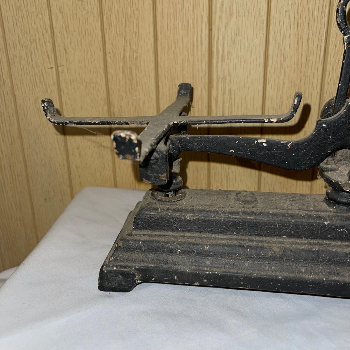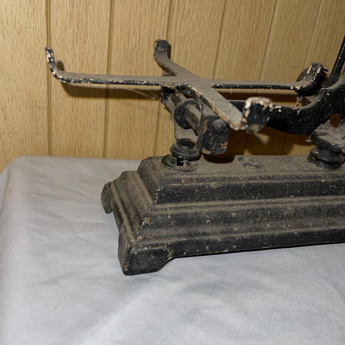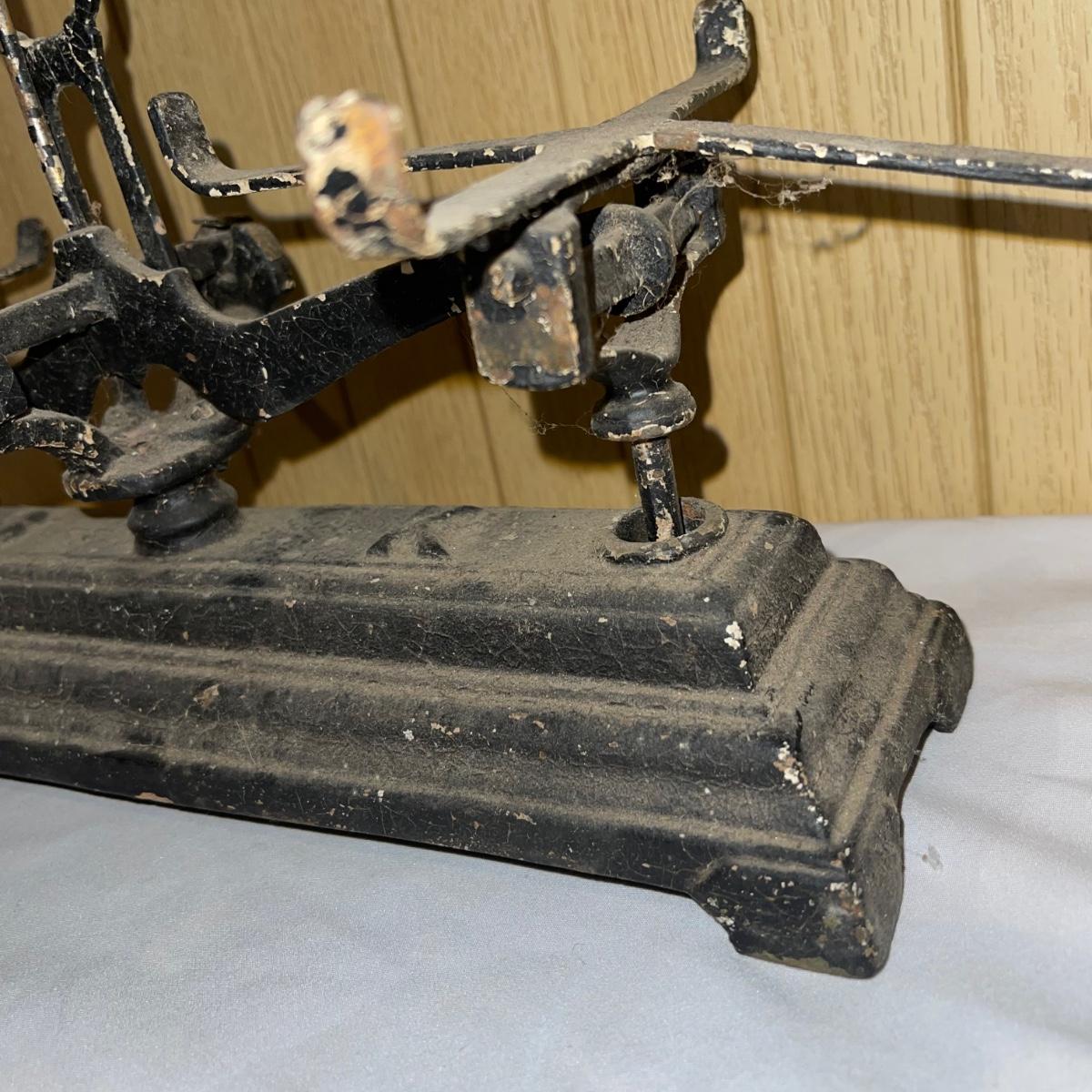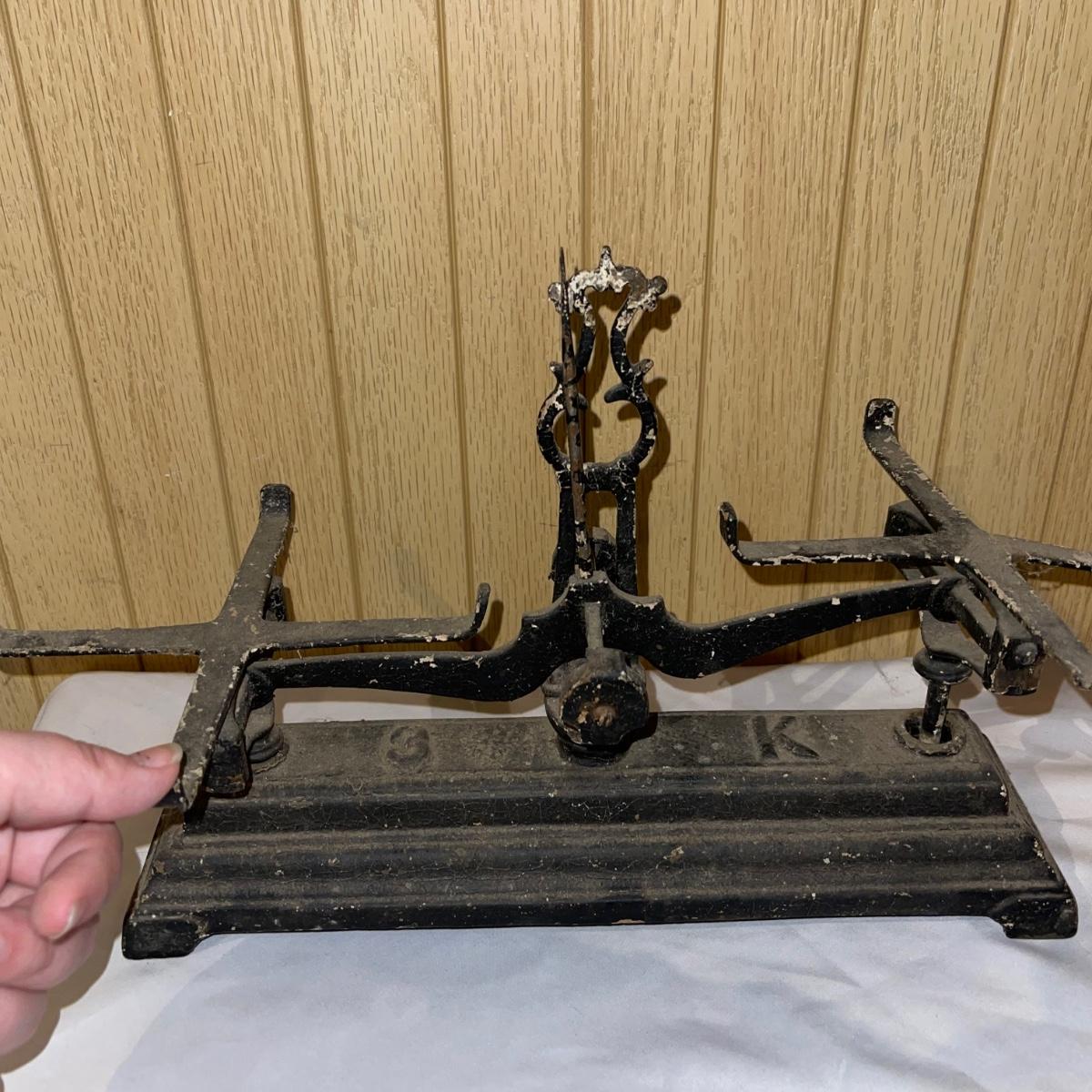 Cast iron 3Kg scale. The base measures 12.5” long. It is missing it’s bowls/trays if it originally had them. The only words/markings on the item is the number 3 and the letter K to indicate the maximum scale weight.