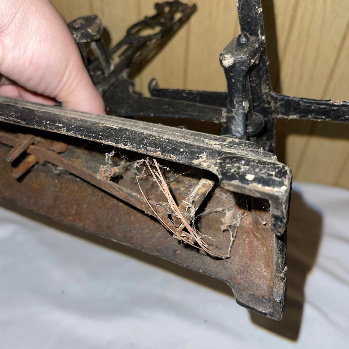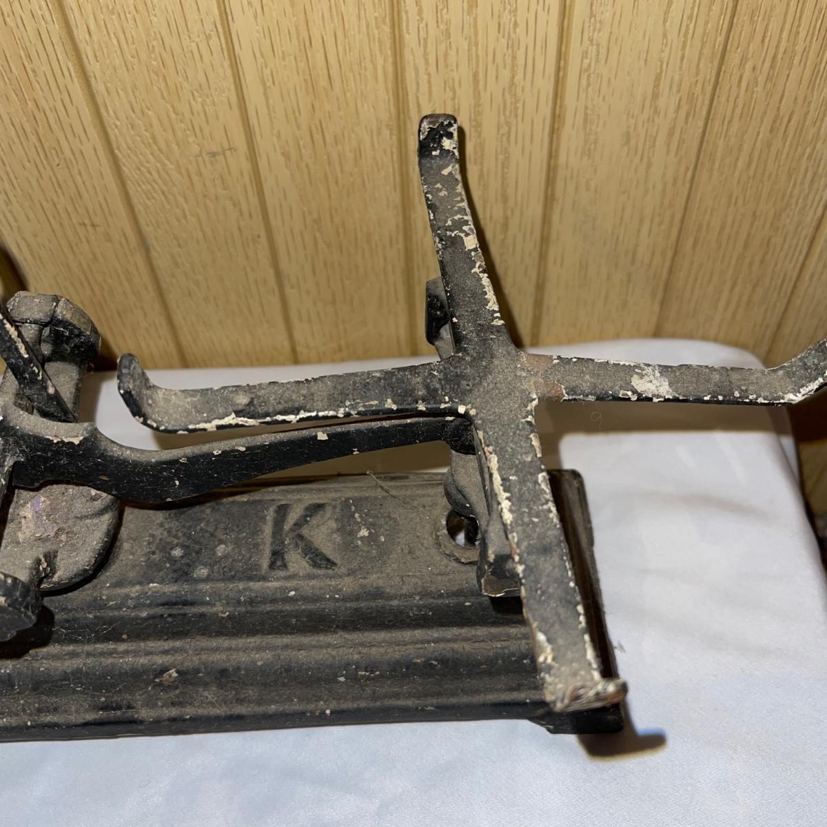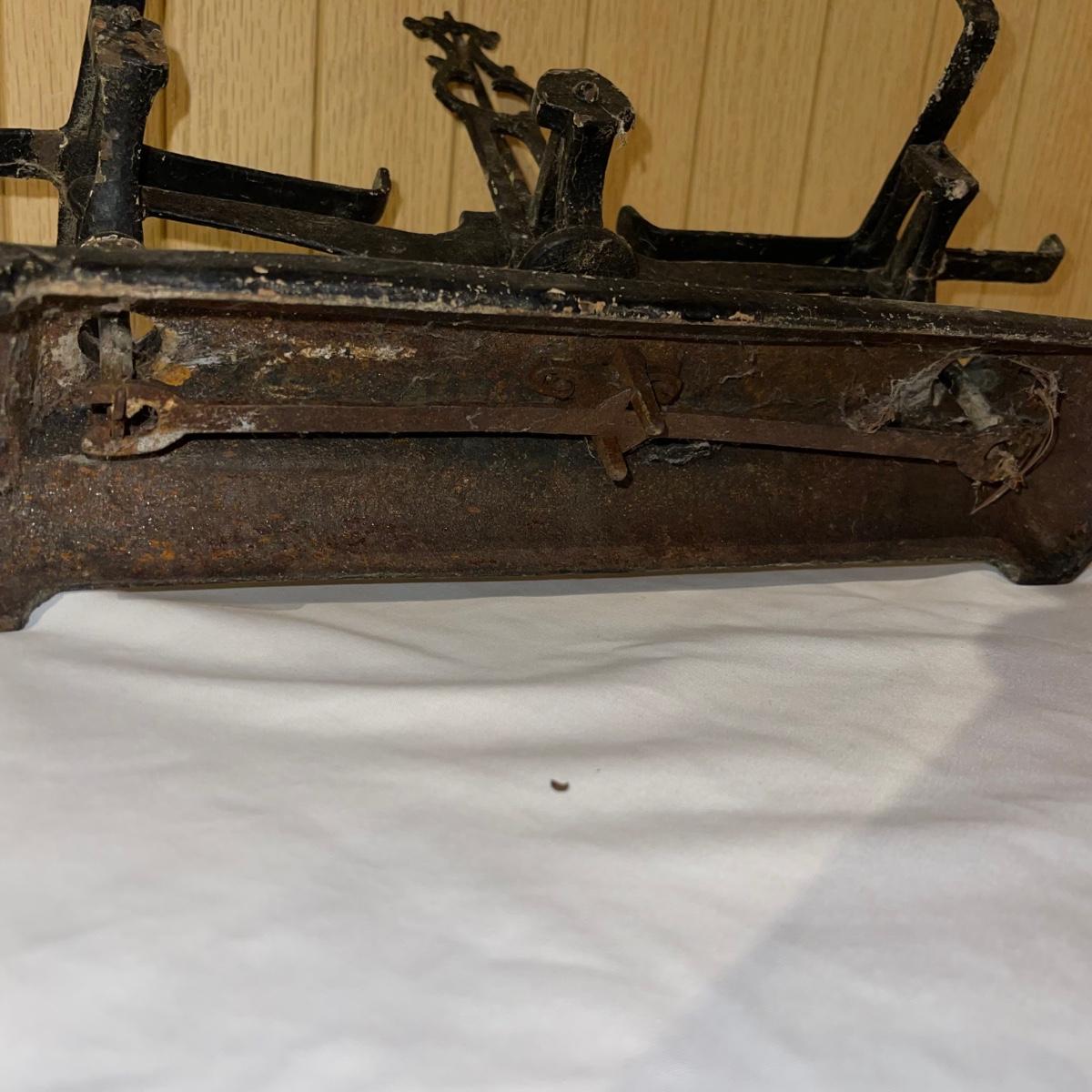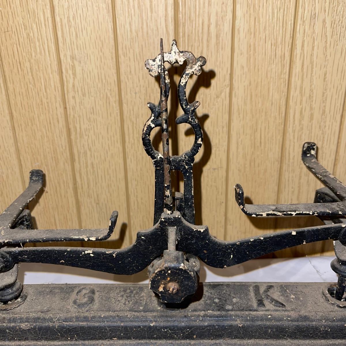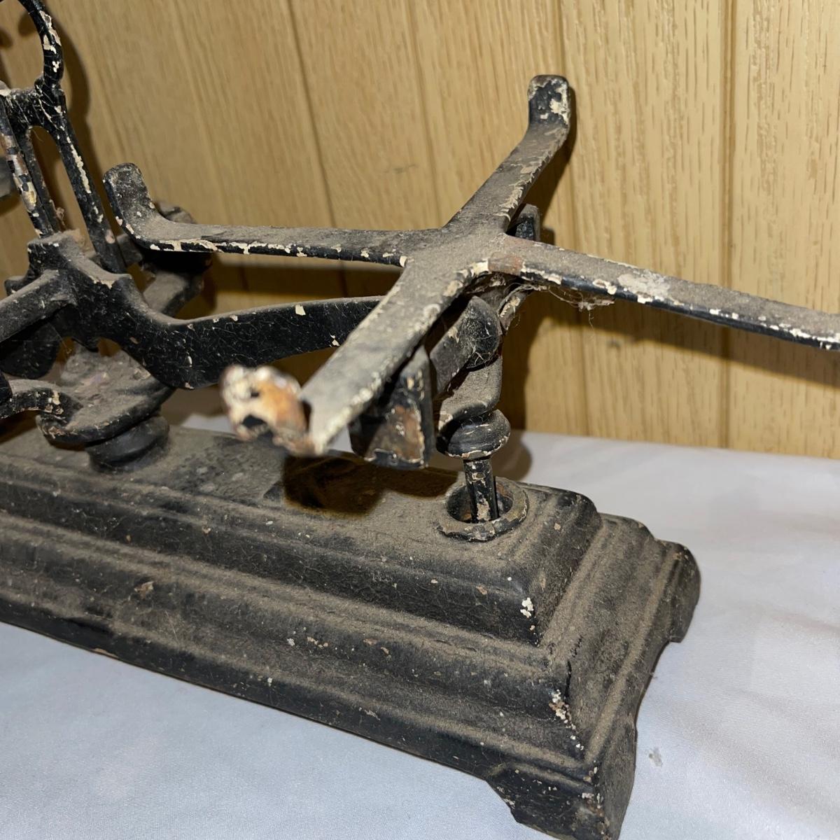 Cast iron 3Kg scale. The base measures 12.5” long. It is missing it’s bowls/trays if it originally had them. The only words/markings on the item is the number 3 and the letter K to indicate the maximum scale weight.