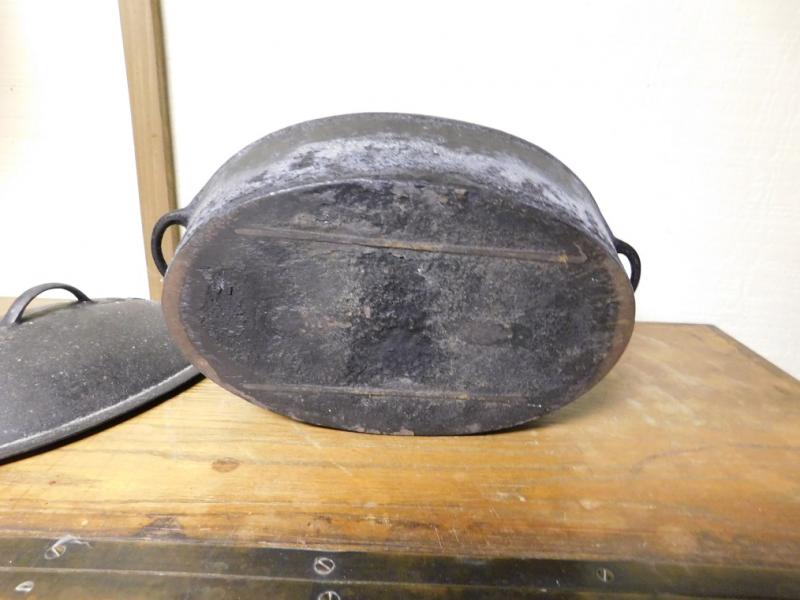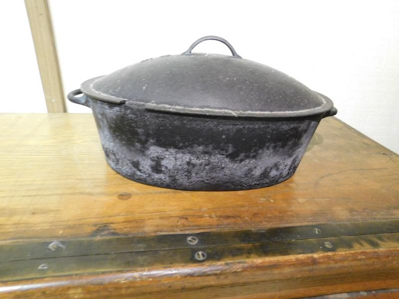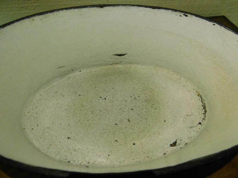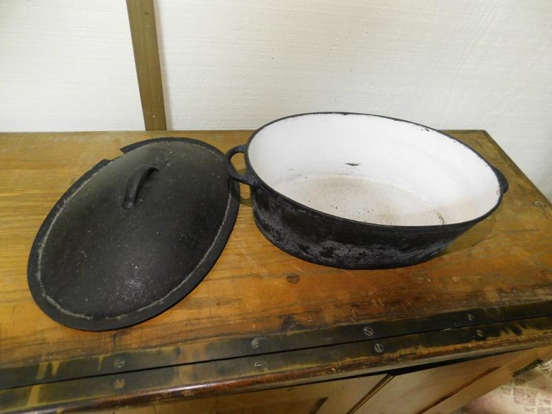 Cast Iron and Enamel Lined Roaster has some use wear.