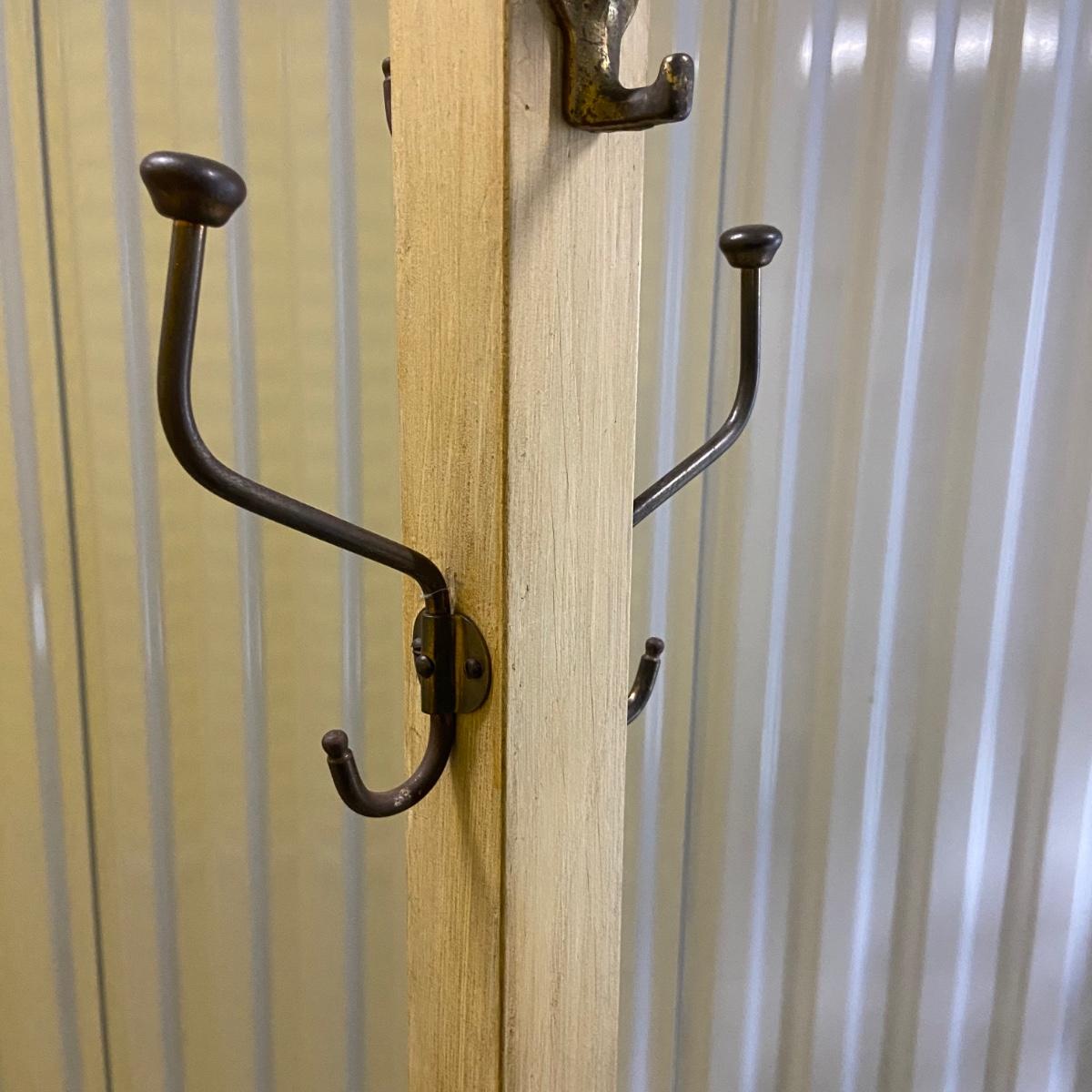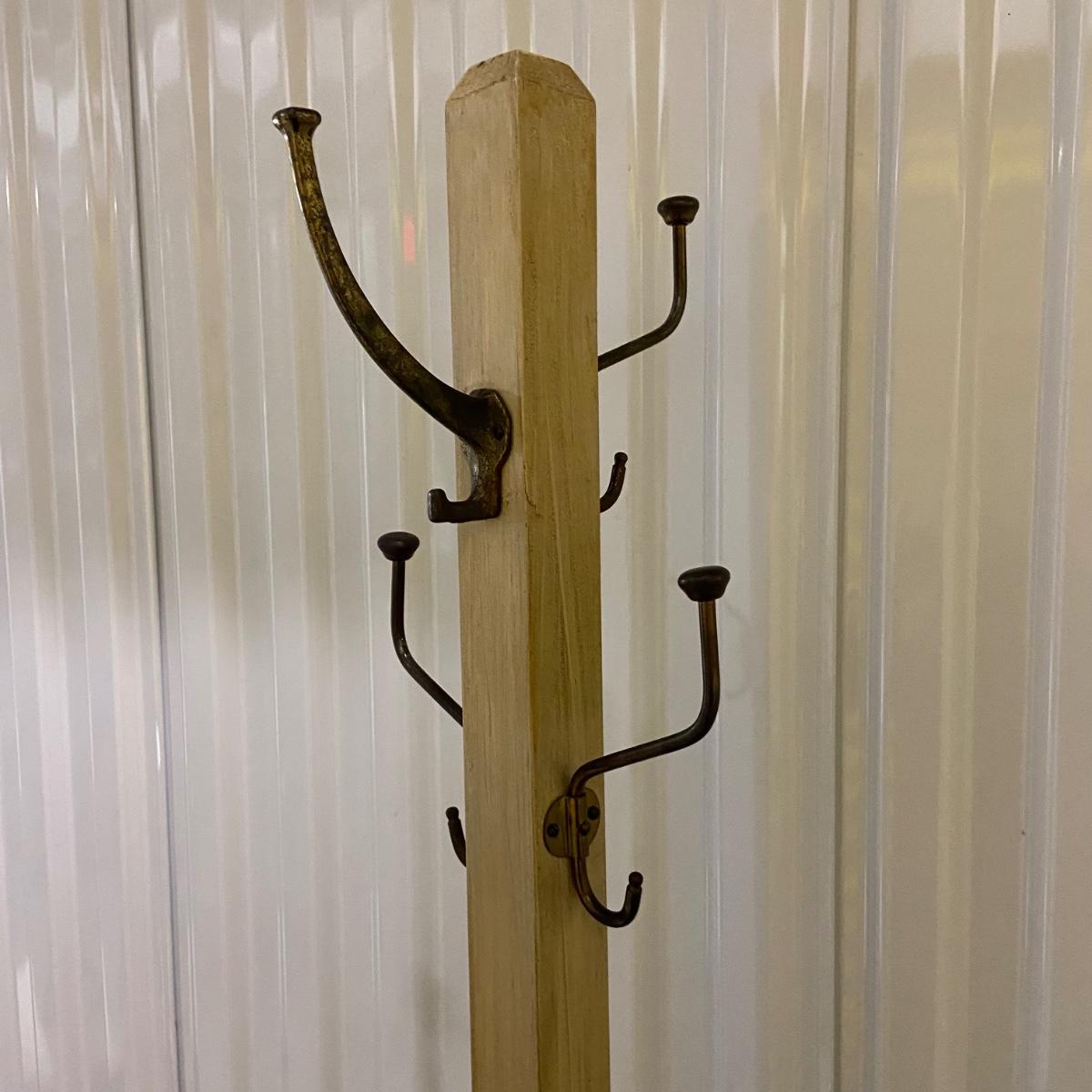 This lot contains a coat tree with an intricate cast iron base and a wooden beam. There are four hangers and each one has two hooks. The base is 16.25”D and the item stands 66”H. Local pickup only.