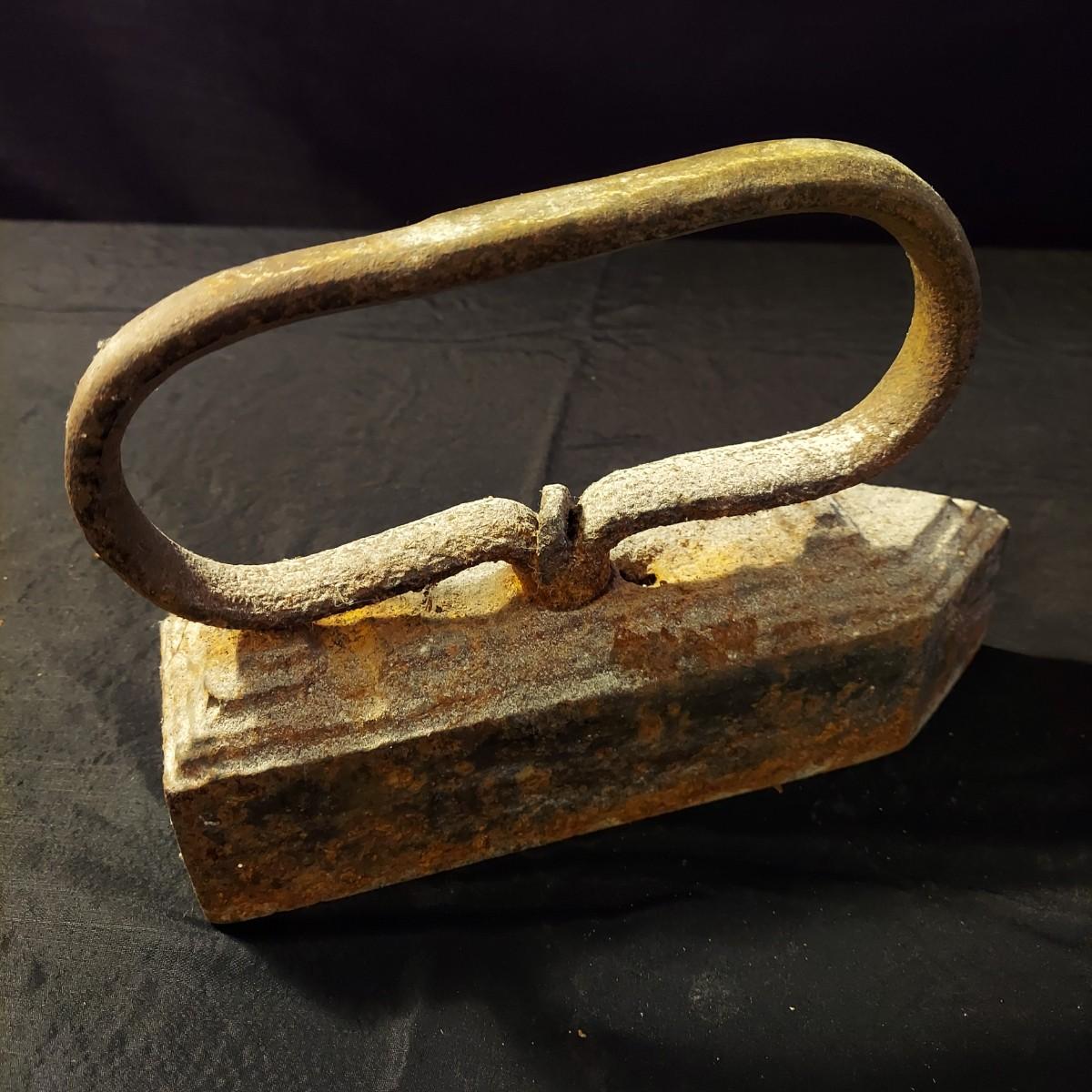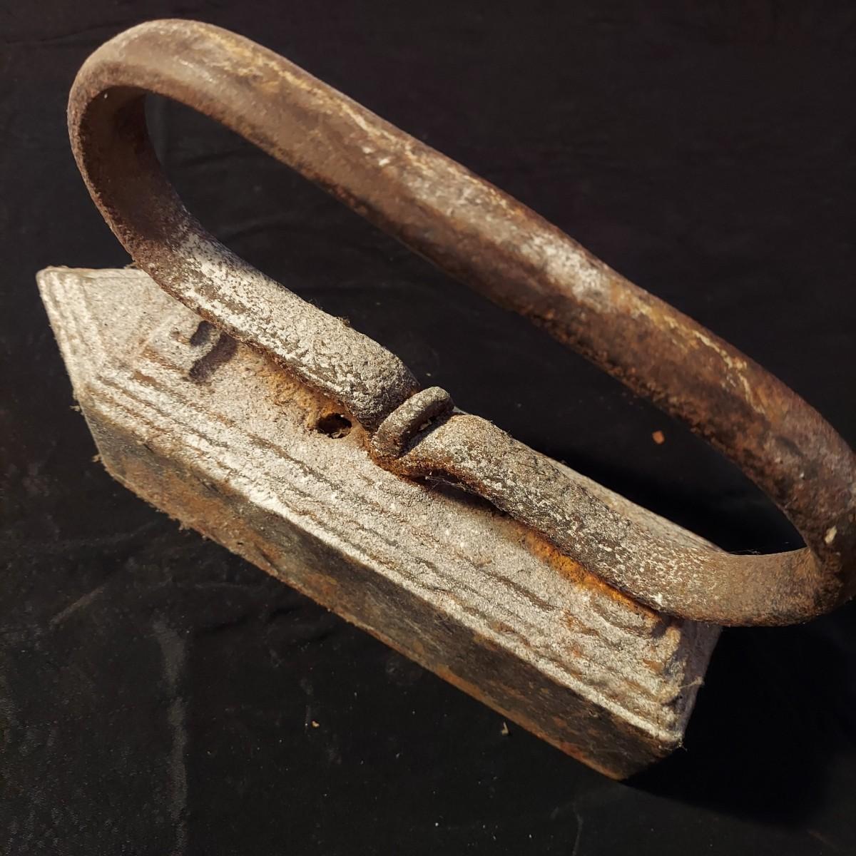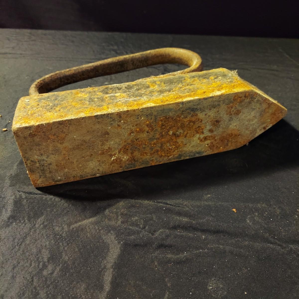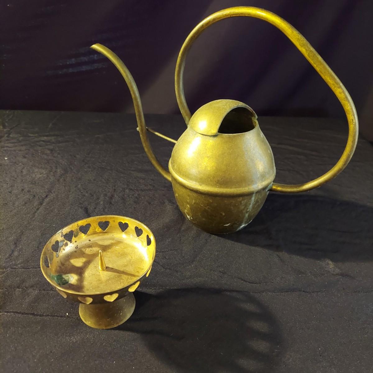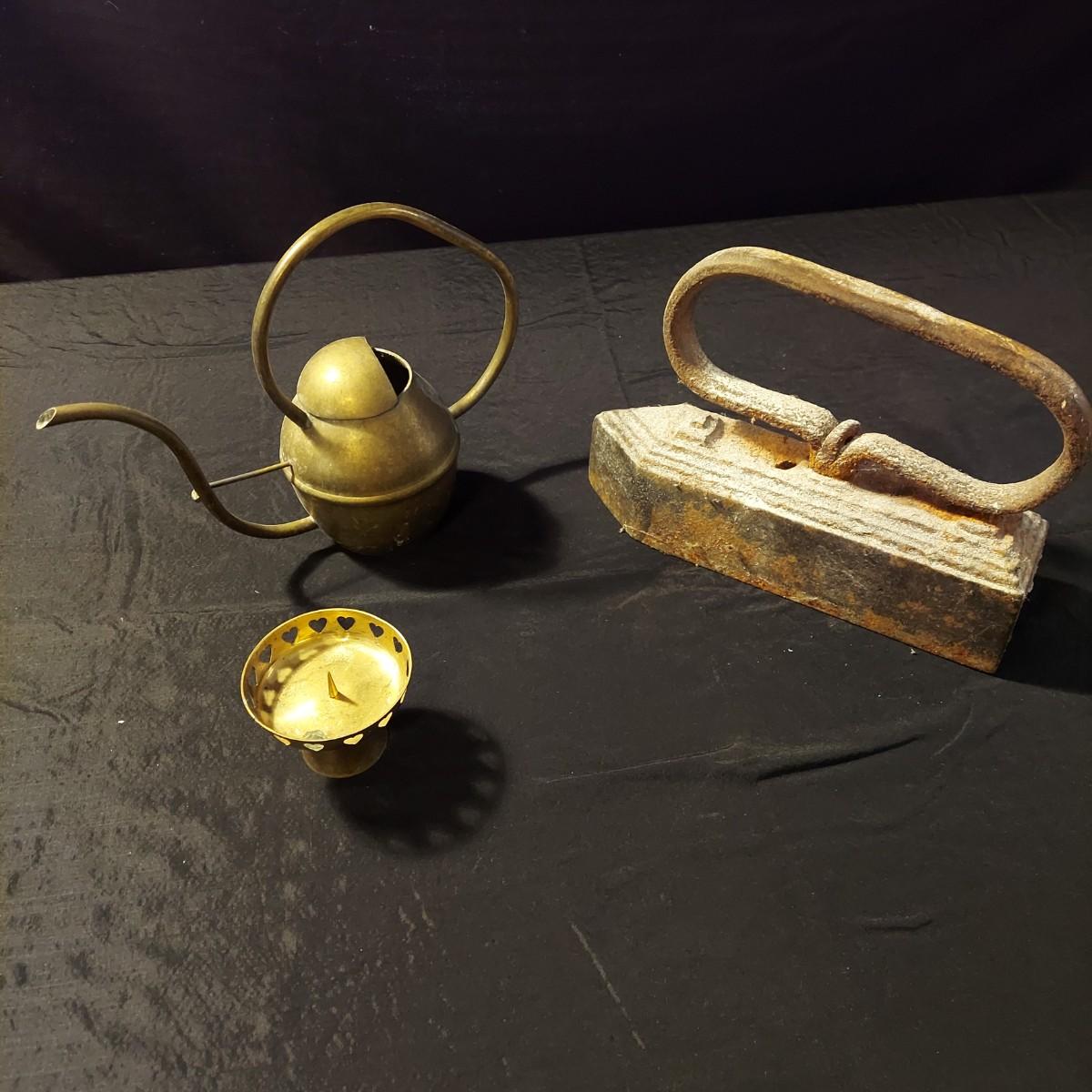 Lot includes an antique iron that is very heavy and appears to be cast iron. It measures 10” x 3” x 7"H. It has significant rust and oxidation. Plus a brass watering can and candle holder. Please see photos for details. Local Pickup Only