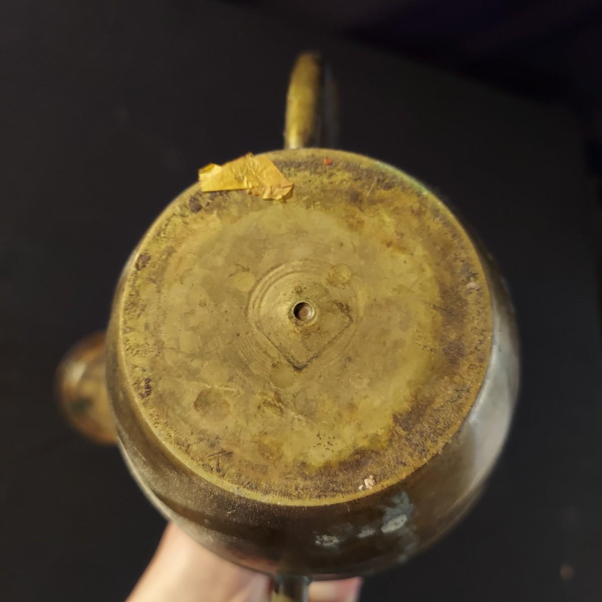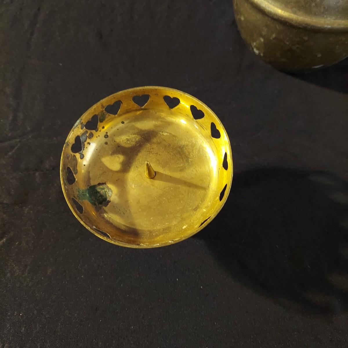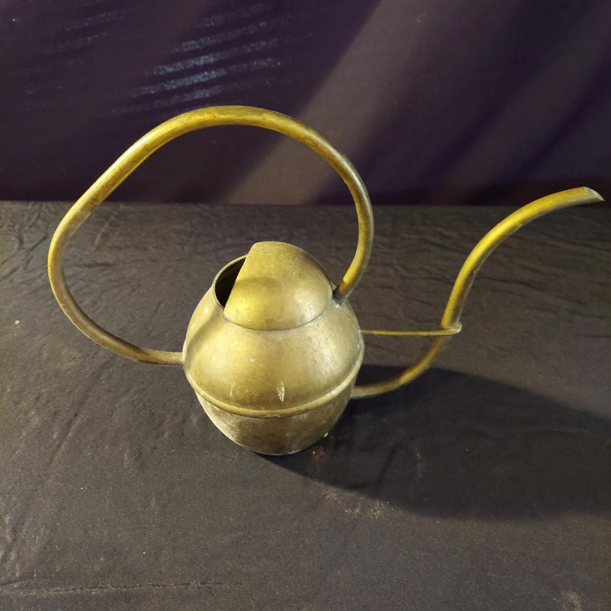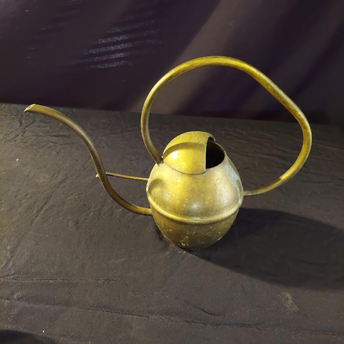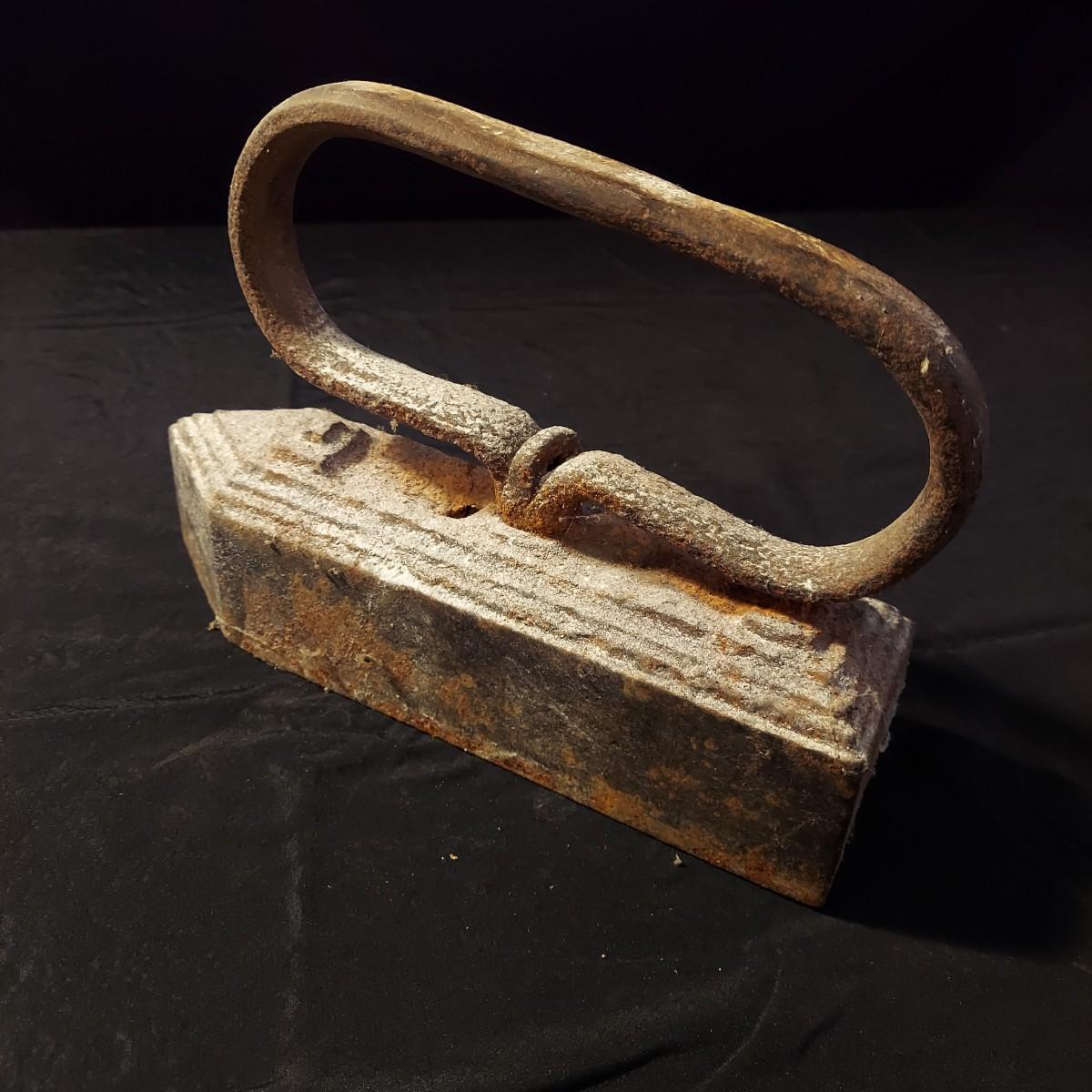 Lot includes an antique iron that is very heavy and appears to be cast iron. It measures 10” x 3” x 7"H. It has significant rust and oxidation. Plus a brass watering can and candle holder. Please see photos for details. Local Pickup Only