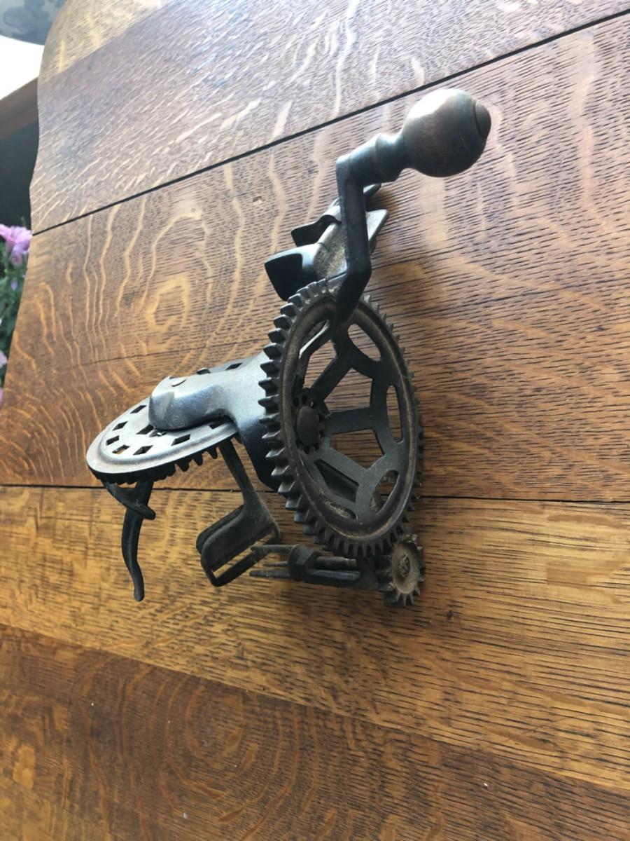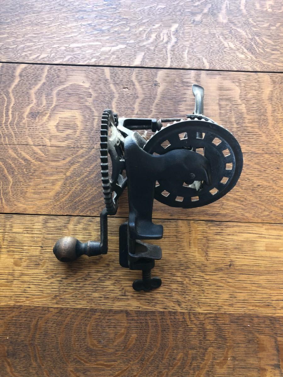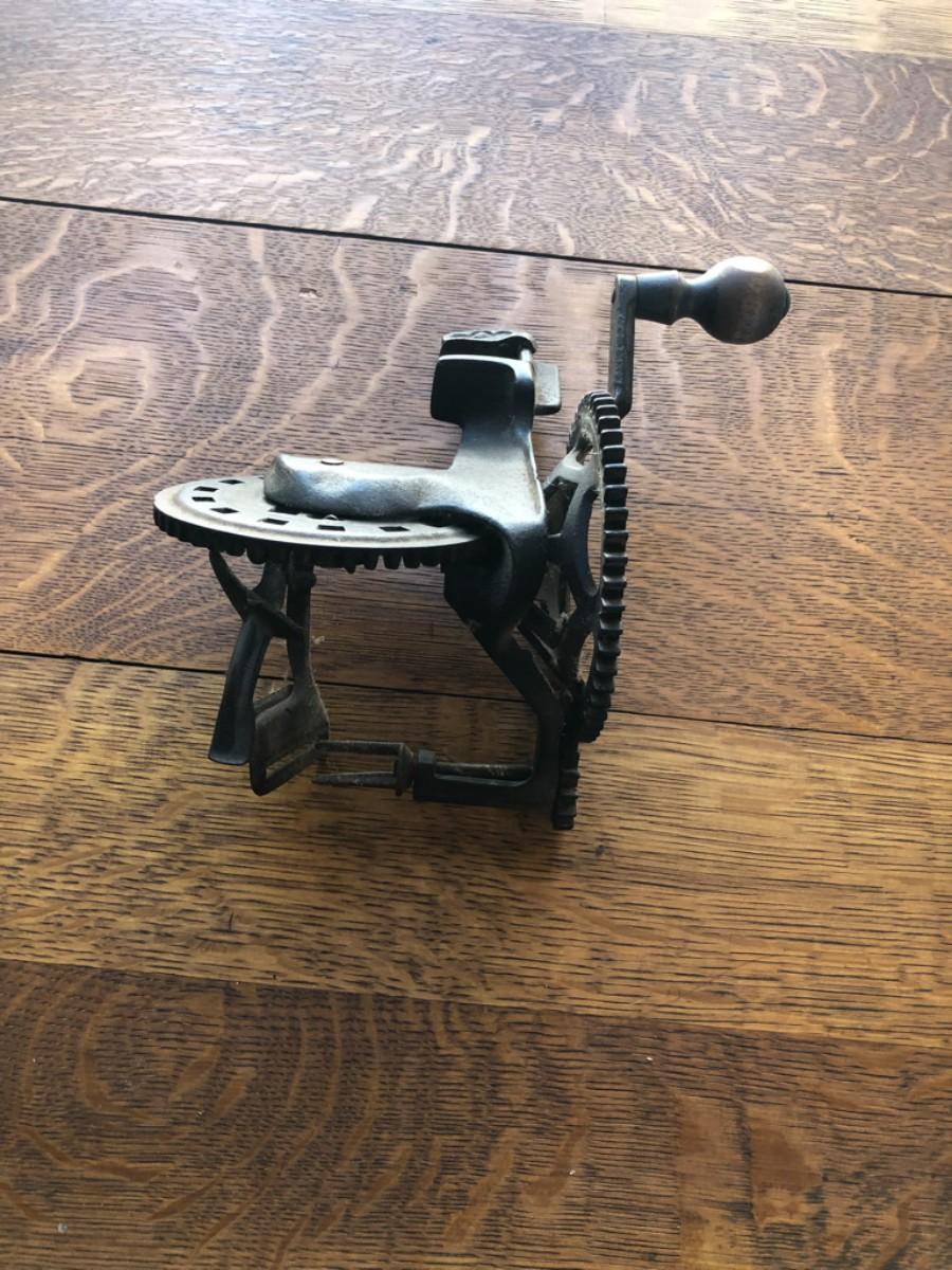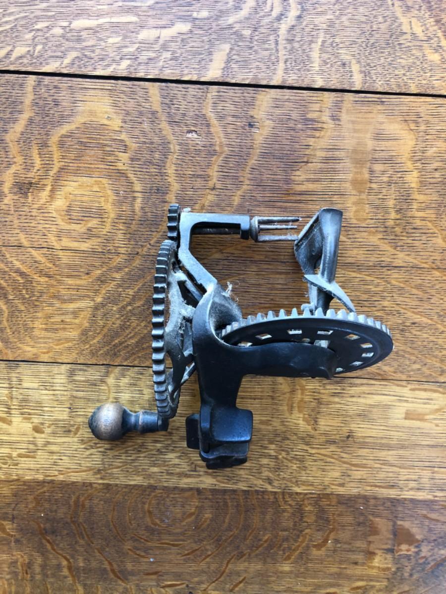This is a cast iron apple peeler by C.E. Hudson, Leominster MA.