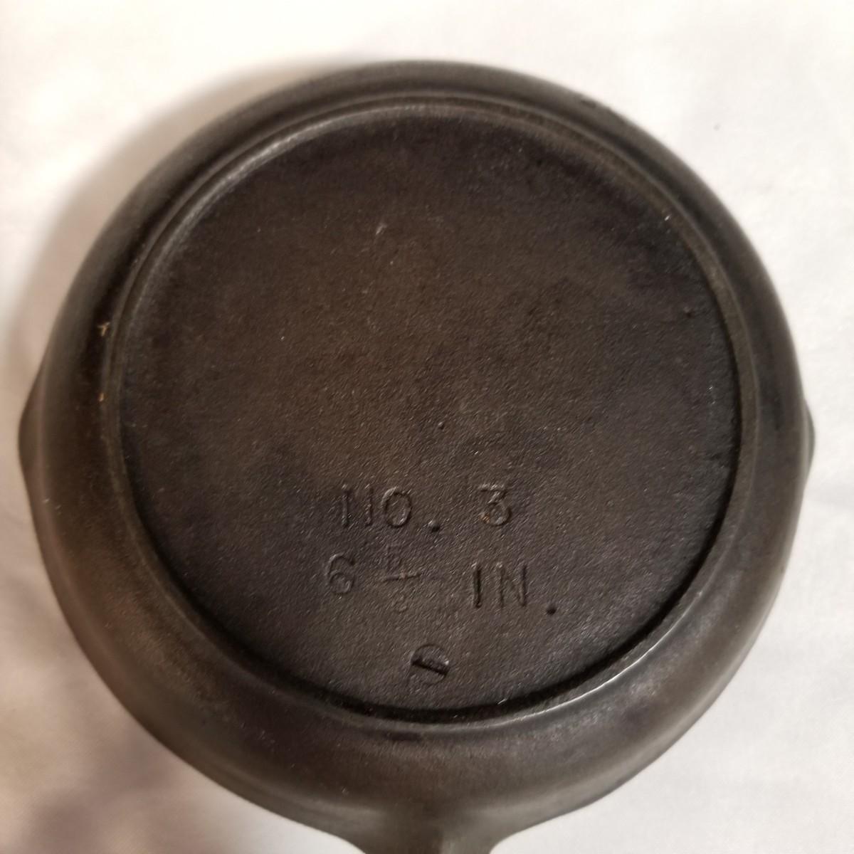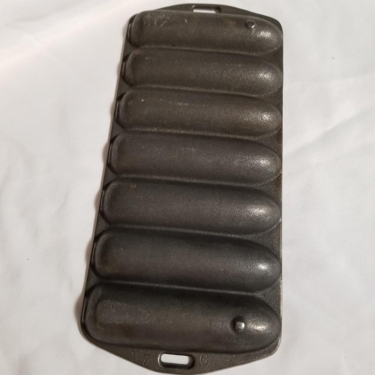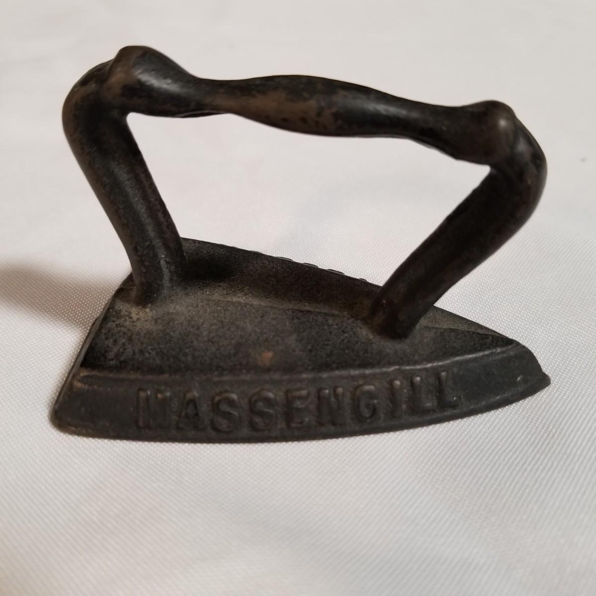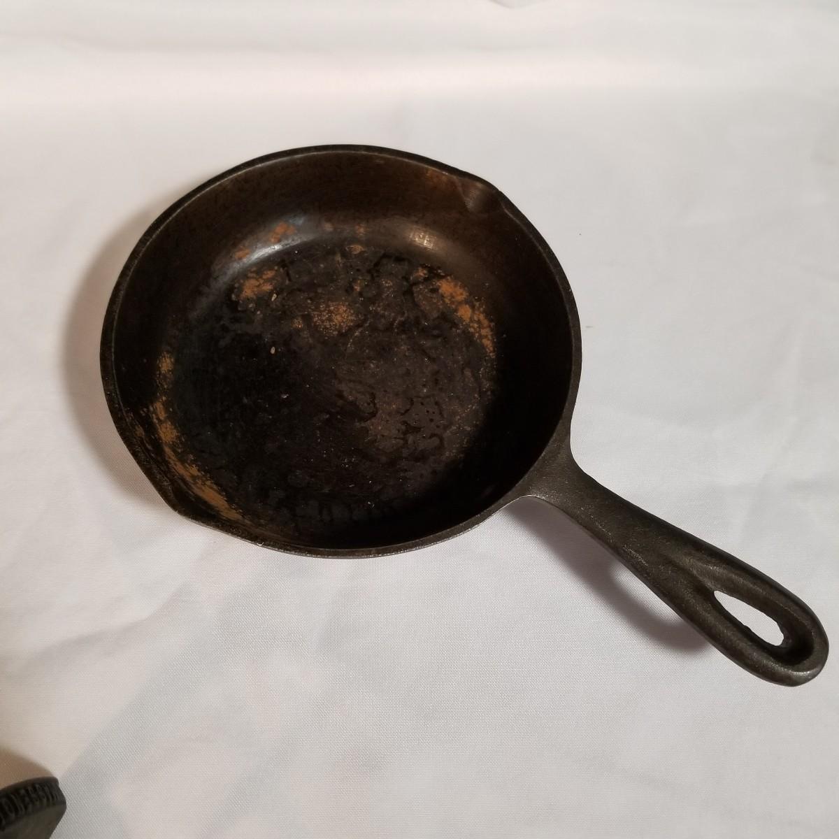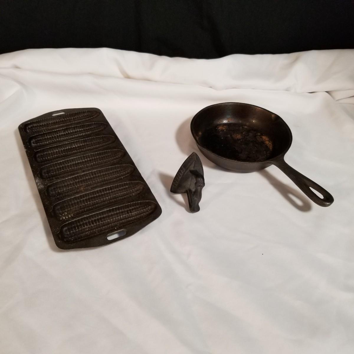 Three cast iron pieces. One 6" round fry pan, a cornbread pan 6" x12.5", and a 1920's Massengill Saferon salesman sample sad iron, 3"x3"x2". All items in good condition. See photos for details. Shipping available.