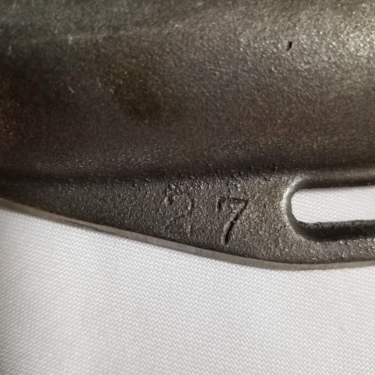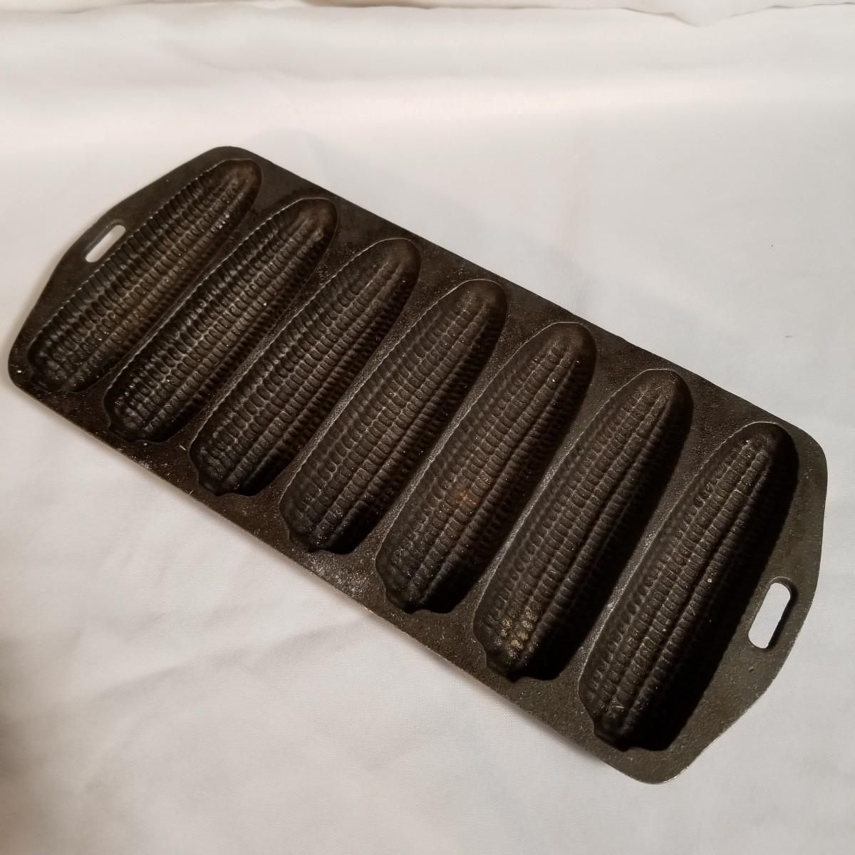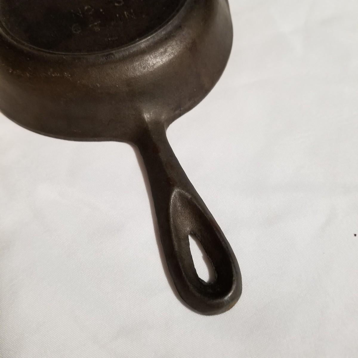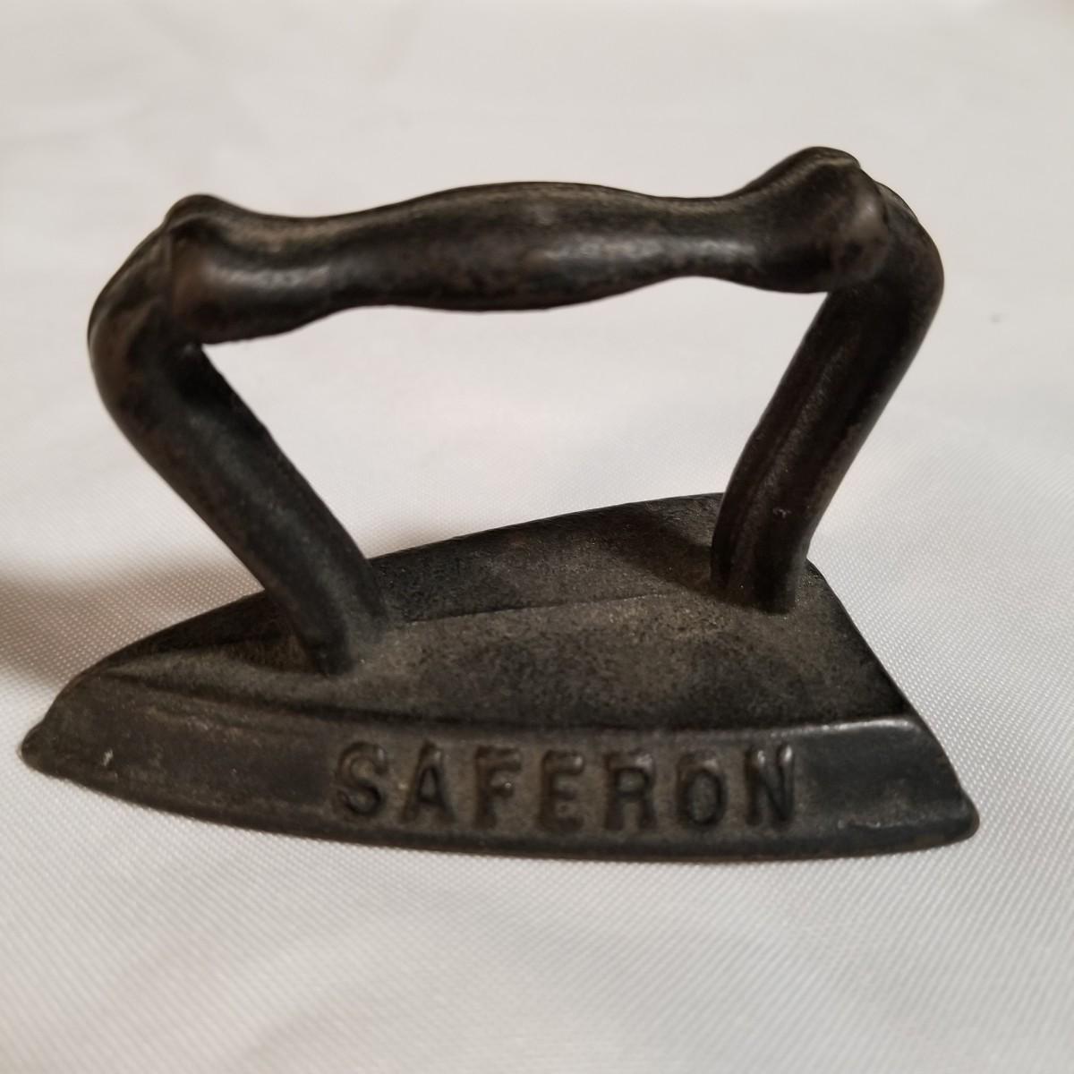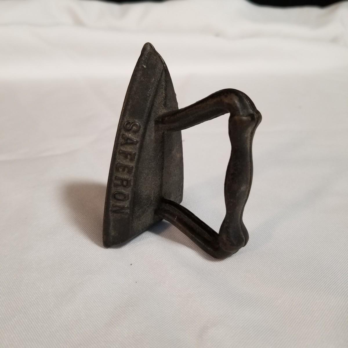 Three cast iron pieces. One 6" round fry pan, a cornbread pan 6" x12.5", and a 1920's Massengill Saferon salesman sample sad iron, 3"x3"x2". All items in good condition. See photos for details. Shipping available.