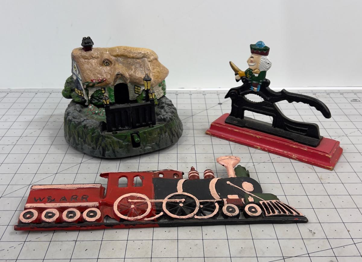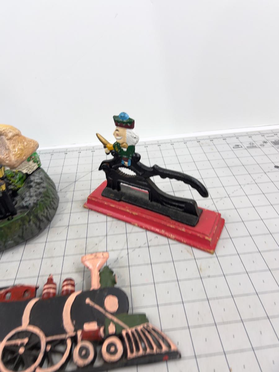 Cast Iron: Bank, Nut Cracker and a Wall Plaque