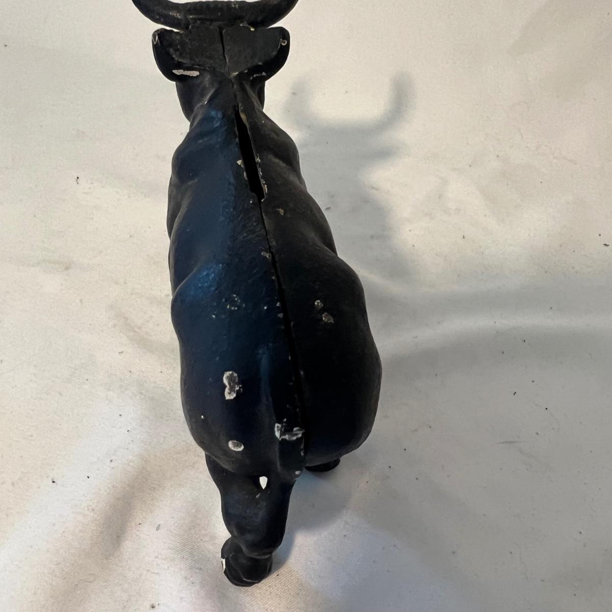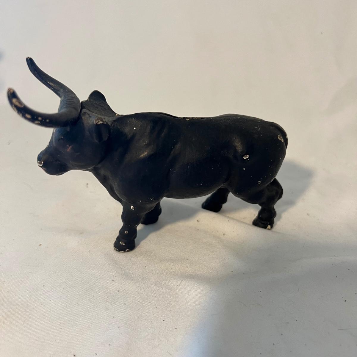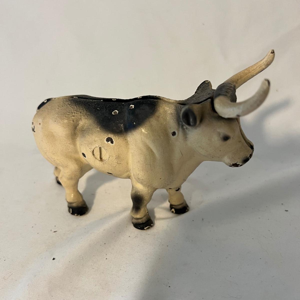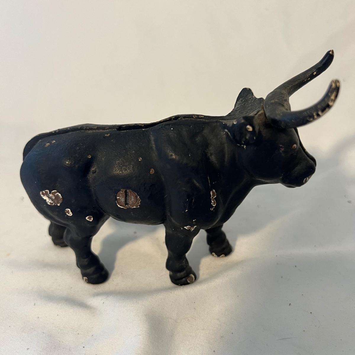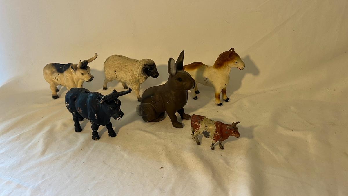 Five cast iron animal banks and one small cast iron steer. The animals and similarly sized and measure approximately 5” x 2” x 3.5”H.