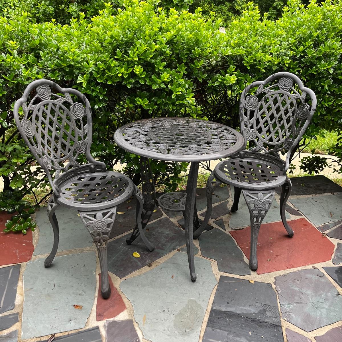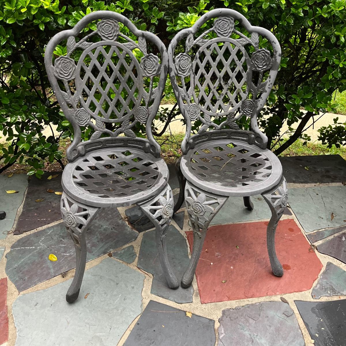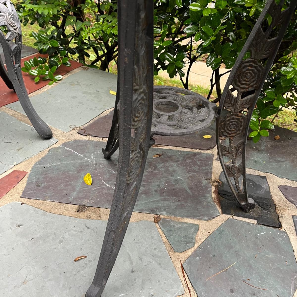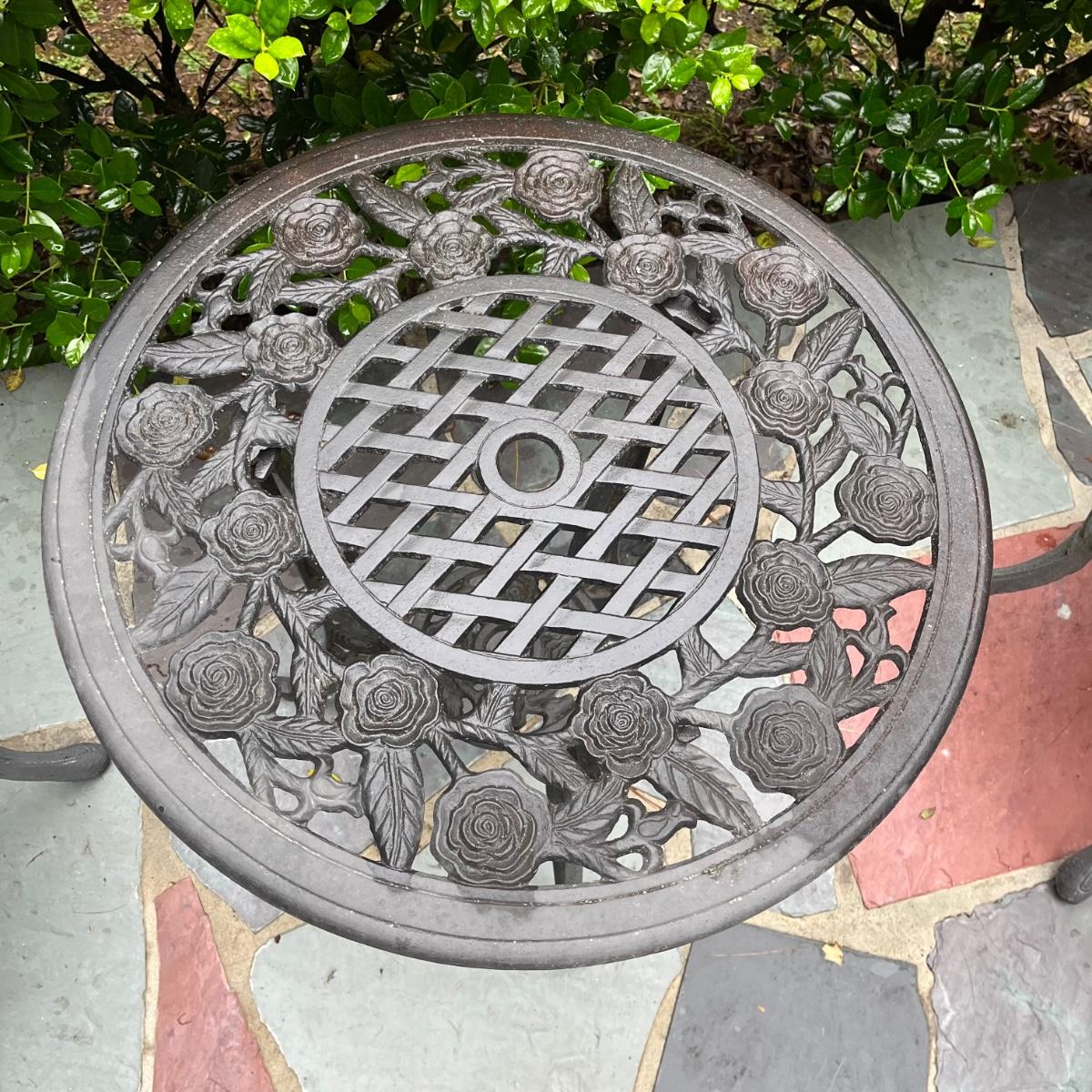 Lot contains a cast iron bistro set that includes two chairs and a table, all with a rose motif. Table measures 24.5”D x 27” tall and chairs measure 17” x 17” x 36” with a 17.5” seat height.