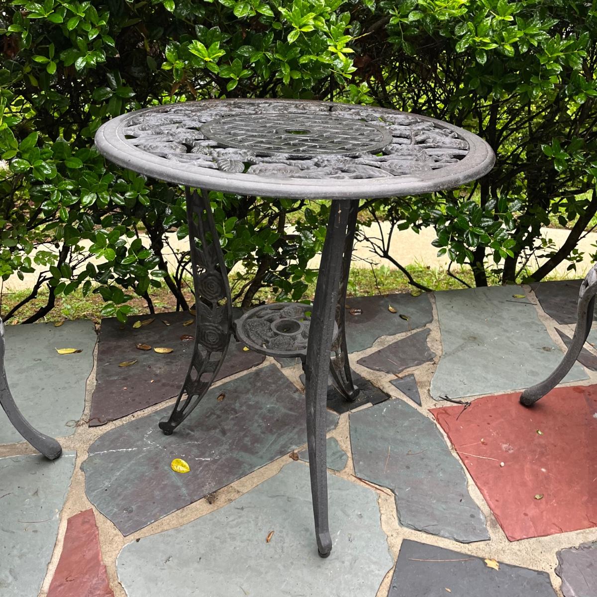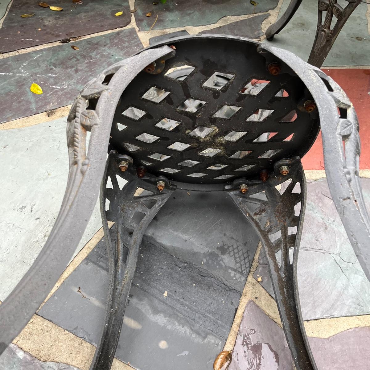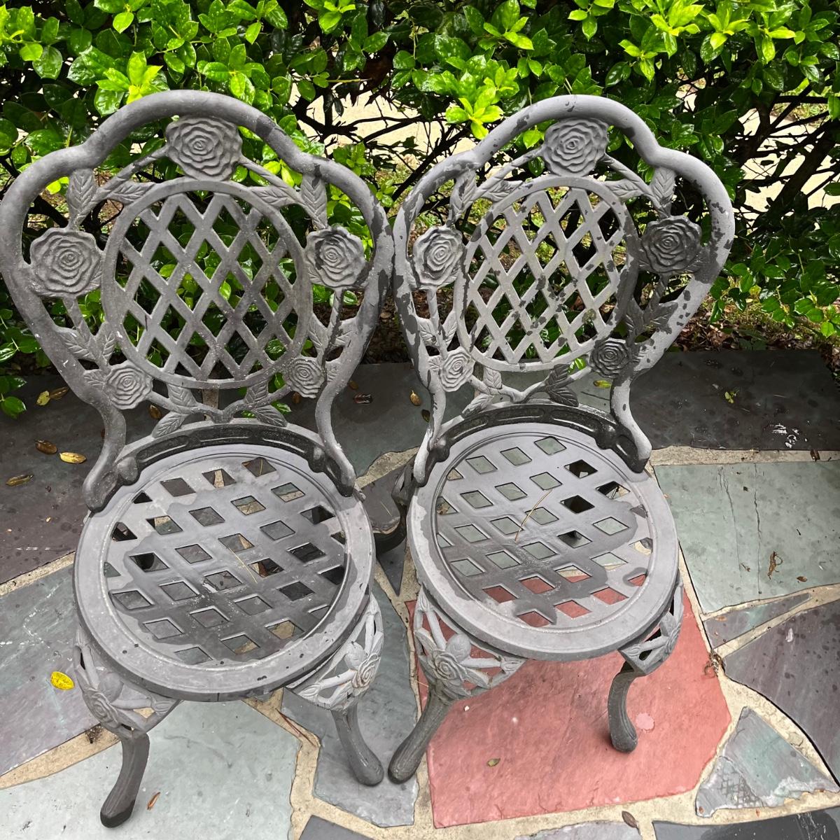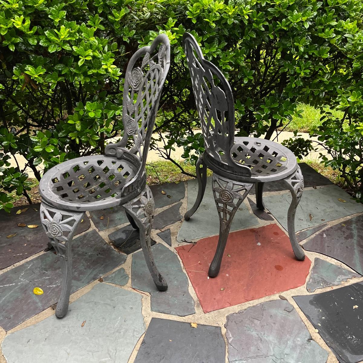 Lot contains a cast iron bistro set that includes two chairs and a table, all with a rose motif. Table measures 24.5”D x 27” tall and chairs measure 17” x 17” x 36” with a 17.5” seat height.