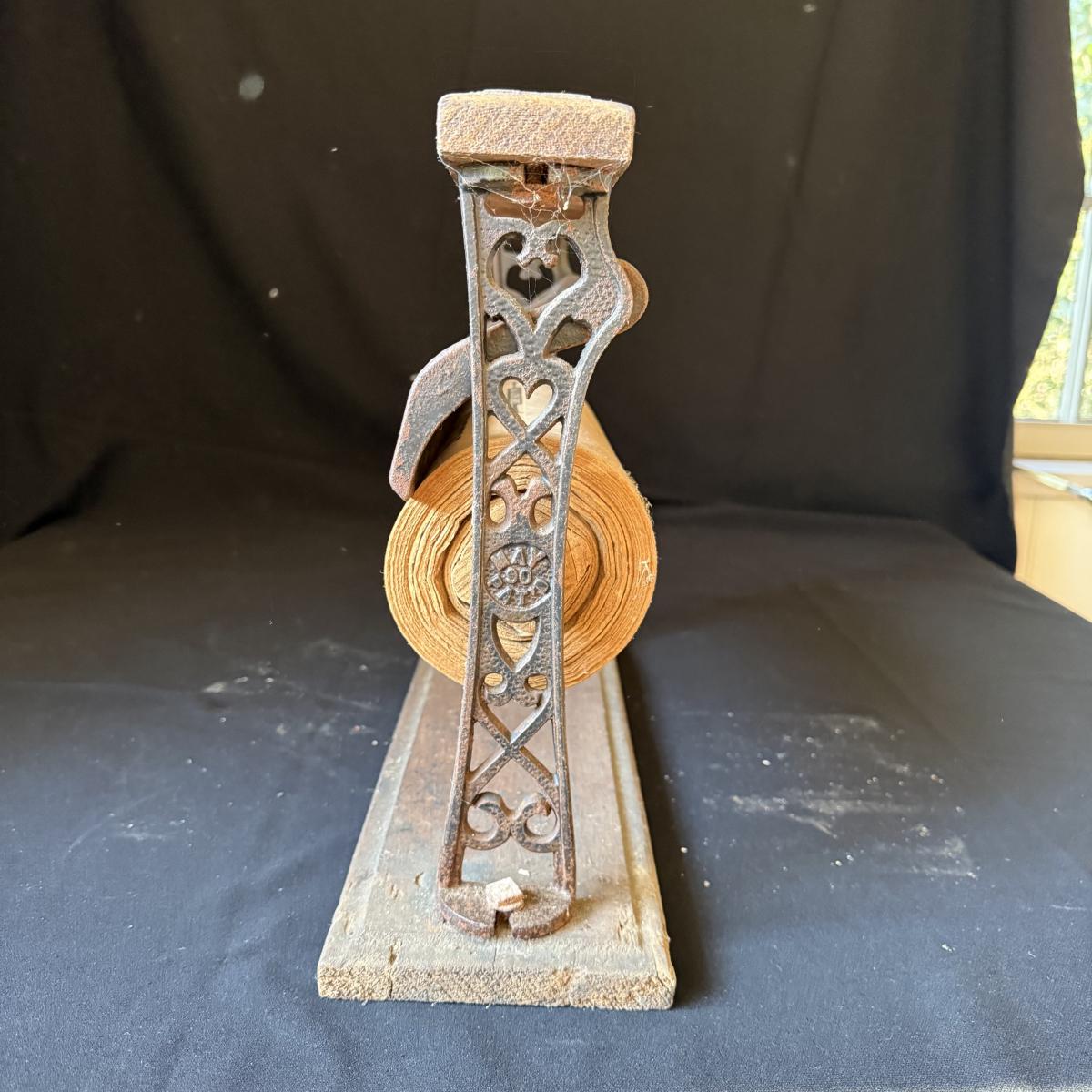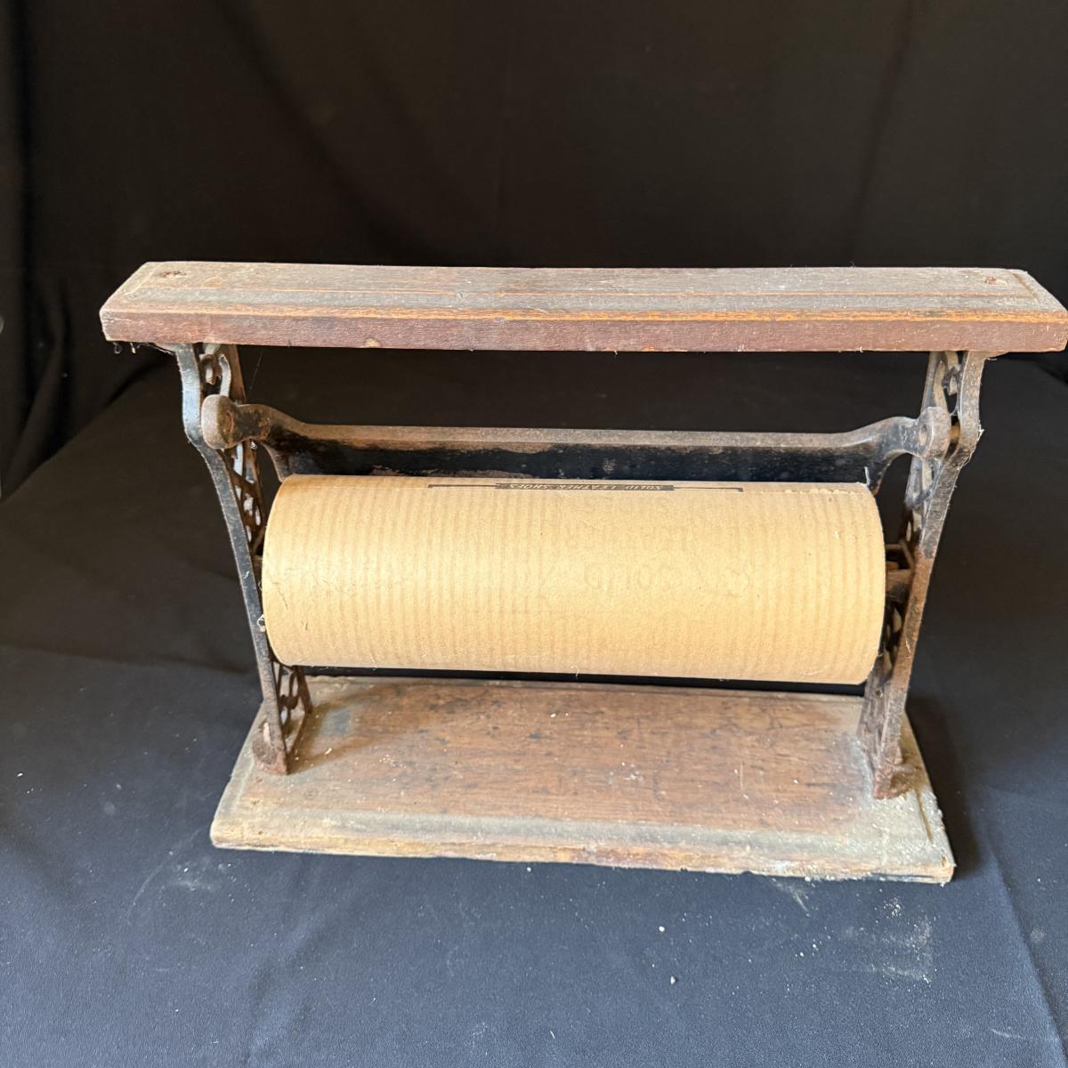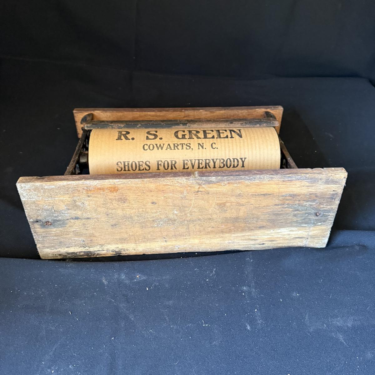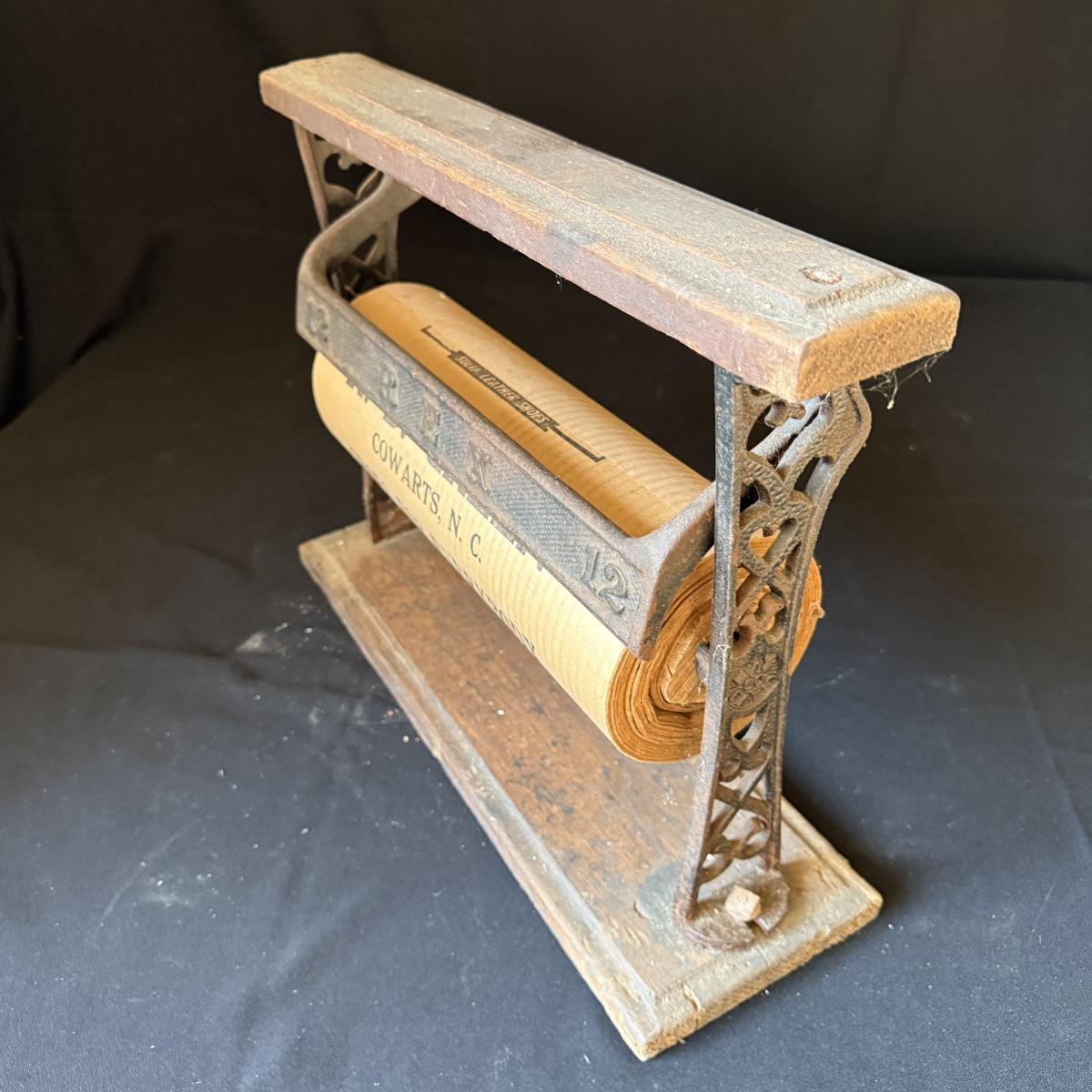 This lot contains a very neat cast iron butcher paper dispenser. The dispenser itself is cast iron with a wood base and top. The cast iron features the words “12 REX” on it and still holds some original butcher or wax paper! The paper reads “R.S. Green Cowarts, NC” and features ads for different products in it. This piece measures 16.5” x 5.5” x 12.5”H. Shipping available.