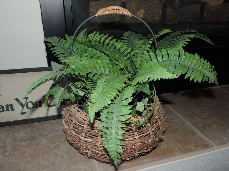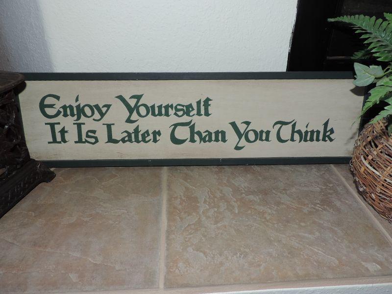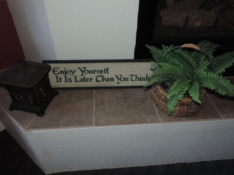 WALL PLAQUE "ENJOY YOURSELF IT IS LATER THEN YOU THINK", FAUX GREENERY IN WICKER BASKET AND CAST IRON CANDLE HOLDER THAT CAN ALSO BE HUNG
