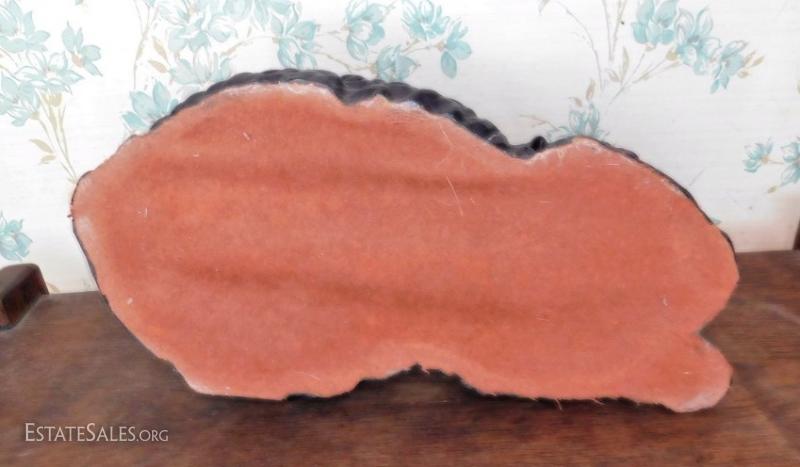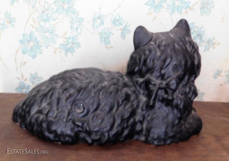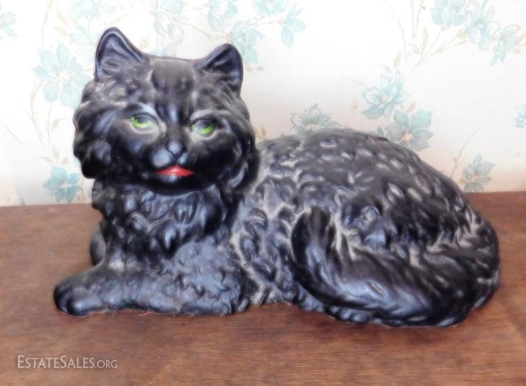 Possible Hubley cast iron cat. Has painted green eyes and red lips. Two flat screws hold the two pieces of nicely molded cast iron. This piece is heavy and is in great condition. We did not remove padding from bottom to see inside for markings. Needs some detailed dusting.